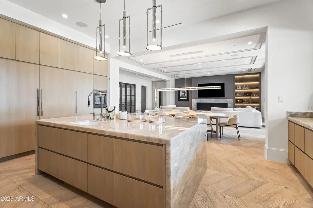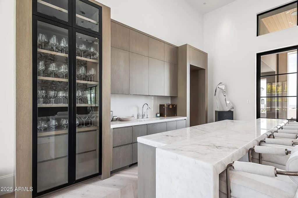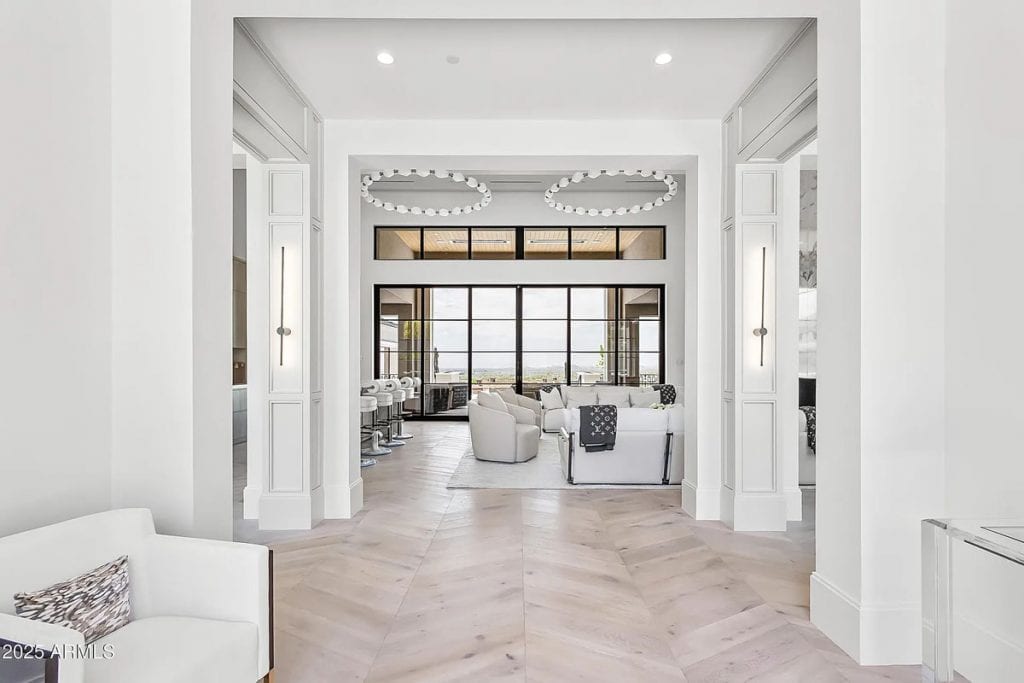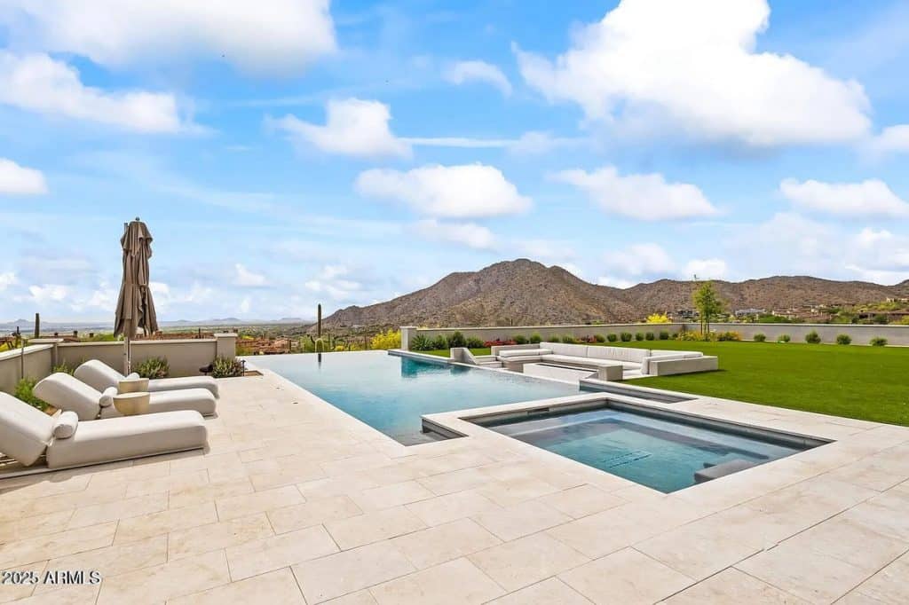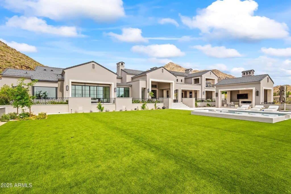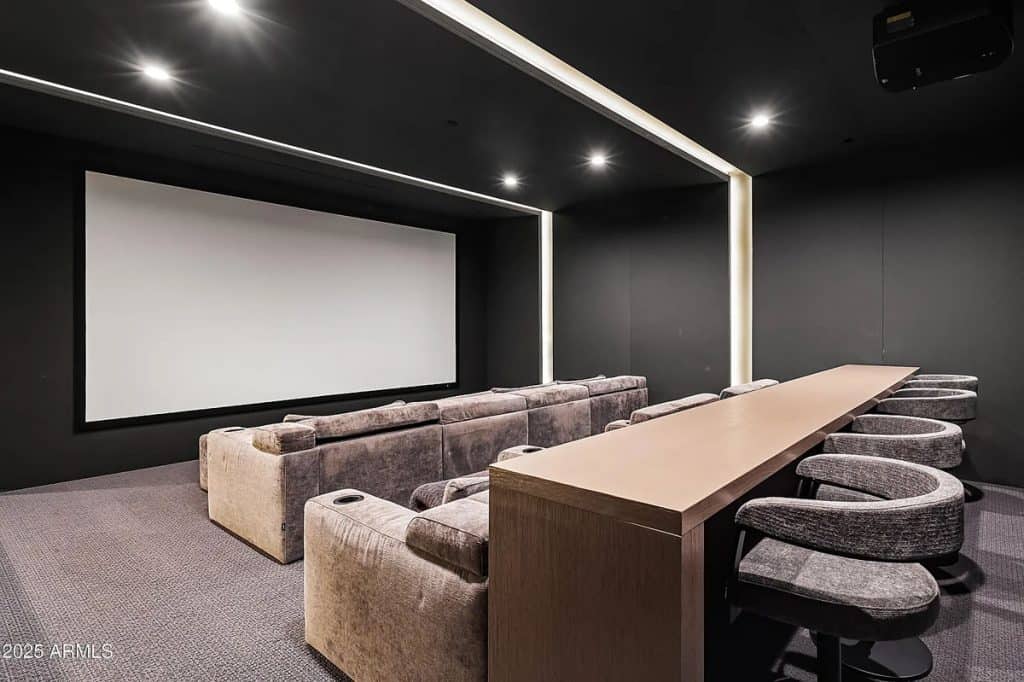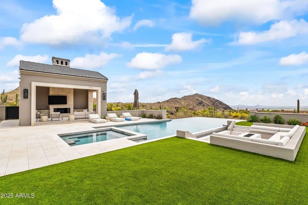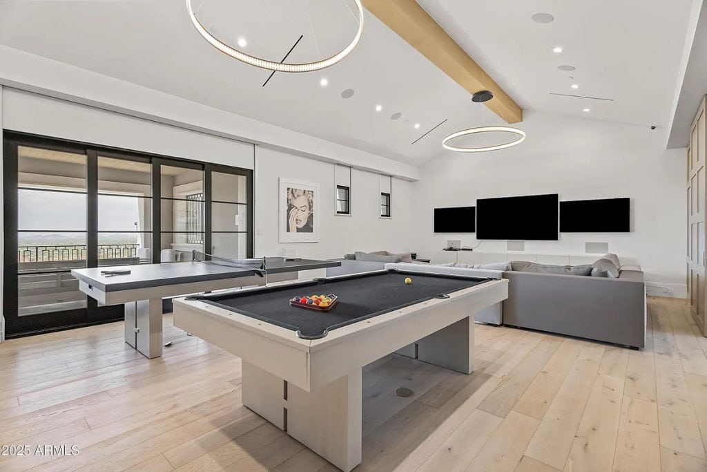 The open-concept kitchen, dining, and living spaces blend effortlessly with Arizona’s renowned indoor/outdoor lifestyle. The chef’s kitchen is complemented by a full back kitchen equipped with multiple ovens. Glass sliding doors lead to a covered porch outfitted with sun screens, misters, heaters, and a built-in BBQ, making it ideal for year-round entertaining and outdoor dining. The luxurious entry floor primary suite is a sanctuary, featuring custom his-and-her closets, an oversized bath & sauna/ cold plunge. and a private backyard patio. Additional spaces include an exercise room, a dedicated theater, an office, and a kids’ rec/game room. The exterior features a resort-style pool and spa, complemented by a pool house bath. A six-car garage offers plenty of space for your collection of vehicles.
