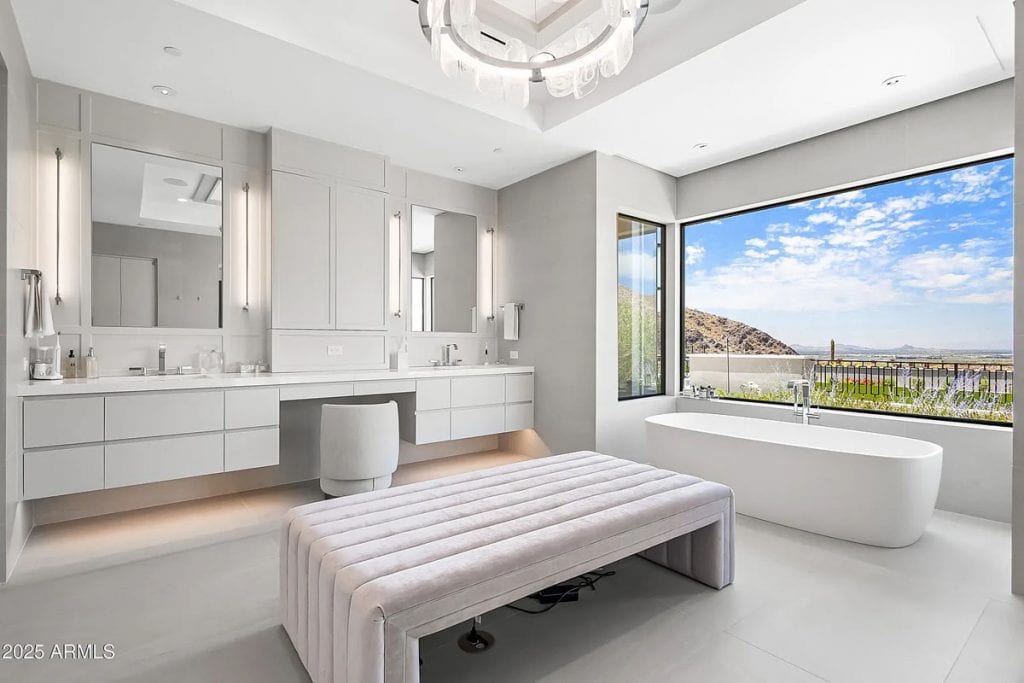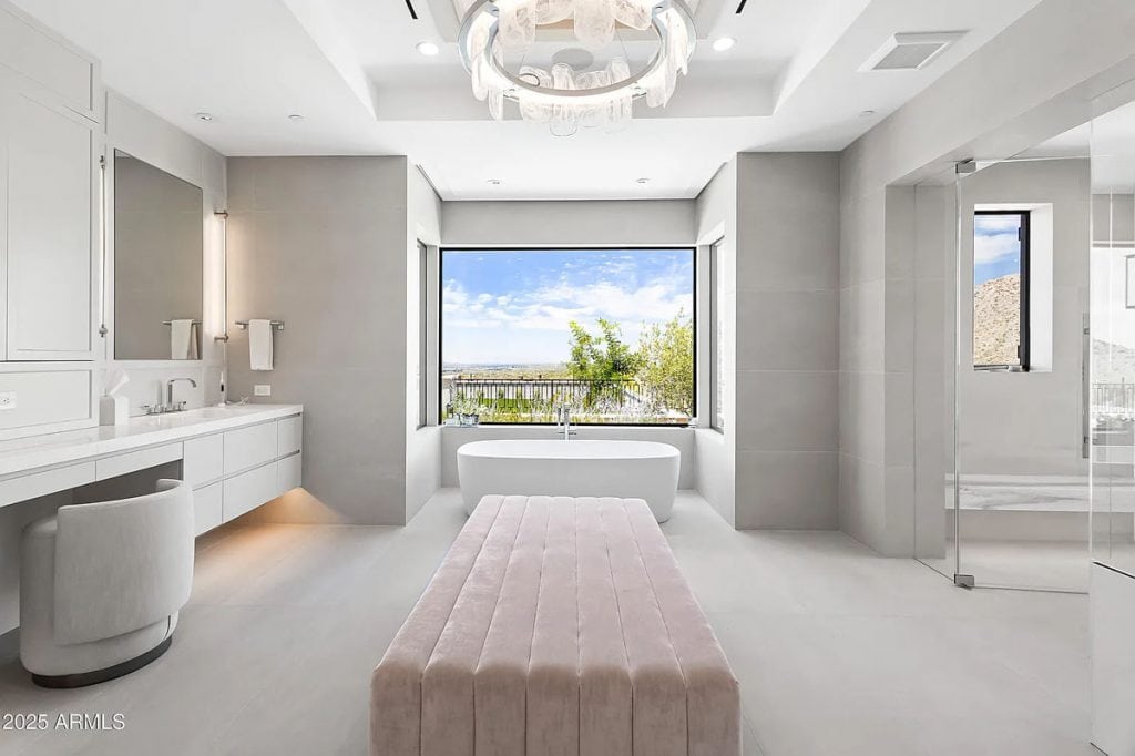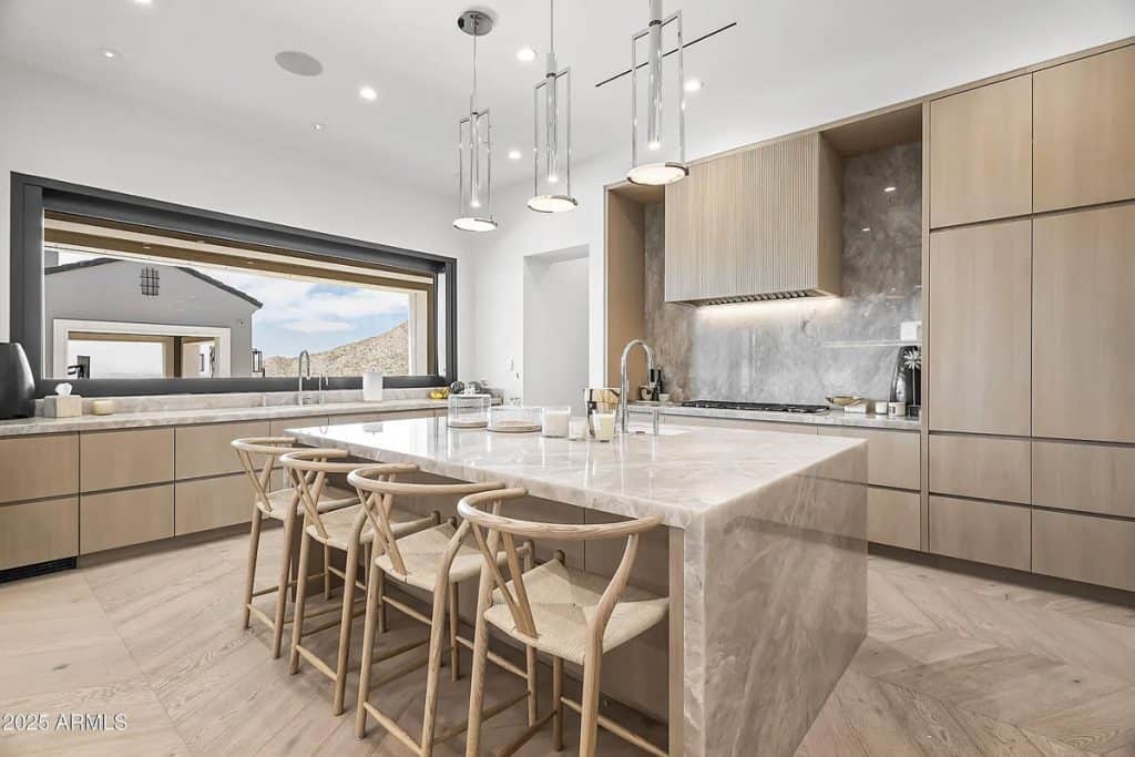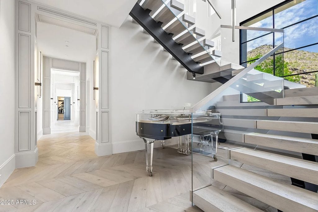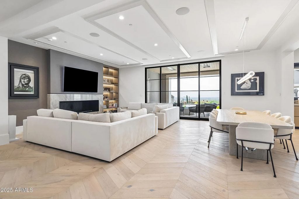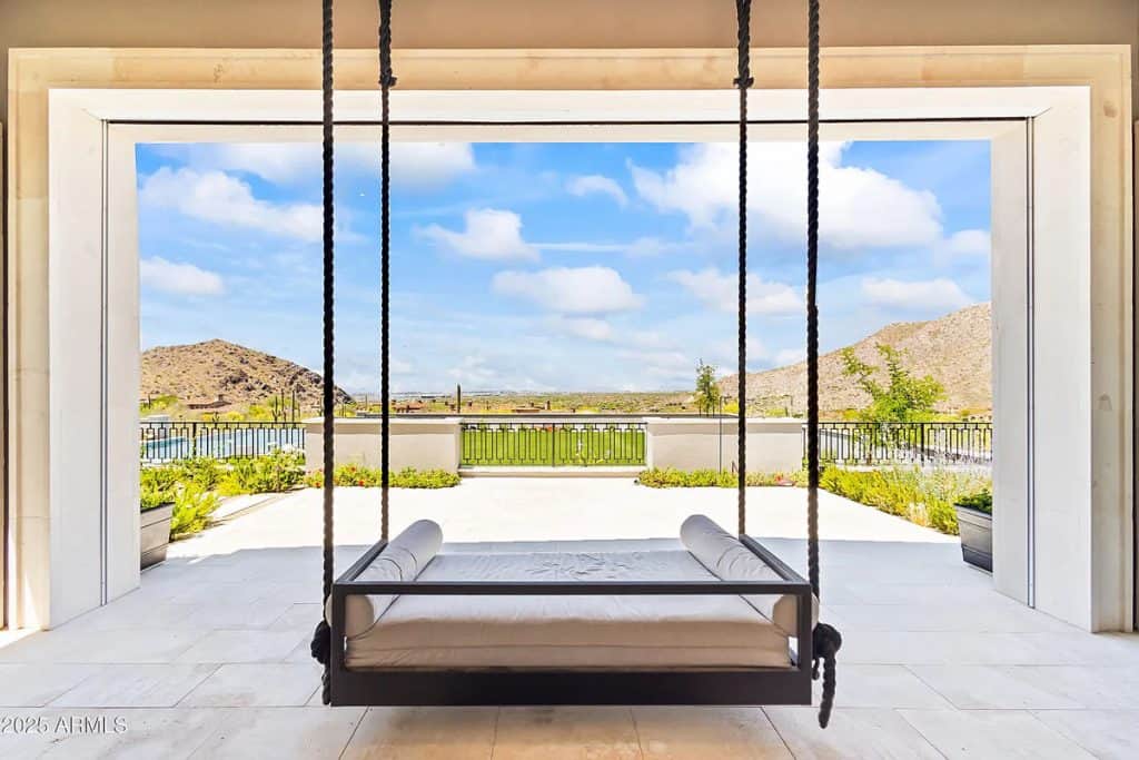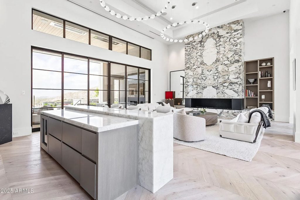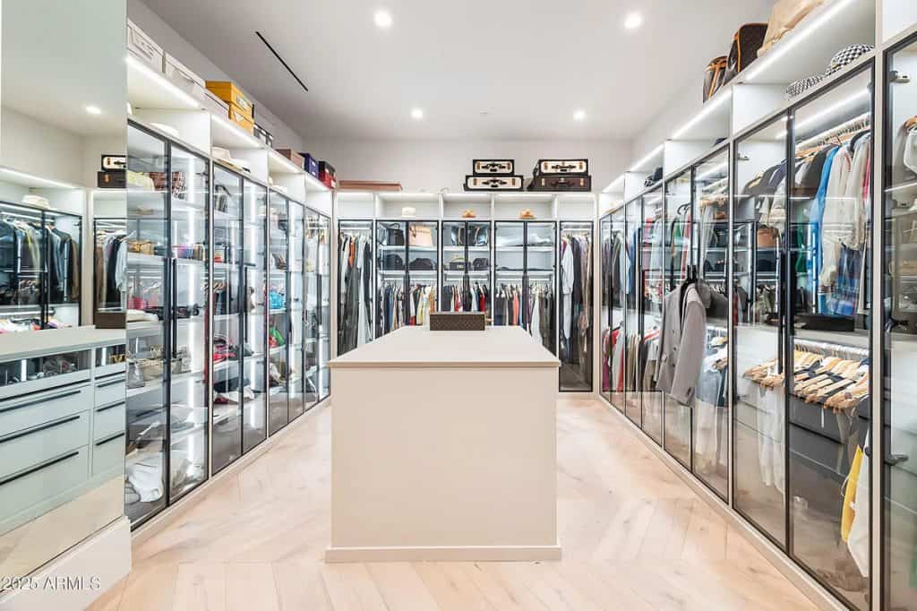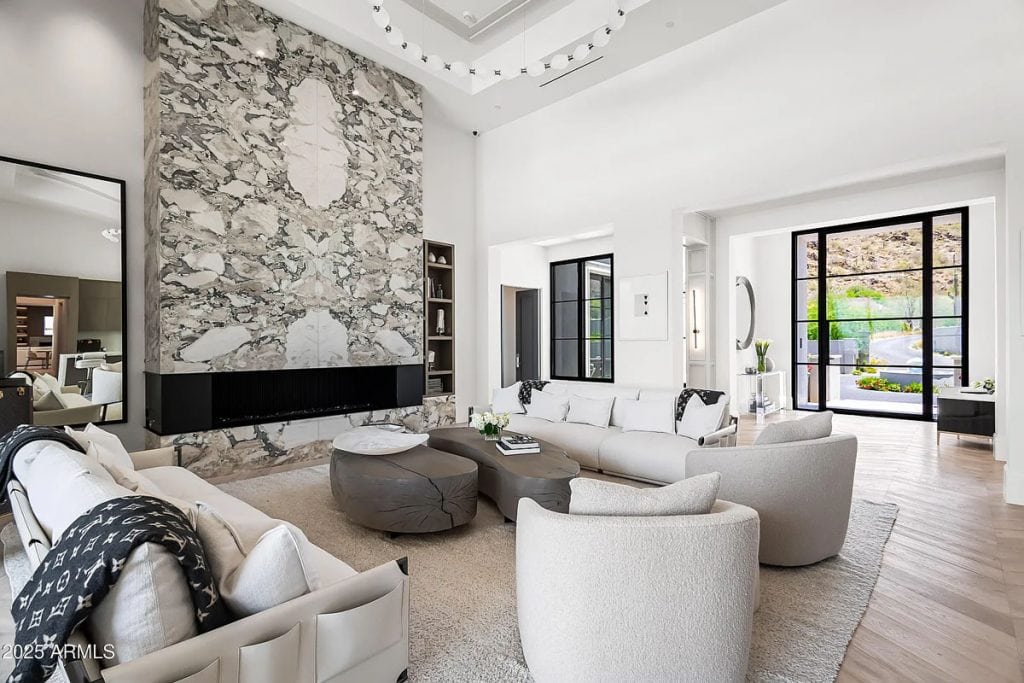 The open-concept kitchen, dining, and living spaces blend effortlessly with Arizona’s renowned indoor/outdoor lifestyle. The chef’s kitchen is complemented by a full back kitchen equipped with multiple ovens. Glass sliding doors lead to a covered porch outfitted with sun screens, misters, heaters, and a built-in BBQ, making it ideal for year-round entertaining and outdoor dining. The luxurious entry floor primary suite is a sanctuary, featuring custom his-and-her closets, an oversized bath & sauna/ cold plunge. and a private backyard patio. Additional spaces include an exercise room, a dedicated theater, an office, and a kids’ rec/game room. The exterior features a resort-style pool and spa, complemented by a pool house bath. A six-car garage offers plenty of space for your collection of vehicles.
