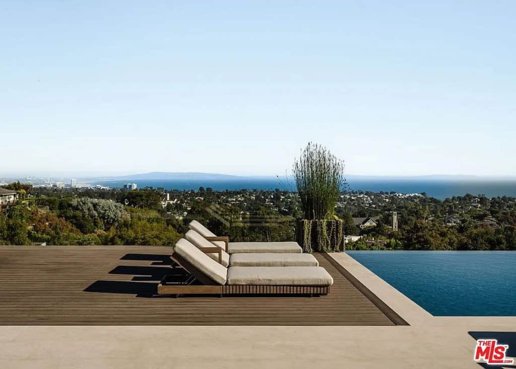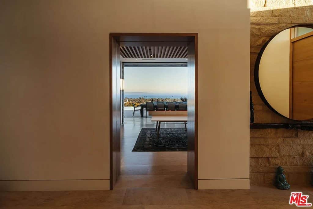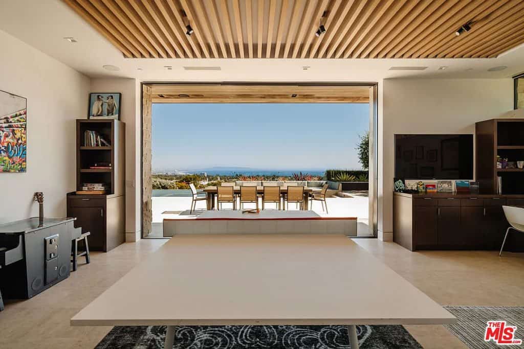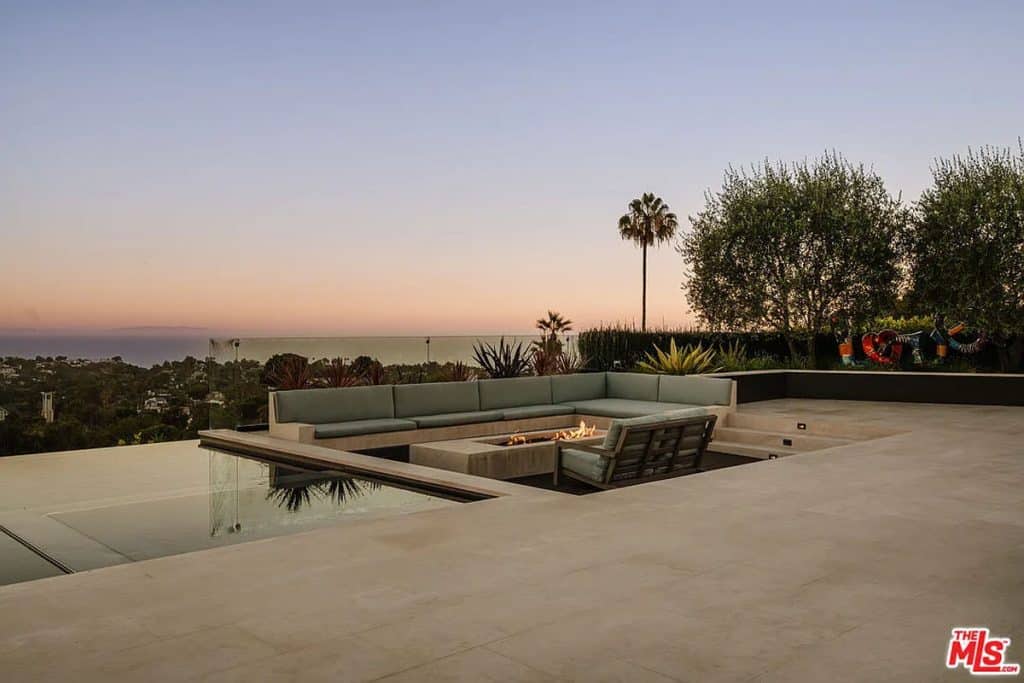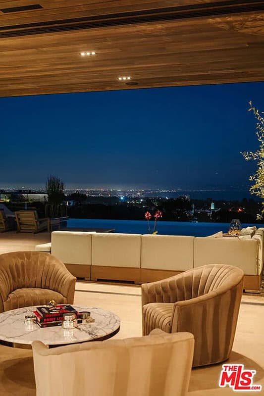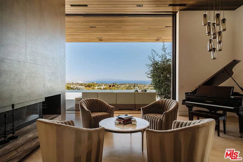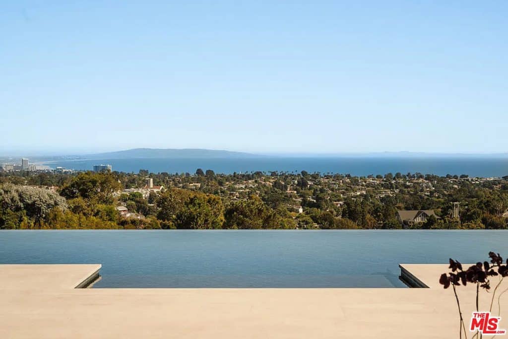 Covering 12,000 square feet on nearly an acre of land, it boasts spectacular views of the ocean, city, and canyons, complemented by a wealth of high-end amenities. The interior is bathed in natural light, blending elegance, sophistication, and practicality with soaring 14-foot ceilings, limestone flooring, and immaculate finishes. Approximately 80 feet of pocket doors slide open to unveil breathtaking ocean and city vistas, perfectly framing the impressive 50-foot infinity-edge pool. The outdoor space is designed for entertaining, complete with an outdoor kitchen, al fresco dining areas, a cozy fire pit lounge, a pizza oven, a pool, and a lush lawn that offers uninterrupted ocean views. The primary suite is a true retreat, featuring a spacious walk-in closet, two fireplaces, and a spa-like bathroom with an oversized shower, heated floors, and a tub that overlooks the ocean. Additional spaces include an office, a movie theater, a game room, and a bar. Other amenities include a pilates studio, a gym, and an indoor basketball court. The estate is equipped with a large three-car garage, plenty of extra parking in the motor court and private driveway.