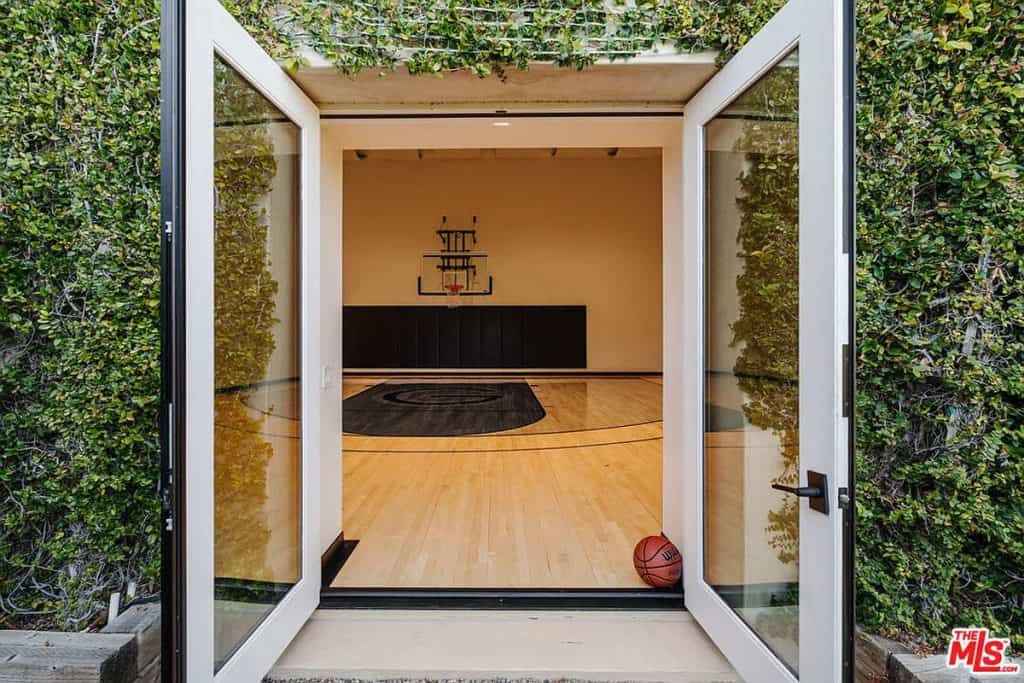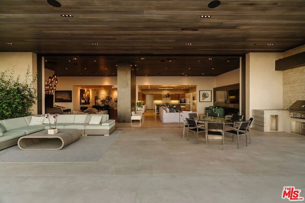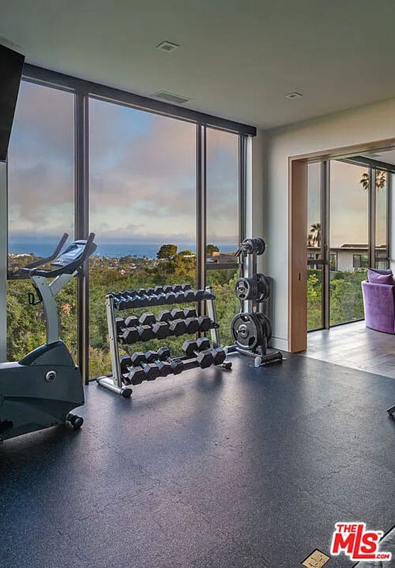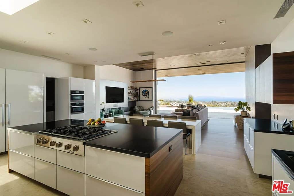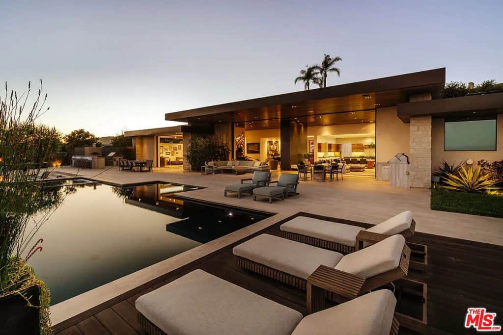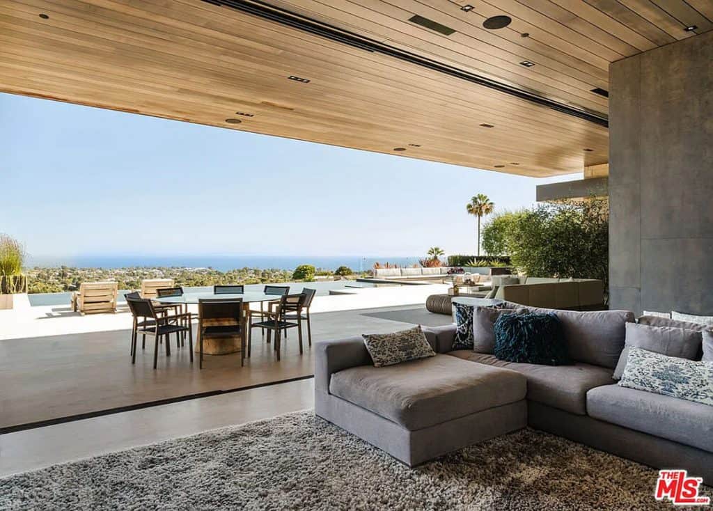 Covering 12,000 square feet on nearly an acre of land, it boasts spectacular views of the ocean, city, and canyons, complemented by a wealth of high-end amenities. The interior is bathed in natural light, blending elegance, sophistication, and practicality with soaring 14-foot ceilings, limestone flooring, and immaculate finishes. Approximately 80 feet of pocket doors slide open to unveil breathtaking ocean and city vistas, perfectly framing the impressive 50-foot infinity-edge pool. The outdoor space is designed for entertaining, complete with an outdoor kitchen, al fresco dining areas, a cozy fire pit lounge, a pizza oven, a pool, and a lush lawn that offers uninterrupted ocean views. The primary suite is a true retreat, featuring a spacious walk-in closet, two fireplaces, and a spa-like bathroom with an oversized shower, heated floors, and a tub that overlooks the ocean. Additional spaces include an office, a movie theater, a game room, and a bar. Other amenities include a pilates studio, a gym, and an indoor basketball court. The estate is equipped with a large three-car garage, plenty of extra parking in the motor court and private driveway.