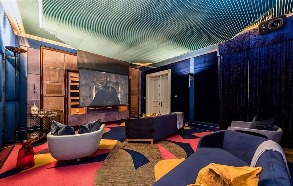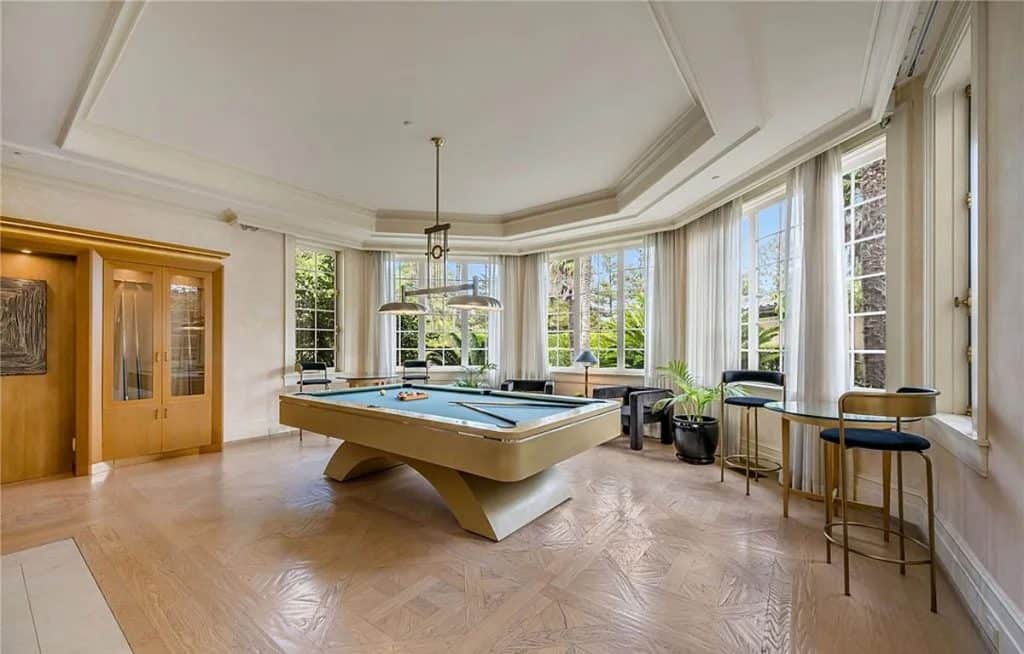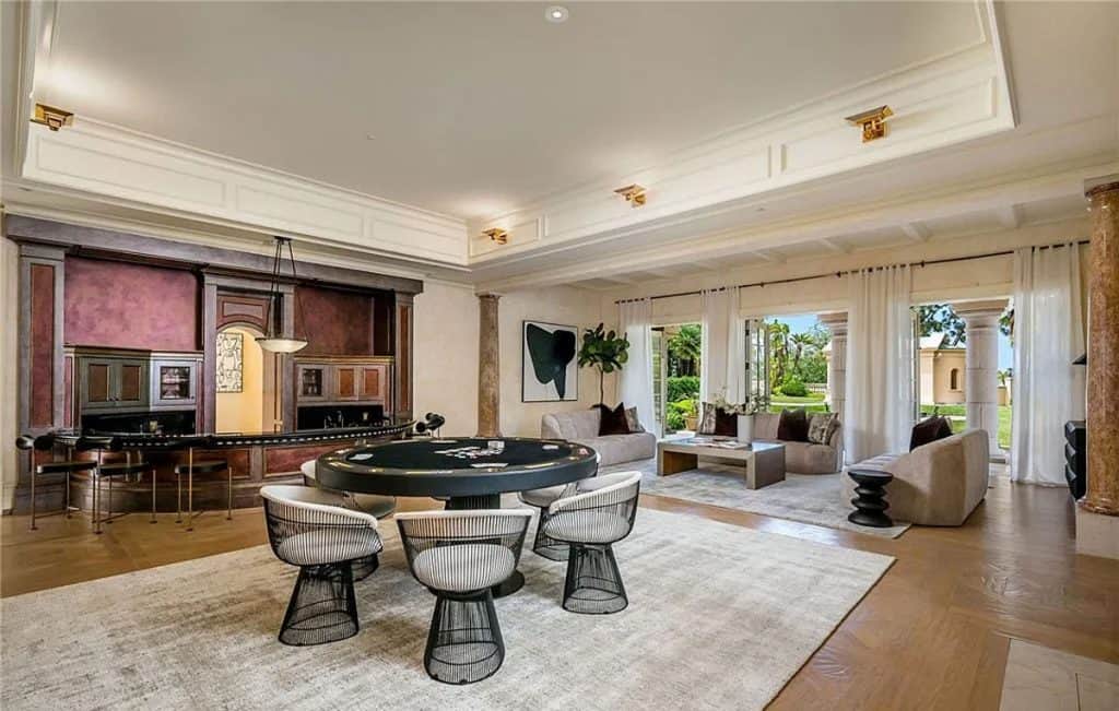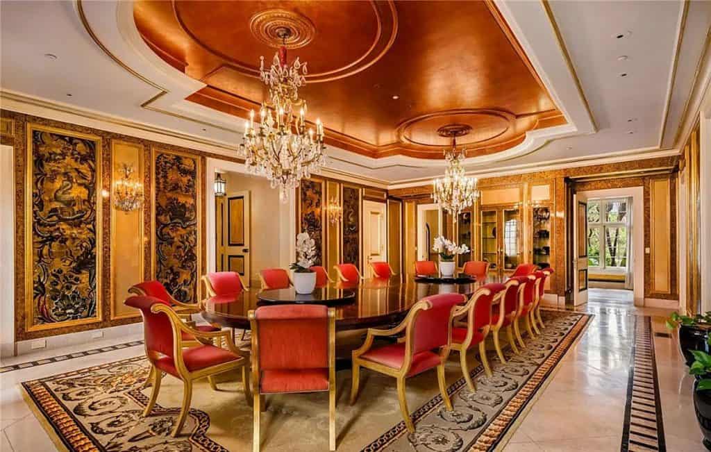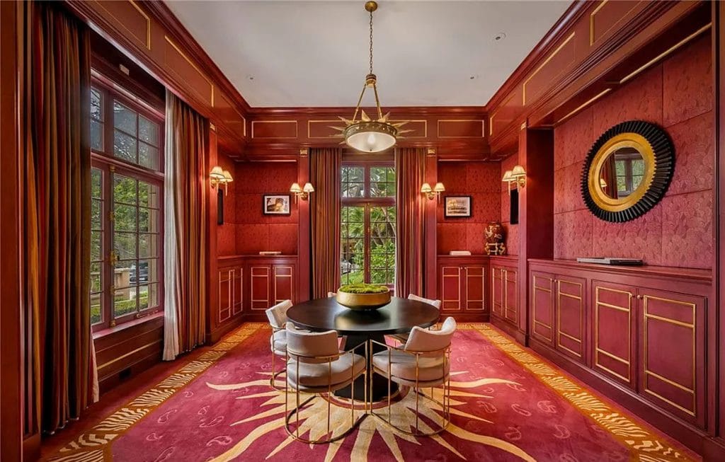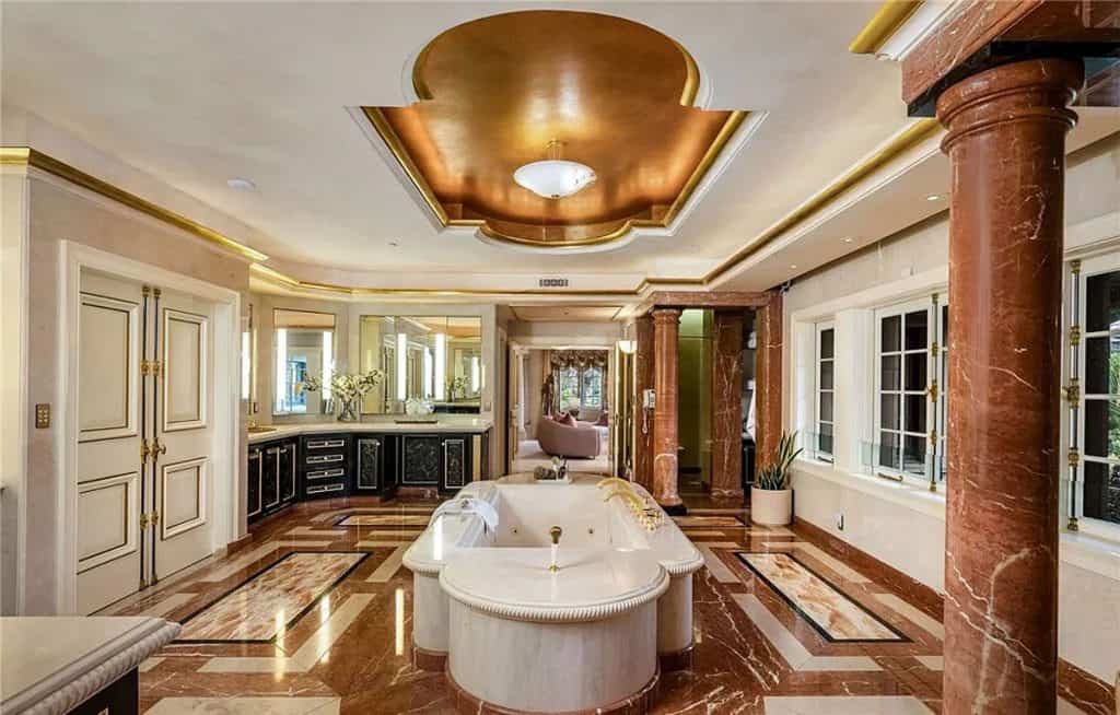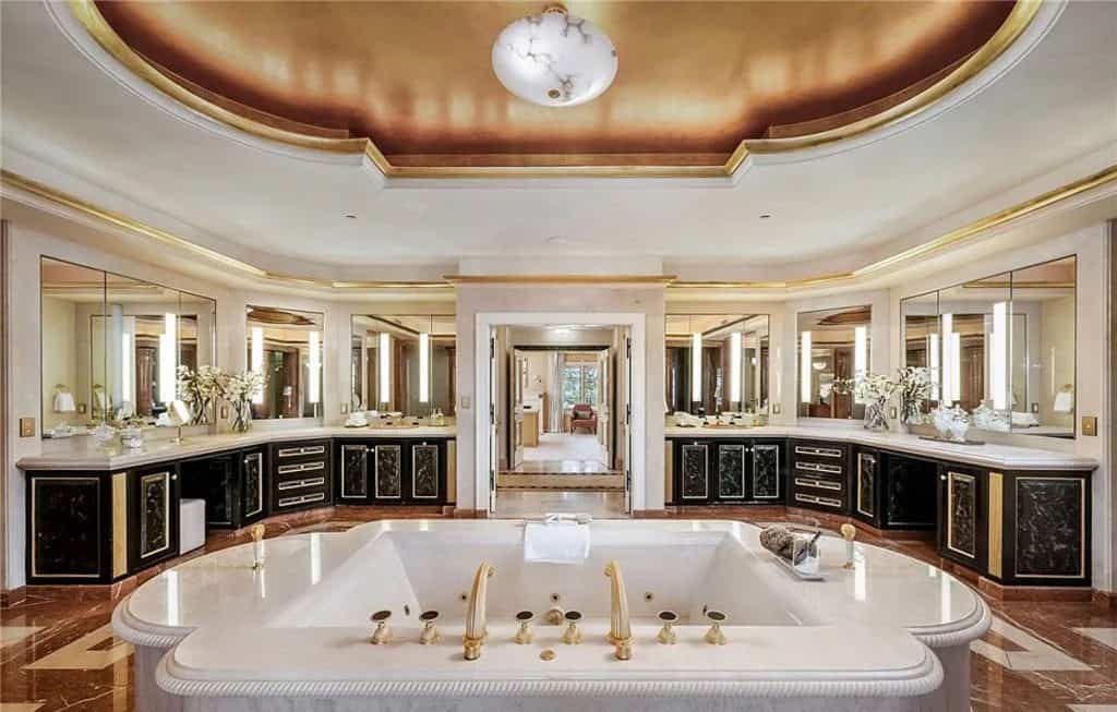 The main suite, featuring a fireplace, epitomizes luxury with its two sitting areas, a drink station, a lounge room equipped with a corner desk, and separate private offices for him and her. It also boasts an extravagant spa bath that includes a large marble soaking tub, dual vanities and sinks, a sauna, a steam shower, and a workout space, along with five walk-in closet rooms. In addition to a rec room featuring a sunken bar, a lounge area, and a nearby movie theater, the basement level boasts luxurious amenities such as a two-lane bowling alley, a dojo, a gym, and an upscale nightclub complete with bar seating and a sound-equipped DJ booth. Along with lavish grounds that boast a koi pond, several entertaining spaces, a resort-style swimming pool, and a tennis court.