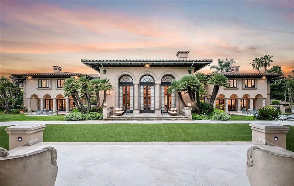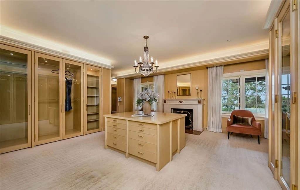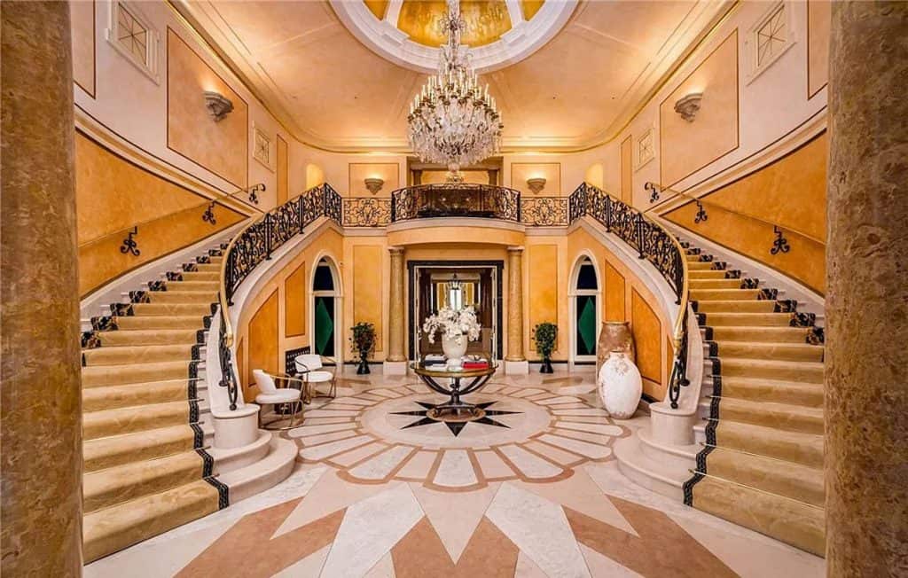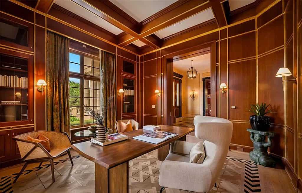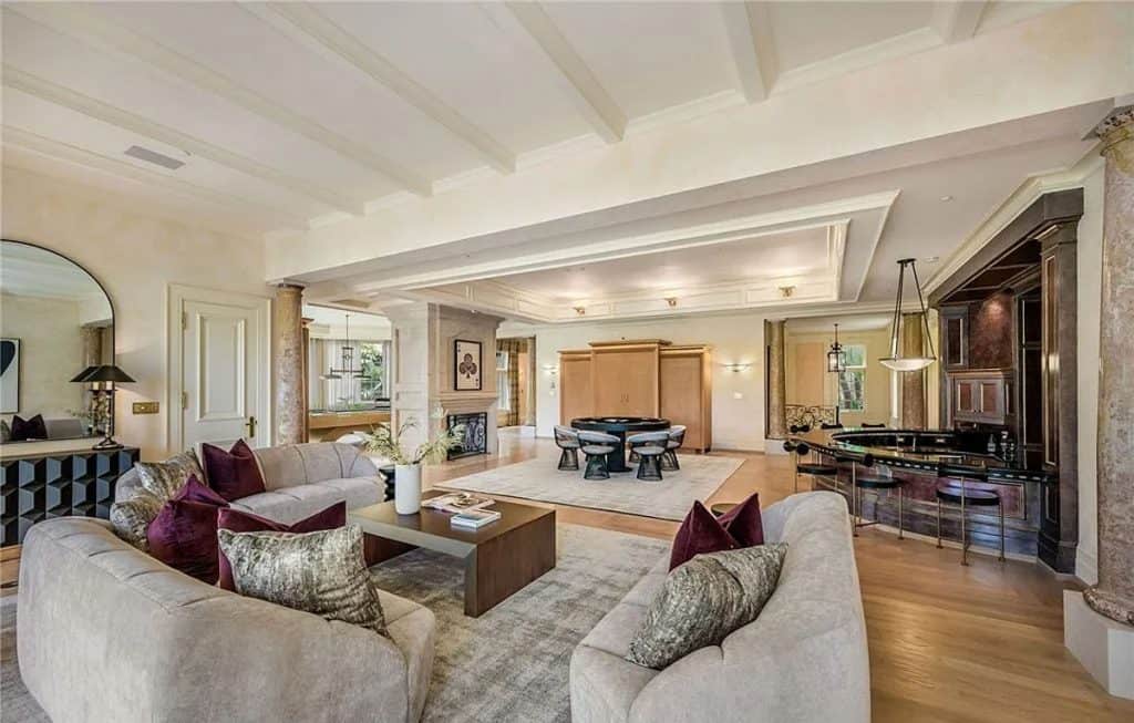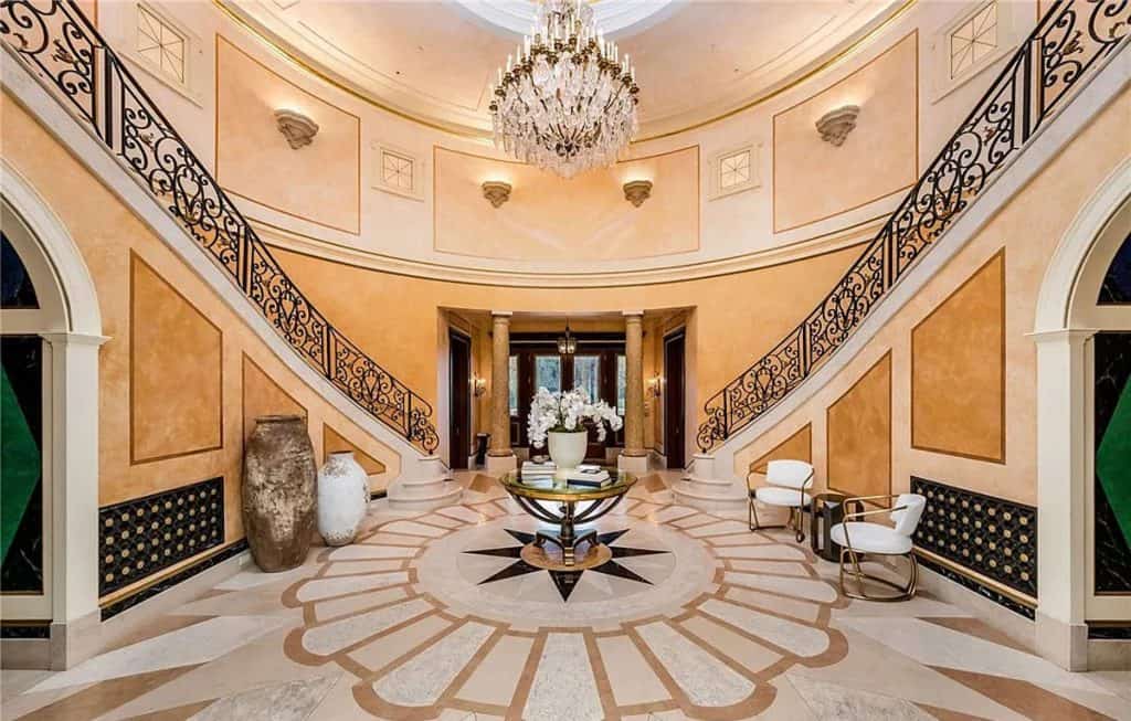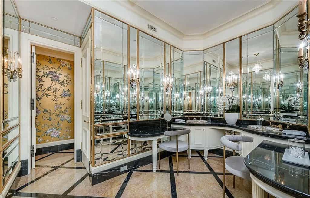 The main suite, featuring a fireplace, epitomizes luxury with its two sitting areas, a drink station, a lounge room equipped with a corner desk, and separate private offices for him and her. It also boasts an extravagant spa bath that includes a large marble soaking tub, dual vanities and sinks, a sauna, a steam shower, and a workout space, along with five walk-in closet rooms. In addition to a rec room featuring a sunken bar, a lounge area, and a nearby movie theater, the basement level boasts luxurious amenities such as a two-lane bowling alley, a dojo, a gym, and an upscale nightclub complete with bar seating and a sound-equipped DJ booth. Along with lavish grounds that boast a koi pond, several entertaining spaces, a resort-style swimming pool, and a tennis court.
