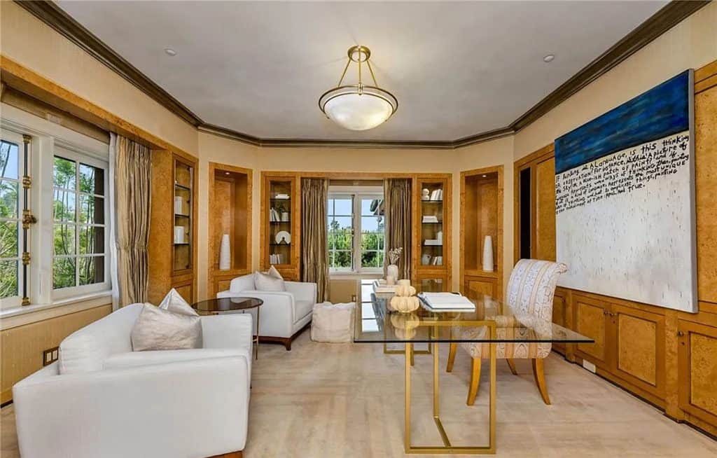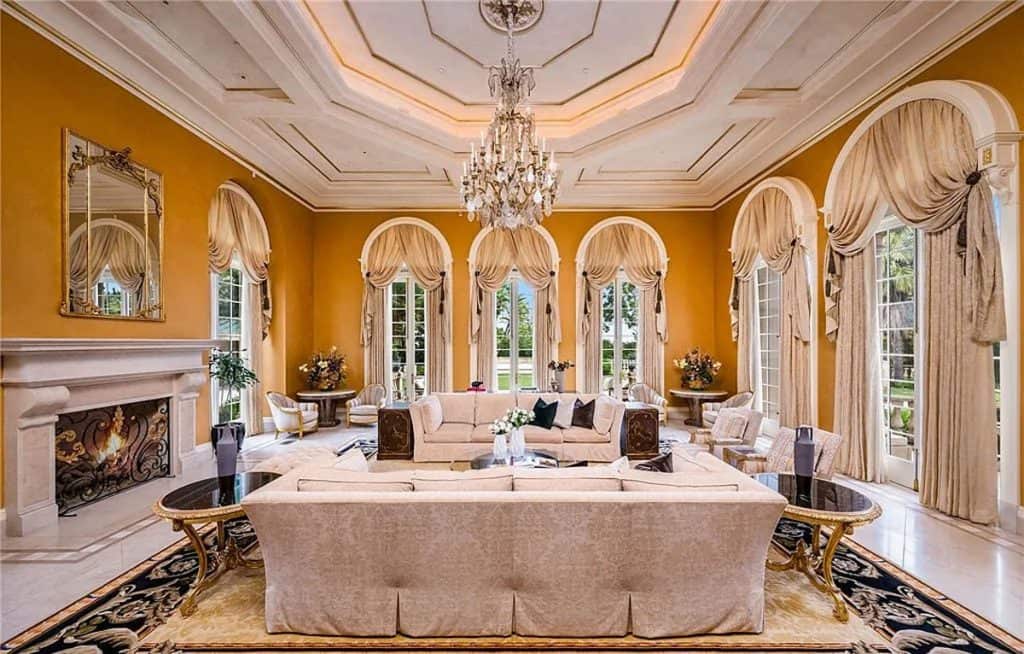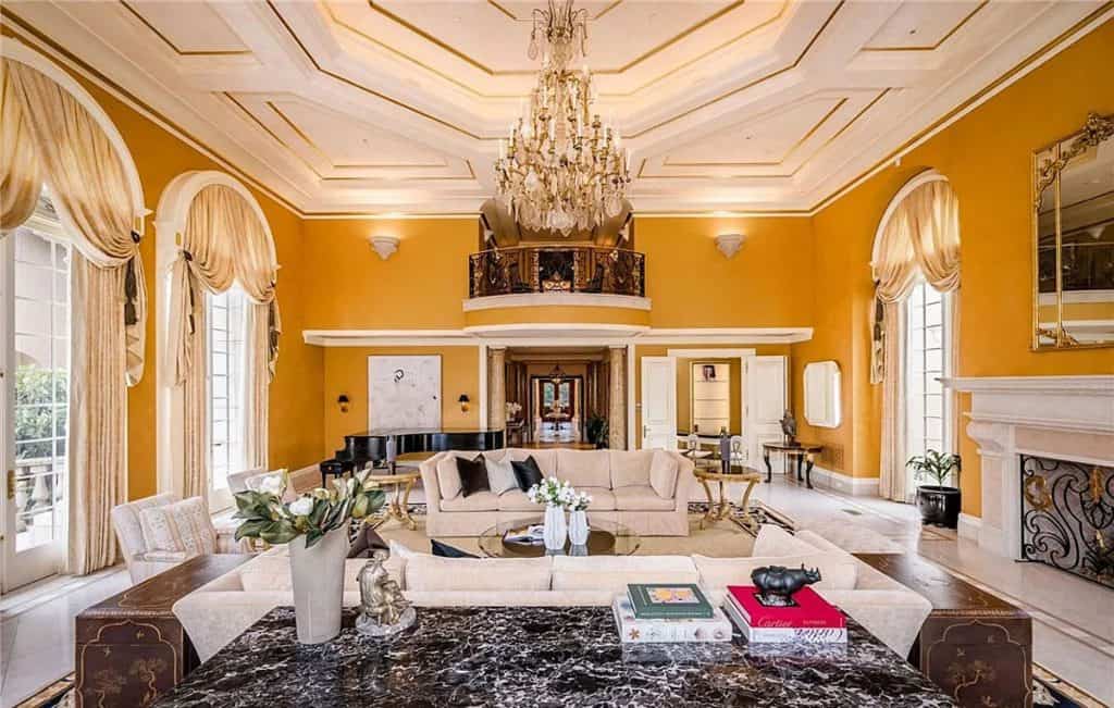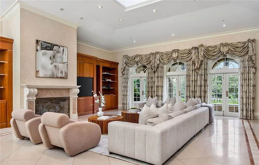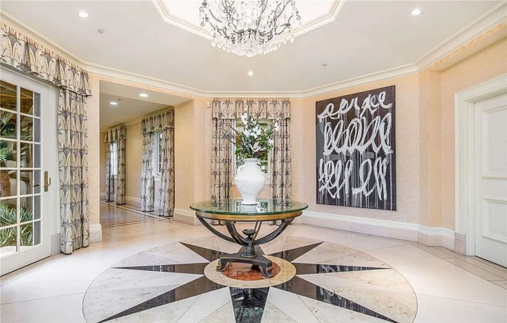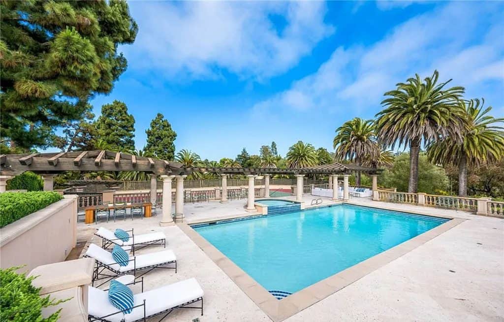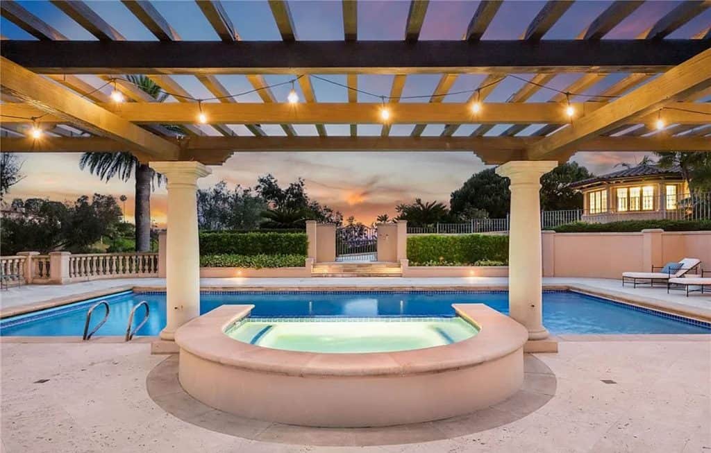 The main suite, featuring a fireplace, epitomizes luxury with its two sitting areas, a drink station, a lounge room equipped with a corner desk, and separate private offices for him and her. It also boasts an extravagant spa bath that includes a large marble soaking tub, dual vanities and sinks, a sauna, a steam shower, and a workout space, along with five walk-in closet rooms. In addition to a rec room featuring a sunken bar, a lounge area, and a nearby movie theater, the basement level boasts luxurious amenities such as a two-lane bowling alley, a dojo, a gym, and an upscale nightclub complete with bar seating and a sound-equipped DJ booth. Along with lavish grounds that boast a koi pond, several entertaining spaces, a resort-style swimming pool, and a tennis court.