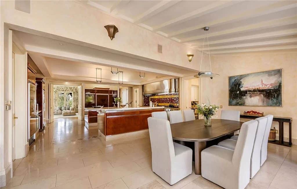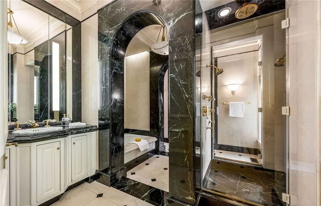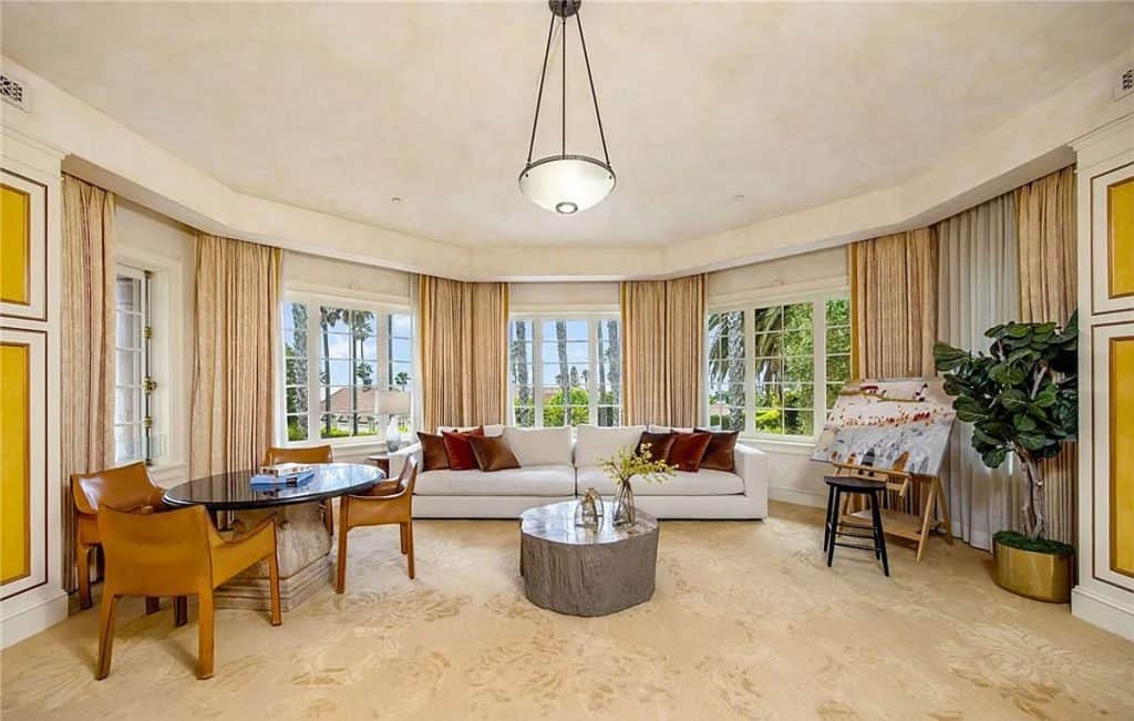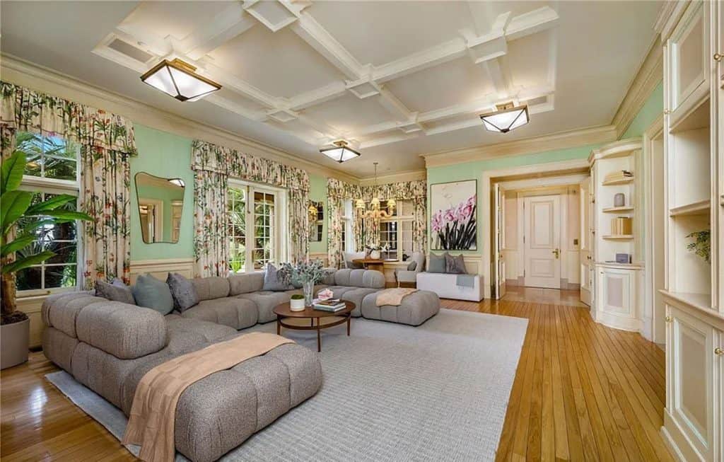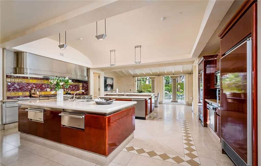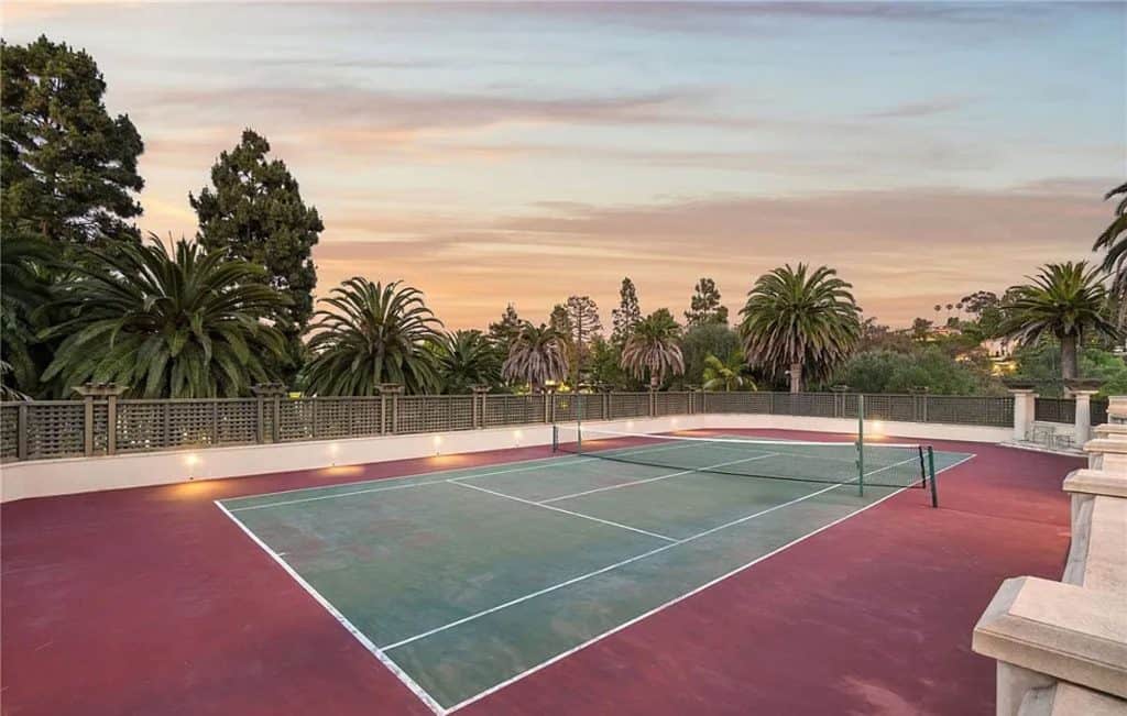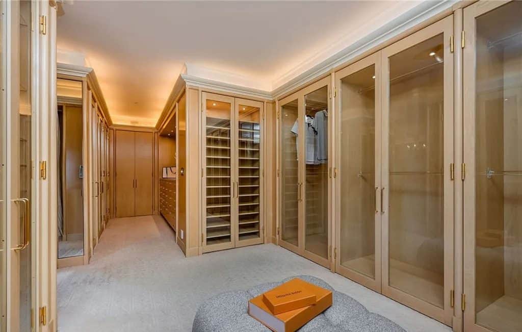 The main suite, featuring a fireplace, epitomizes luxury with its two sitting areas, a drink station, a lounge room equipped with a corner desk, and separate private offices for him and her. It also boasts an extravagant spa bath that includes a large marble soaking tub, dual vanities and sinks, a sauna, a steam shower, and a workout space, along with five walk-in closet rooms. In addition to a rec room featuring a sunken bar, a lounge area, and a nearby movie theater, the basement level boasts luxurious amenities such as a two-lane bowling alley, a dojo, a gym, and an upscale nightclub complete with bar seating and a sound-equipped DJ booth. Along with lavish grounds that boast a koi pond, several entertaining spaces, a resort-style swimming pool, and a tennis court.