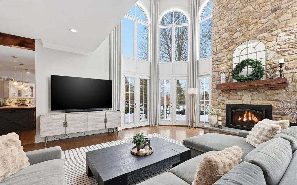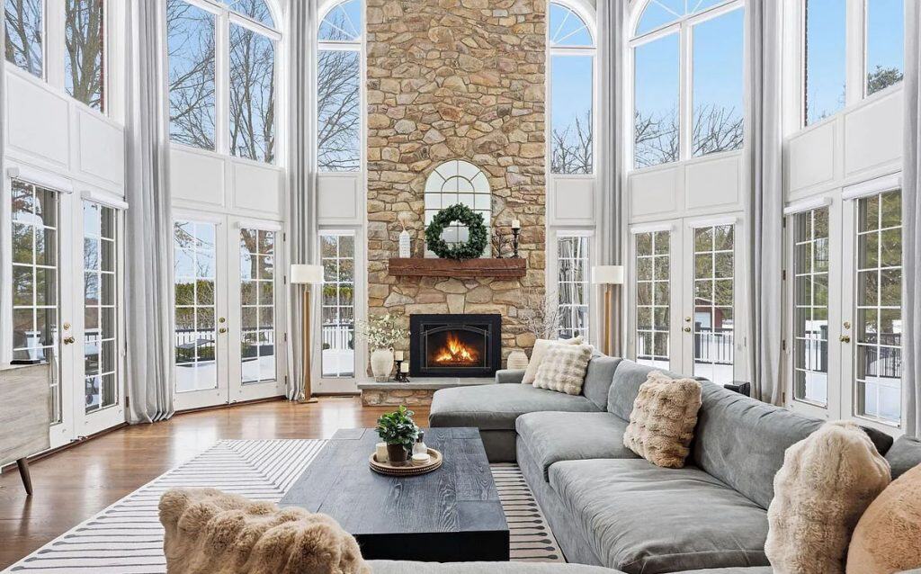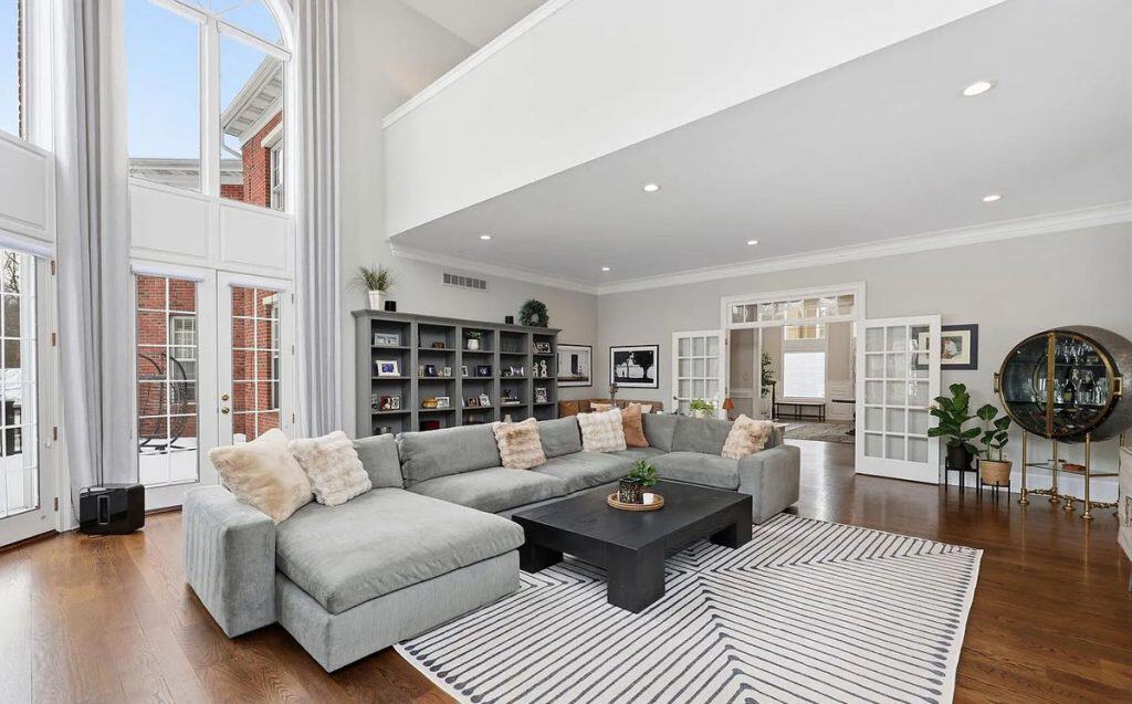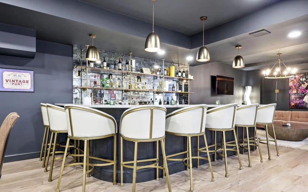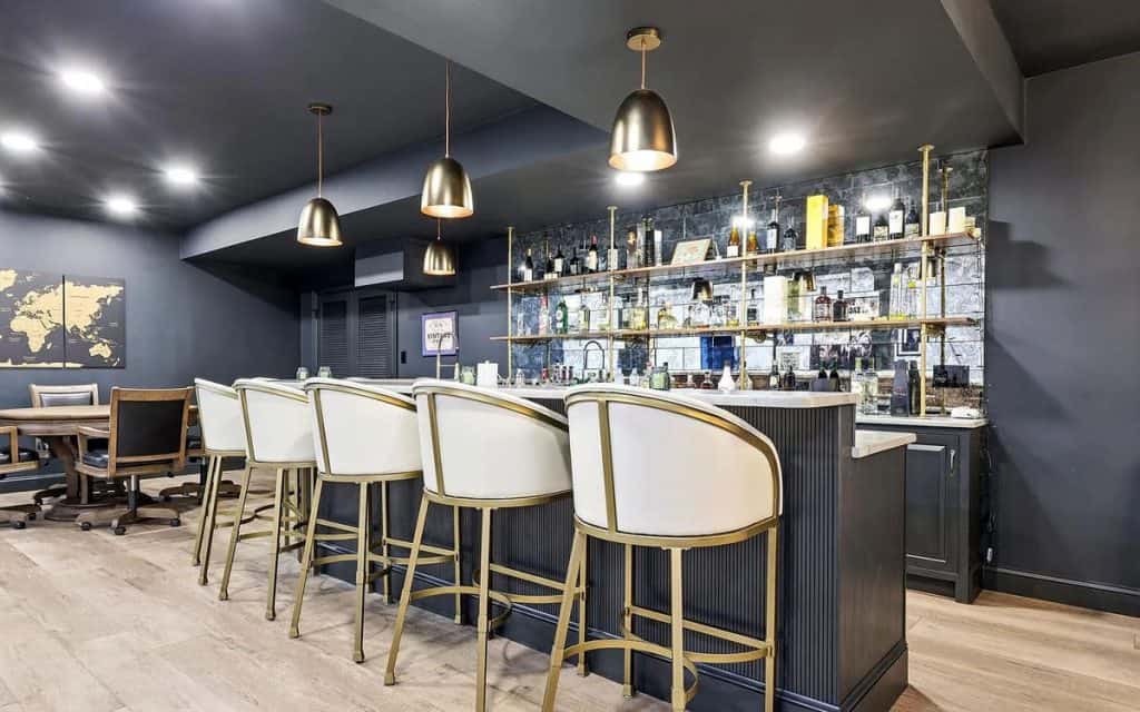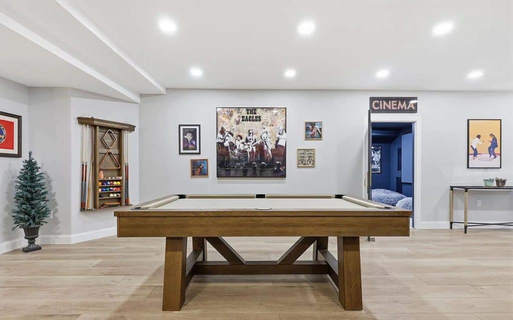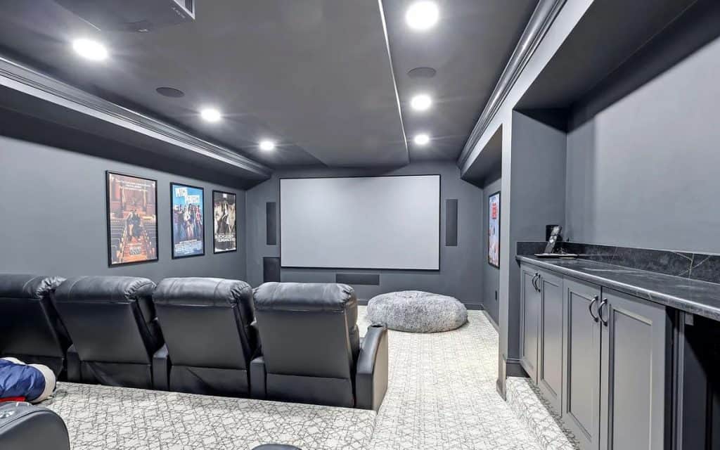 Inside, a dramatic two-story foyer with detailed millwork is framed by twin butterfly staircases, opening to a soaring great room beyond. The chef’s kitchen is equipped with a professional Viking range, Sub-Zero refrigeration with wine storage, and a built-in Miele coffee system. A dedicated wellness space completes the upper level, featuring a serene spa room with a sauna and two extra-deep whirlpool tubs with inline heaters, designed for both relaxation and cold plunge therapy. The walk-out lower level functions as a private club, enhanced by full Lutron smart lighting integration. This level includes an eight-seat speakeasy-style bar, a state-of-the-art theater with reclining leather seating, and an athletic wing with a basketball area finished in professional maple flooring alongside a glass-enclosed fitness center.