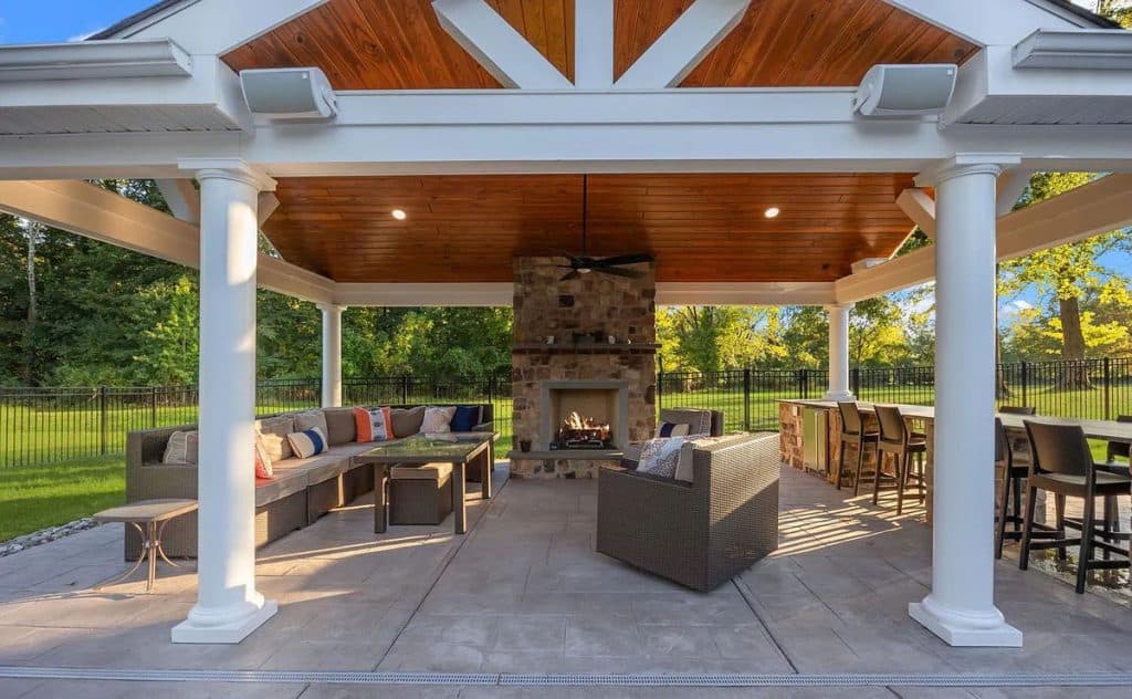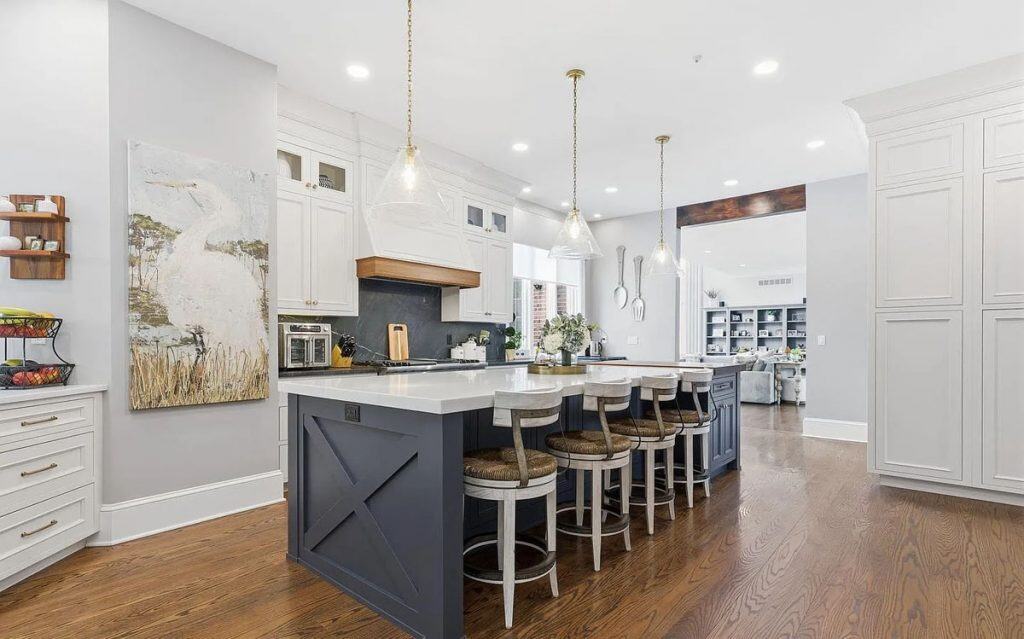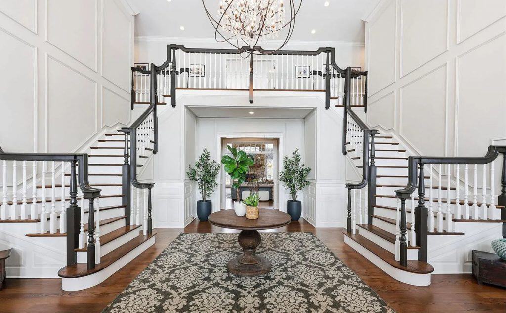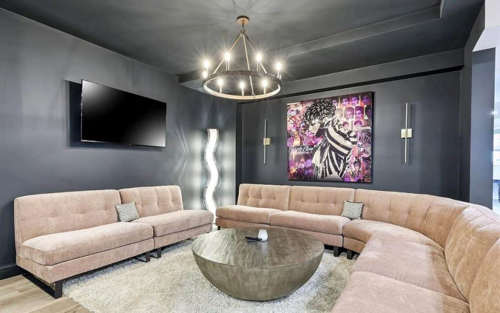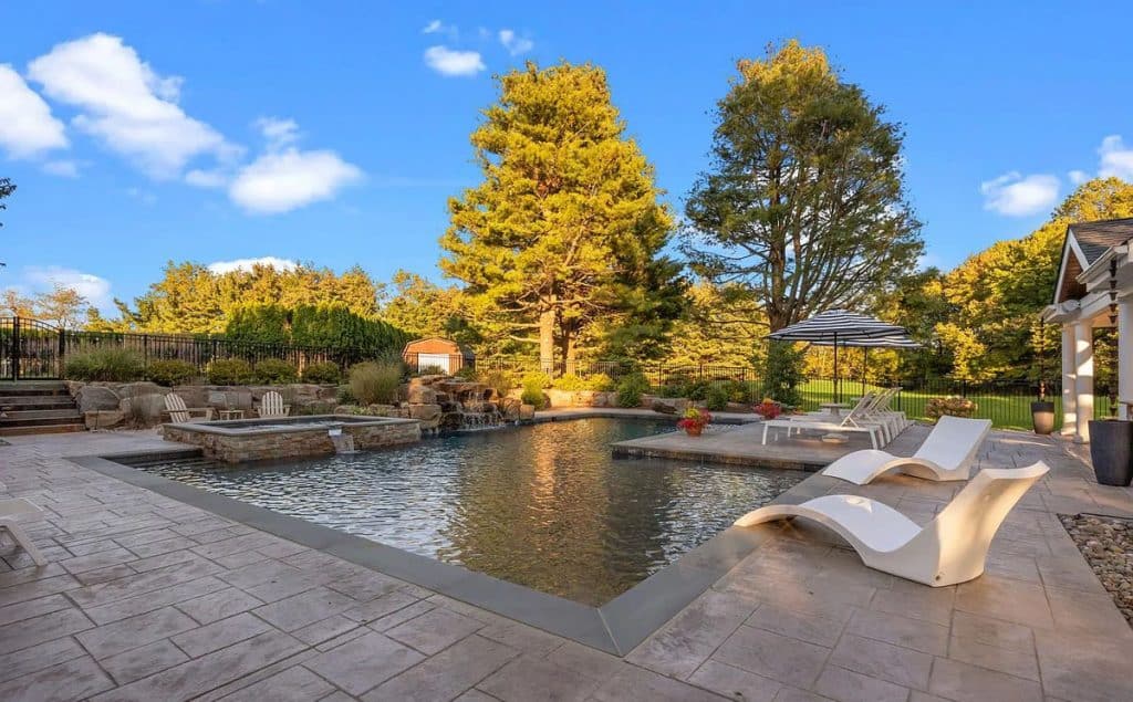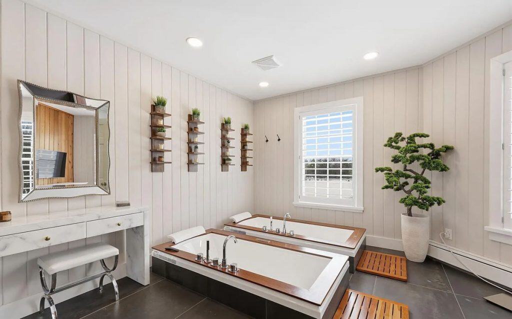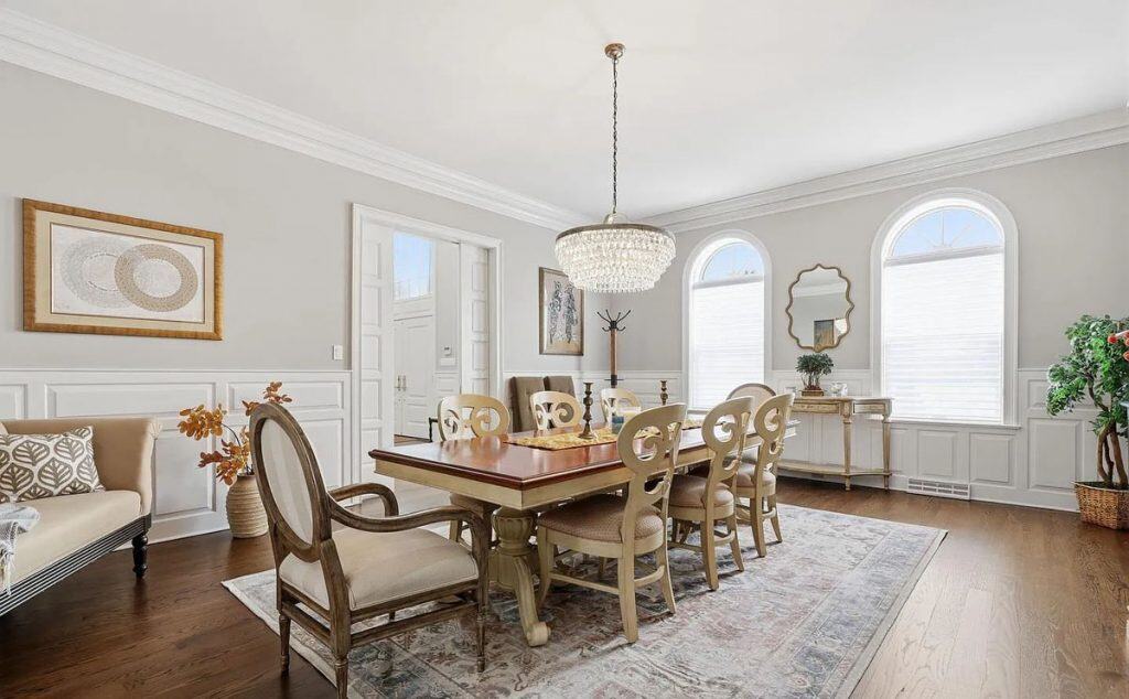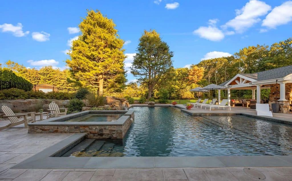 Inside, a dramatic two-story foyer with detailed millwork is framed by twin butterfly staircases, opening to a soaring great room beyond. The chef’s kitchen is equipped with a professional Viking range, Sub-Zero refrigeration with wine storage, and a built-in Miele coffee system. A dedicated wellness space completes the upper level, featuring a serene spa room with a sauna and two extra-deep whirlpool tubs with inline heaters, designed for both relaxation and cold plunge therapy. The walk-out lower level functions as a private club, enhanced by full Lutron smart lighting integration. This level includes an eight-seat speakeasy-style bar, a state-of-the-art theater with reclining leather seating, and an athletic wing with a basketball area finished in professional maple flooring alongside a glass-enclosed fitness center.