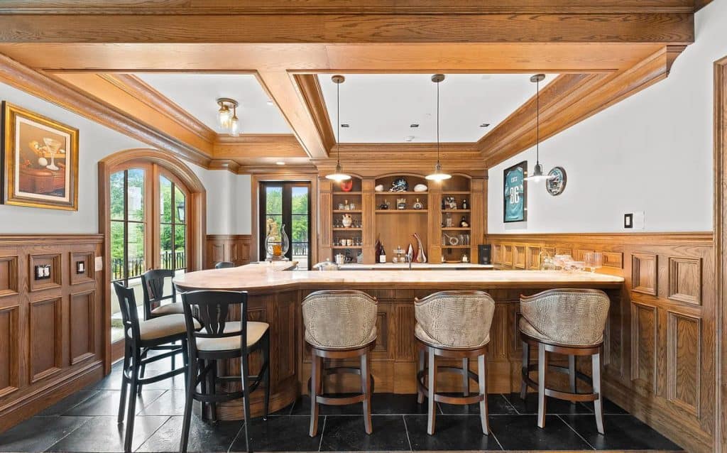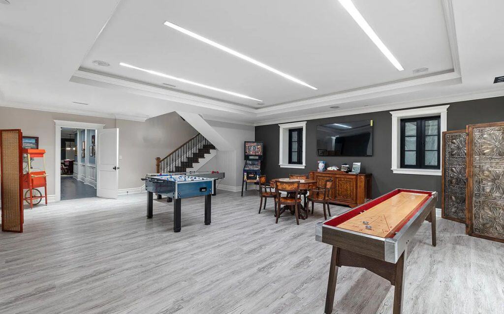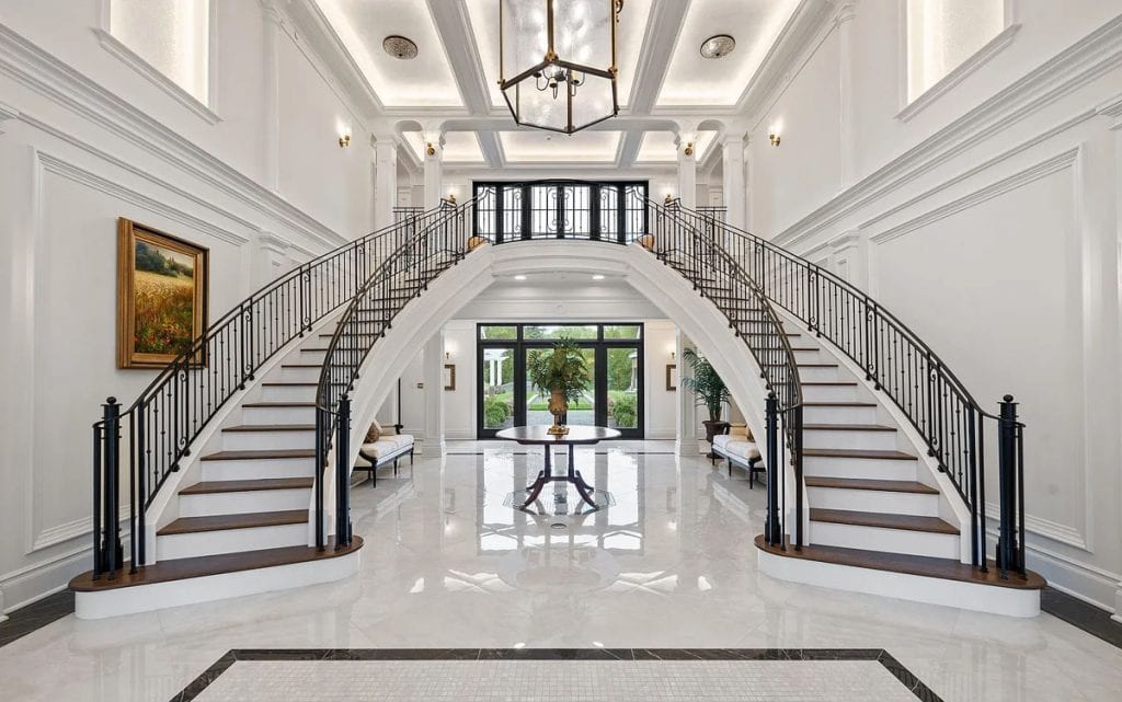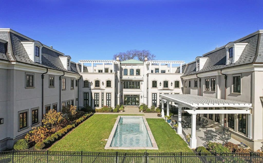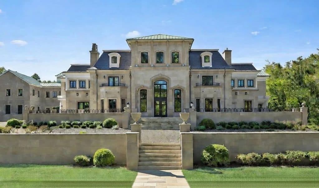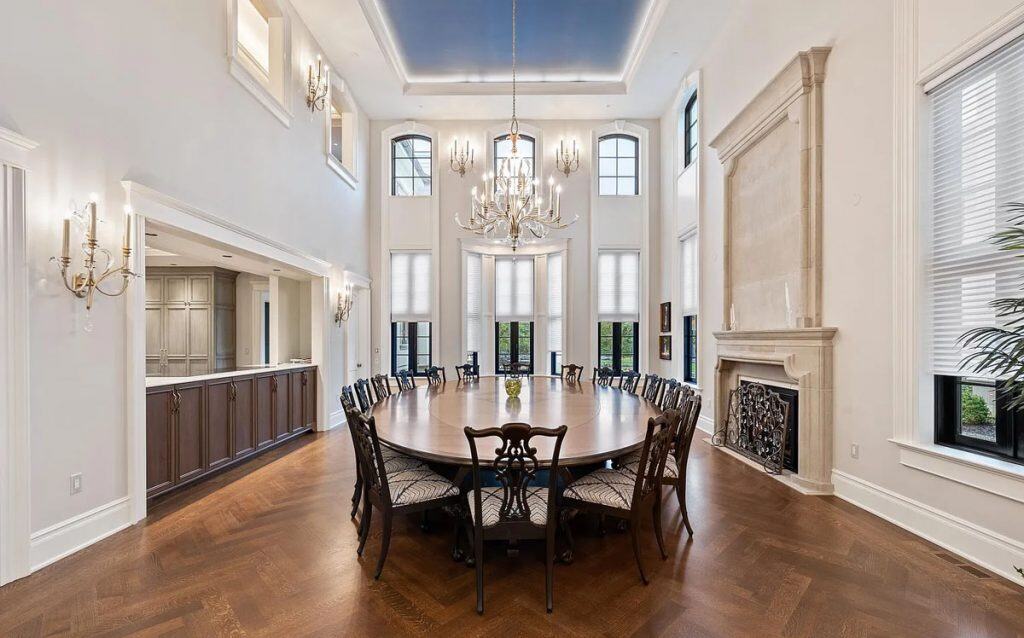 As you enter through the glass doors into the marble foyer, topped with a coffered pearl ceiling, your gaze is instantly captivated by the expansive views of the reflecting pond, the enchanting forest, and the elegance of the dual staircases. The soaring height in the music room reveals hidden gems and opens up a realm of entertainment possibilities. Wrapped in walnut, the fully equipped onyx bar rivals the finest English tavern and seamlessly adjoins the family den. An impressive range of amenities characterizes this home, featuring six fireplaces, a formal dining room that accommodates 20 guests, a 21-car garage, indoor golf, a temperature-controlled wine cellar, spas, a gym, multiple elevators, flexible spaces, and a game room. The master bedroom serves as a private sanctuary, designed to resemble a luxurious four-season hotel suite, complete with a separate sitting area featuring a fireplace and coffee bar, dual custom walk-in closets, and a spa-like bathroom.
