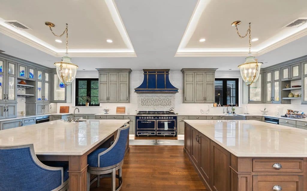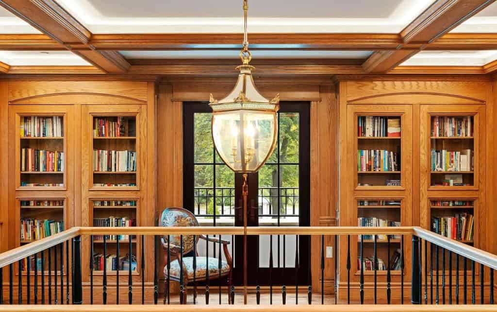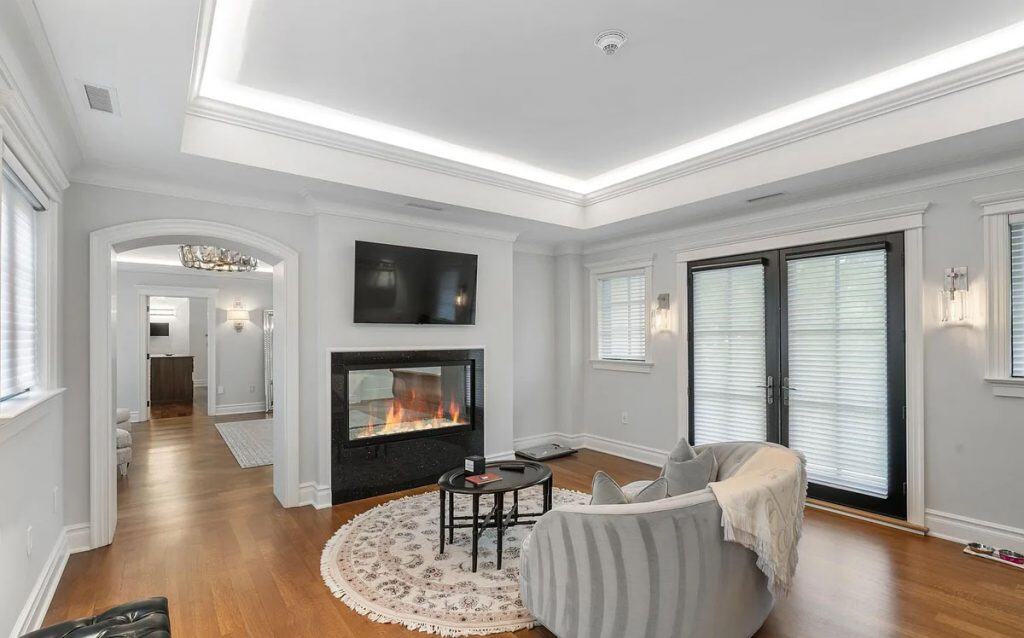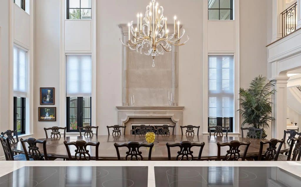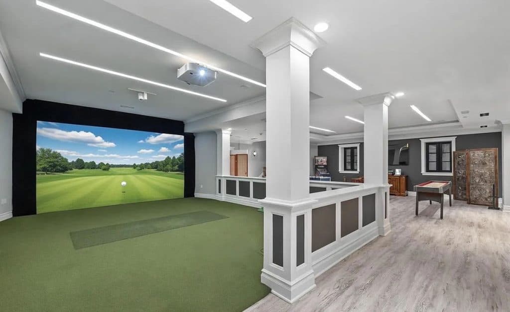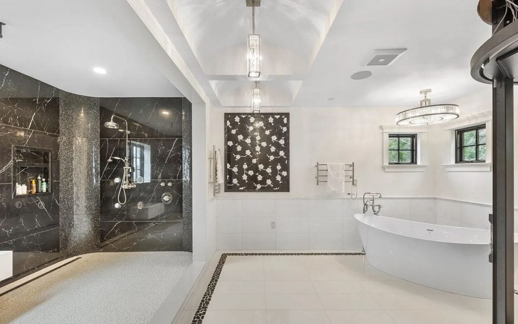 As you enter through the glass doors into the marble foyer, topped with a coffered pearl ceiling, your gaze is instantly captivated by the expansive views of the reflecting pond, the enchanting forest, and the elegance of the dual staircases. The soaring height in the music room reveals hidden gems and opens up a realm of entertainment possibilities. Wrapped in walnut, the fully equipped onyx bar rivals the finest English tavern and seamlessly adjoins the family den. An impressive range of amenities characterizes this home, featuring six fireplaces, a formal dining room that accommodates 20 guests, a 21-car garage, indoor golf, a temperature-controlled wine cellar, spas, a gym, multiple elevators, flexible spaces, and a game room. The master bedroom serves as a private sanctuary, designed to resemble a luxurious four-season hotel suite, complete with a separate sitting area featuring a fireplace and coffee bar, dual custom walk-in closets, and a spa-like bathroom.