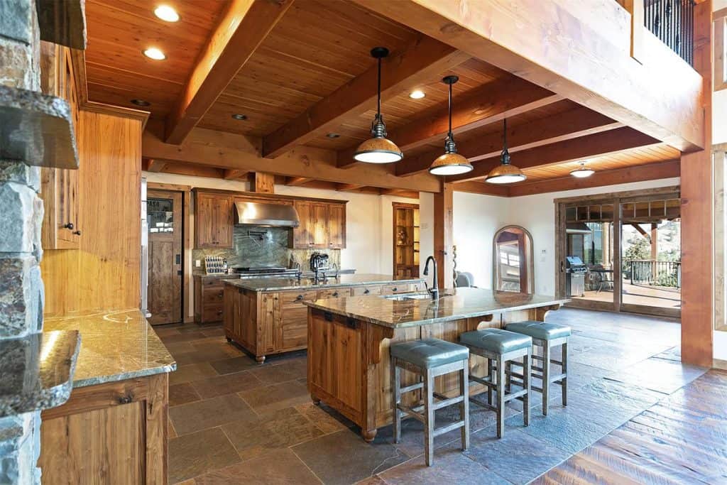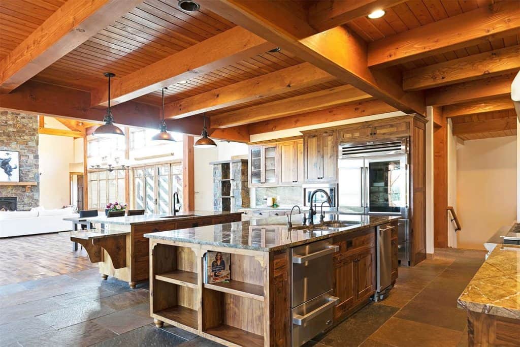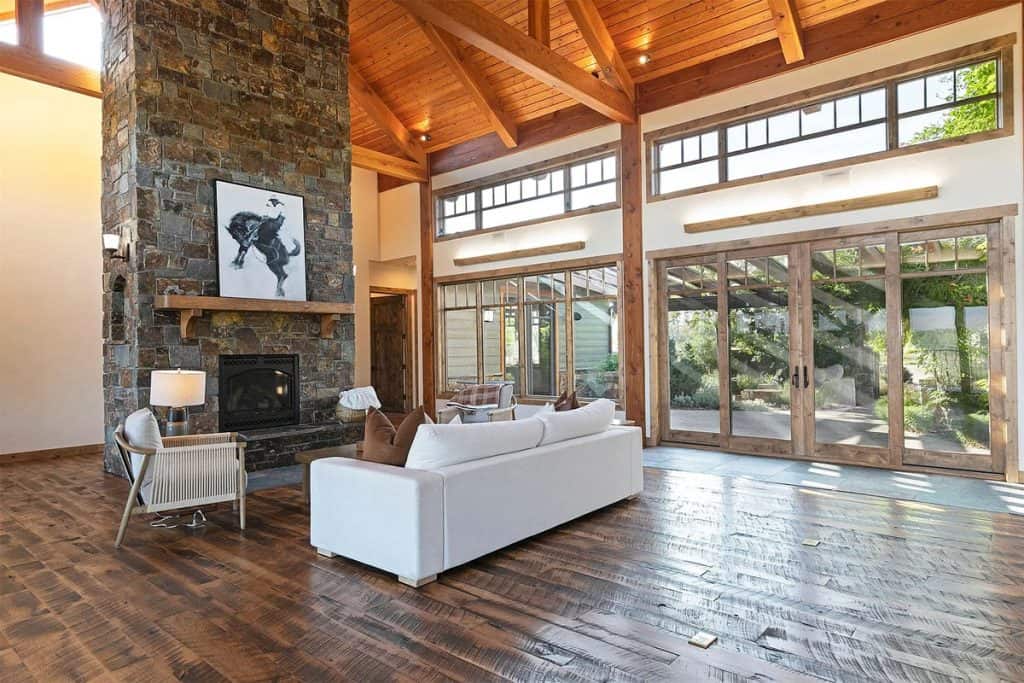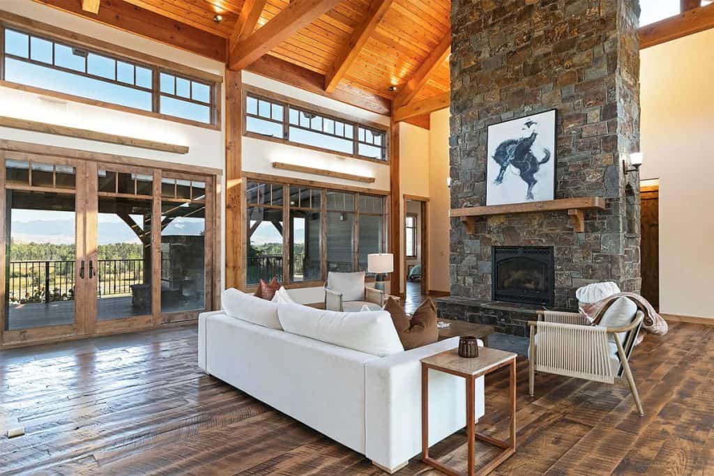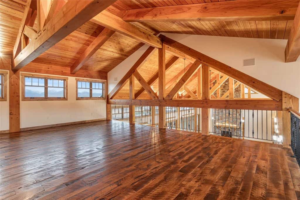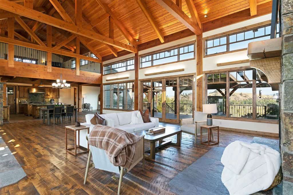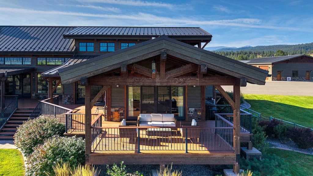 Upon entering the main residence, you will instantly appreciate the detailed woodwork throughout, including circle sawn hardwood floors, large exposed timber frame trusses and beams, and wood-planked ceilings, which together create a rustic yet sophisticated ambiance. The open-concept layout effortlessly links the living room, dining area, and chef’s kitchen, providing a perfect backdrop for both cozy gatherings and lavish entertaining. The living room boasts a stunning floor-to-ceiling stone fireplace, cathedral ceilings, and large windows that showcase breathtaking mountain views. The chef’s kitchen is a true culinary gem, equipped with top-of-the-line appliances, dual islands, granite countertops complemented by a matching backsplash, and a spacious pantry, ensuring an ideal mix of elegance and practicality. Outside, the property boasts a large covered deck, creating a private space to relax away from the sights of Blue Mountain Road. The deck is equipped with an exterior fireplace and presents sweeping views of the surrounding mountains and Missoula Valley, making it a stunning setting for outdoor gatherings.