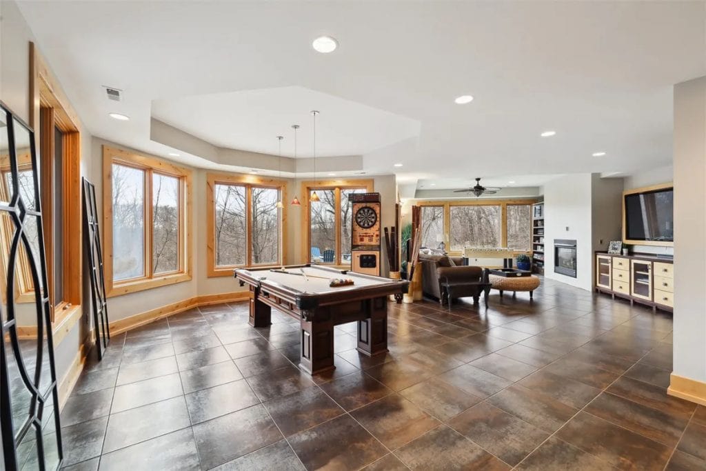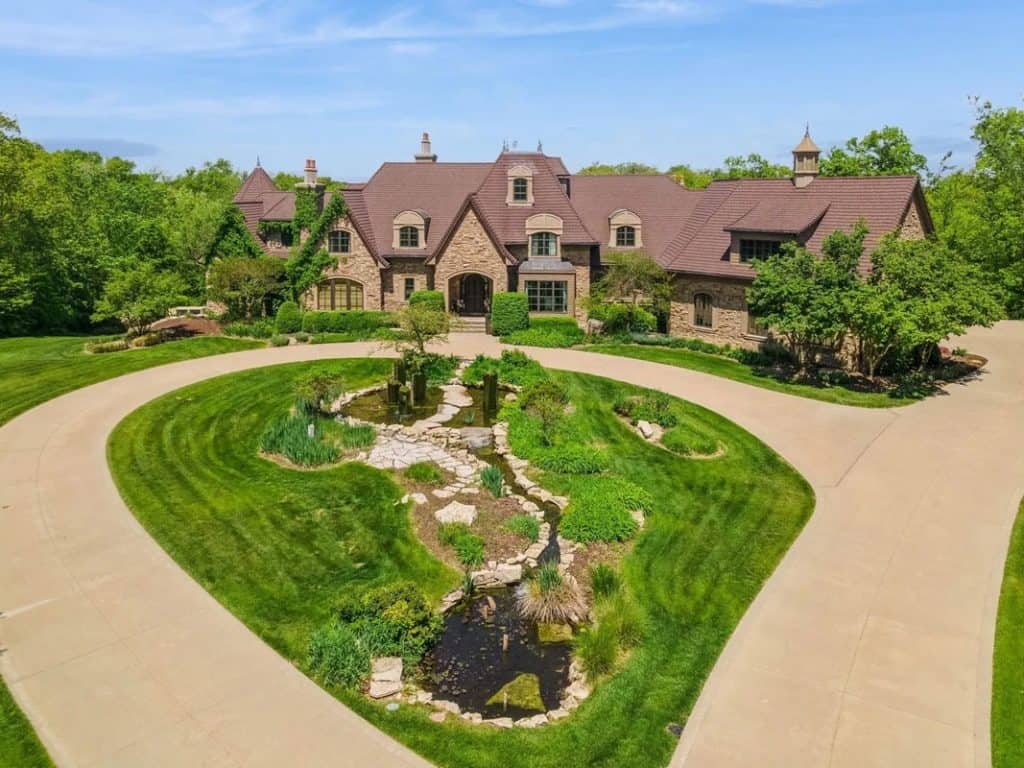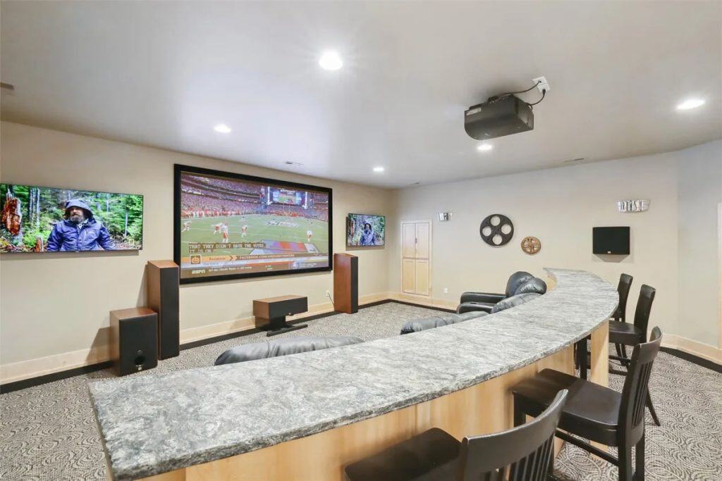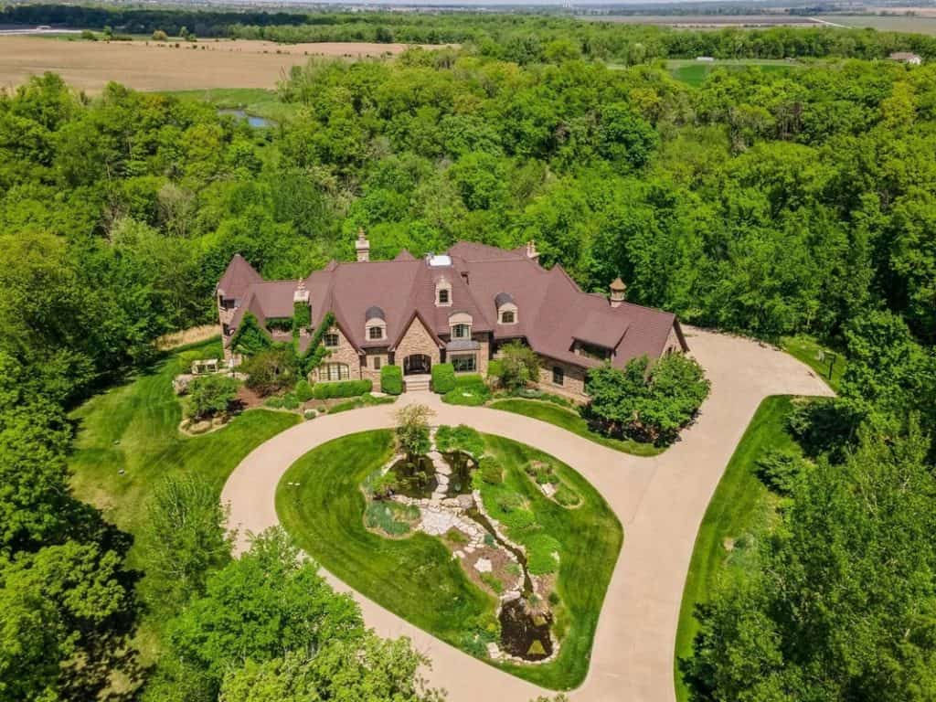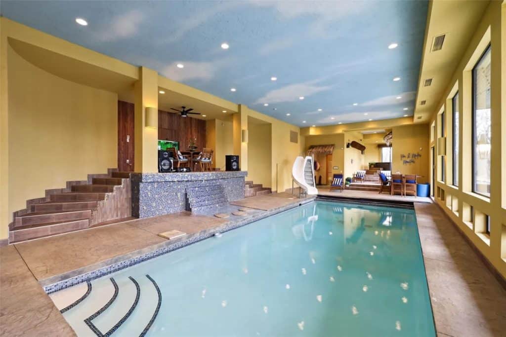 It features two swimming pools—one indoor complete with a waterfall, slide, plus outdoor pool equipped with a swim table, water feature jets, and metal palm trees adorned with lighted coconuts. Additionally, there are two hot tubs (one indoors and one outdoors), a 73’x 120’ (8,760 square feet) heated and air-conditioned indoor tennis facility that can also accommodate a car collection, and a 1,708 square feet heated attached garage for 4 cars. The theater room includes 5 theater chairs and 3 TVs; the kitchen is outfitted with 3 dishwashers, 3 sinks, a steaming station, a Sub-Zero refrigerator/freezer, refrigerator drawers, an ice-maker, a Wolf double oven, a warming drawer, and a walk-in pantry. The primary bathroom features a spacious steam shower with double heads, and there are 4 laundry rooms equipped with 4 washers and 4 dryers. The great room boasts a cathedral ceiling with a chandelier that can be lowered for cleaning at the touch of a button. There is also an apartment with two separate entrances, two secret bookshelf doors, and no carpet except in the theater room. Additional amenities include a generator, 3 safes, a safe room, an exercise room, an invisible fence, a dog shower, a water feature with a pond, a fish aquarium, 5 efficient geothermal furnaces, and in-floor radiant heat throughout the entire house and garage.