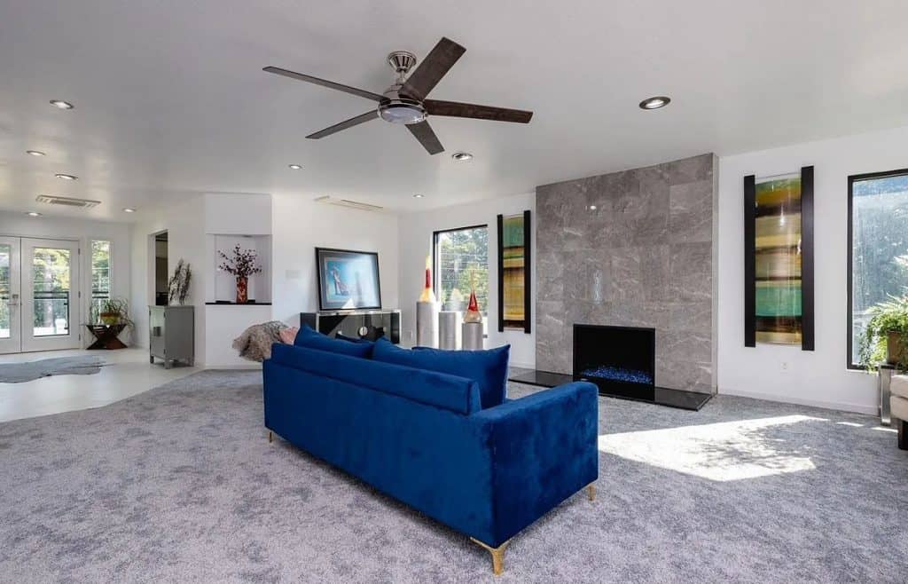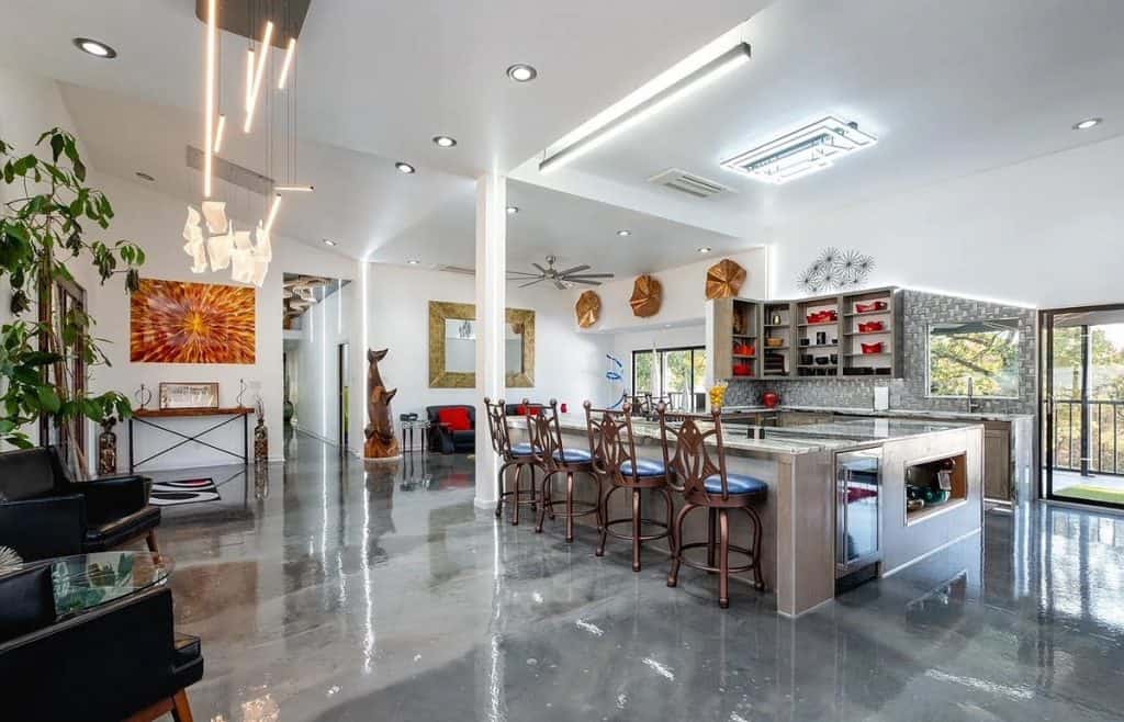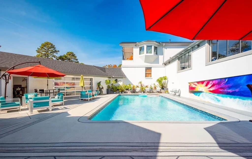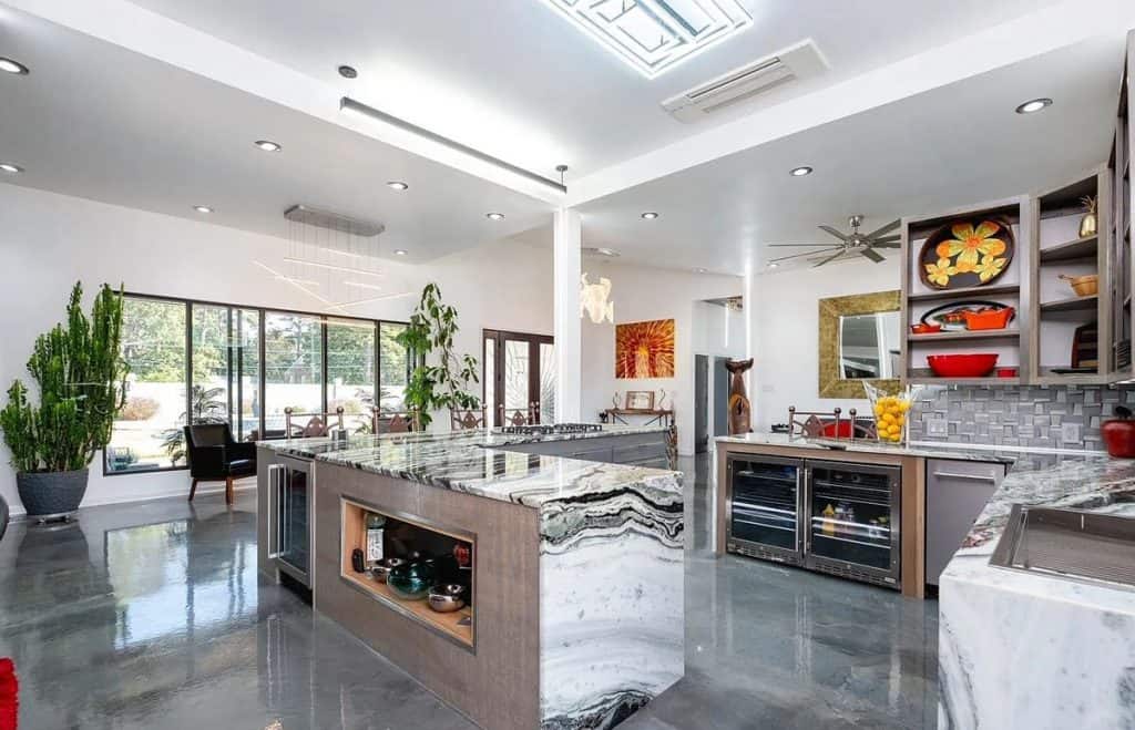 The kitchen is a chef’s paradise, equipped with high-end appliances, a large island featuring a stone countertop, a fireplace, and an impressive pantry. From the kitchen, you flow into the expansive dining room adorned with substantial built-in cabinets. Hosting gatherings is a delight in the grand living space. The attached apartment spans over 2000 square feet and is ideal for in-laws or teenagers. You can relax on one of the verandas while taking in the vast, beautifully landscaped backyard and pool. Host gatherings from the outdoor kitchen and party room. The connected pool/guest house is equipped with a kitchen, living area, bedroom, and bathroom.