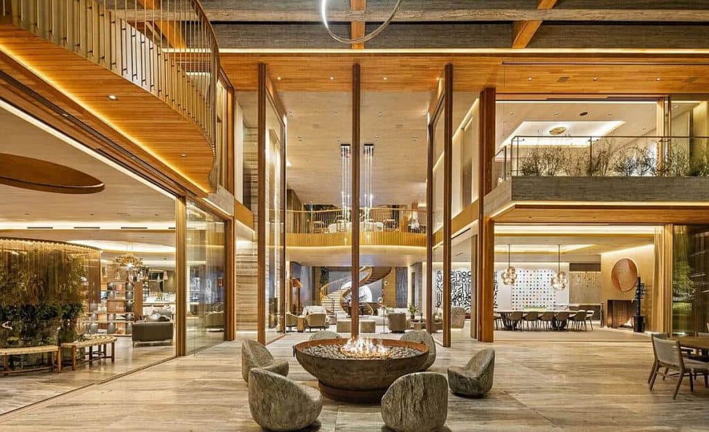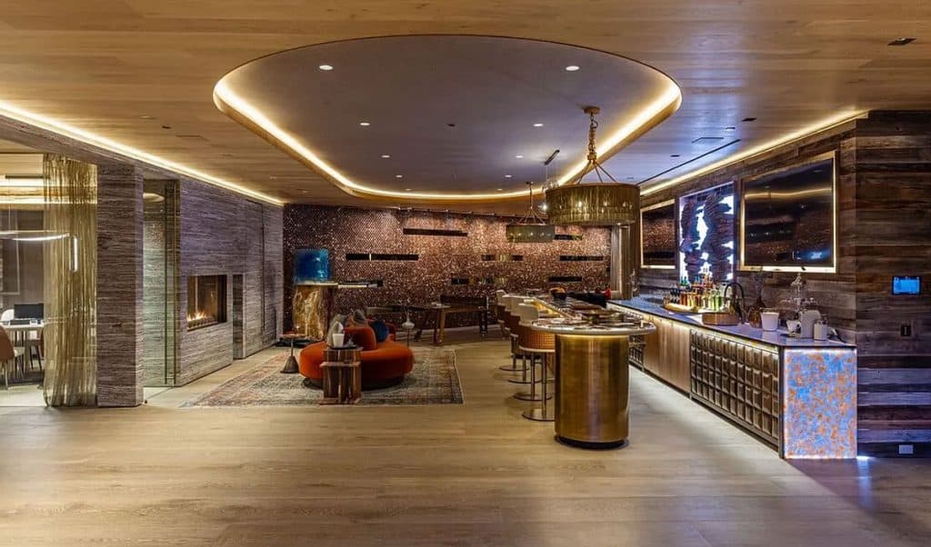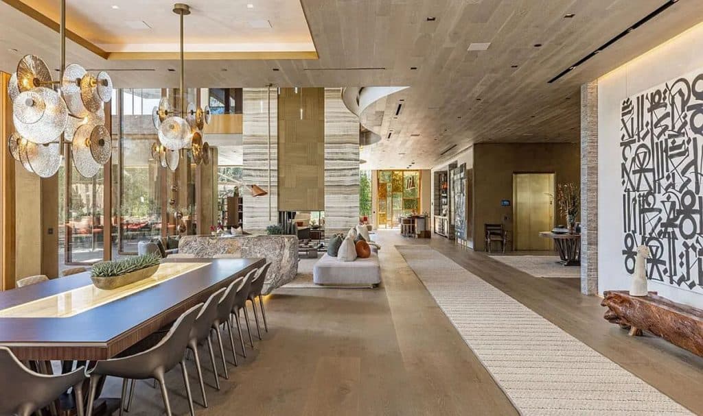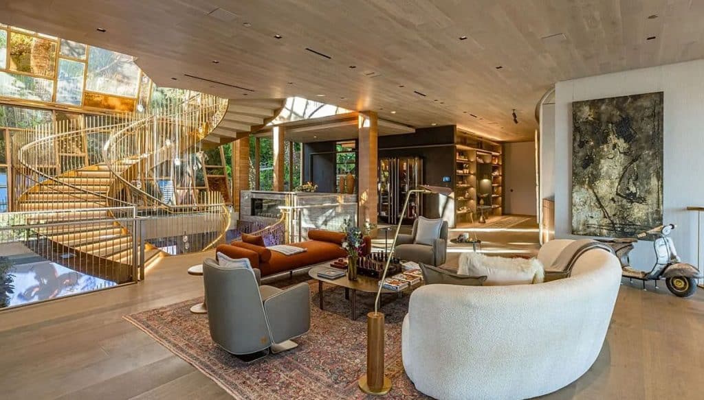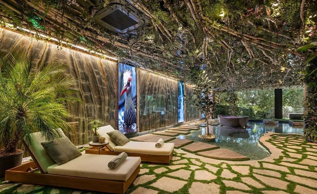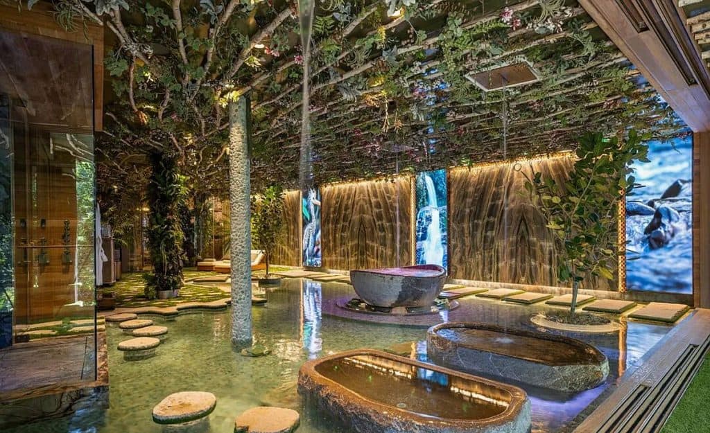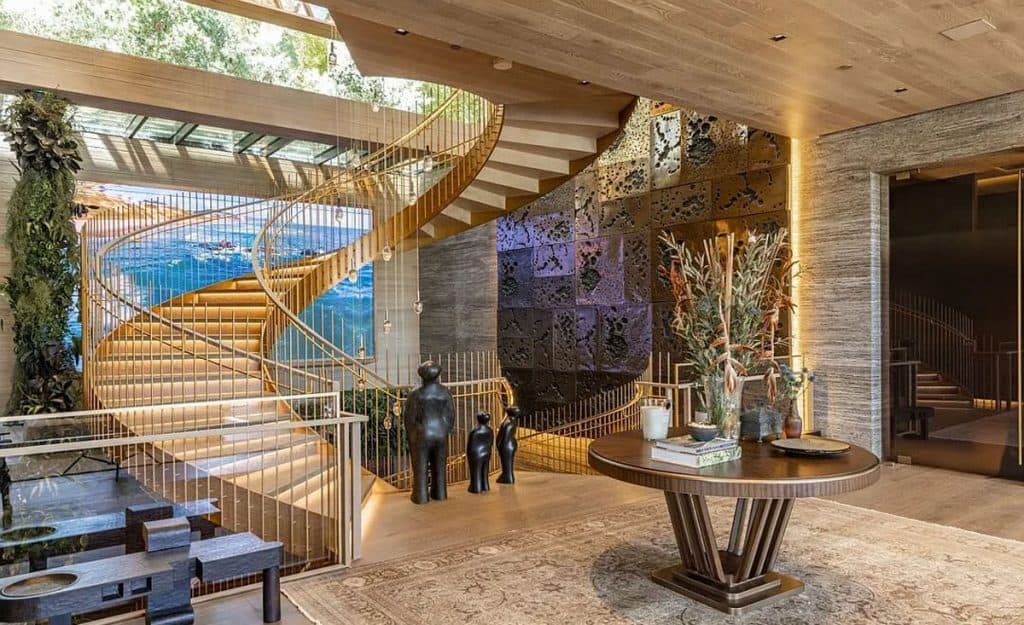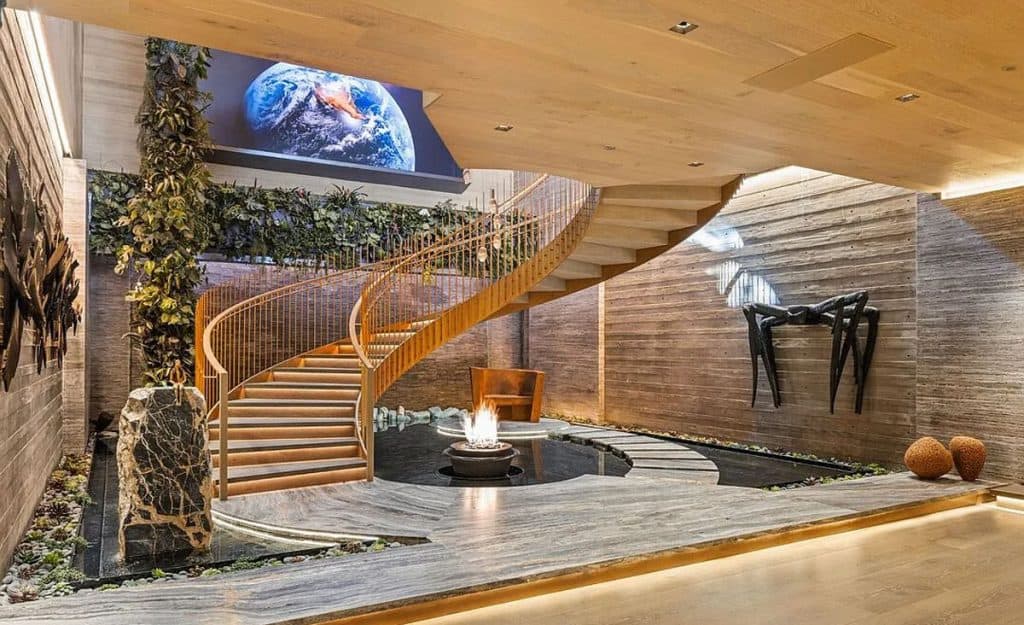 An outdoor sauna pod features a glass wall that allows you to enjoy the views of a nearby golf course. Additional amenities consist of a spa, a screening room, a bar, and an “auto gallery”/Jazz Club that accommodates six cars. The exterior is completely covered in natural materials such as teak and stone. Inside, a four-story staircase with a bronze finish is suspended from the ceiling, creating the illusion of floating. At the bottom of the staircase, there is a reflecting pool, and 30-foot pivot doors open up to the outdoors. You can enter the wine room through antique doors that are 200 years old. The spa features an incredible water journey, with both hot and cold plunge pools, as well as a hydrotherapy chamber that offers red light therapy. Designed to evoke a forest atmosphere, the spa is adorned with lush greenery on the ceiling and LED screens that display videos of tropical landscapes.