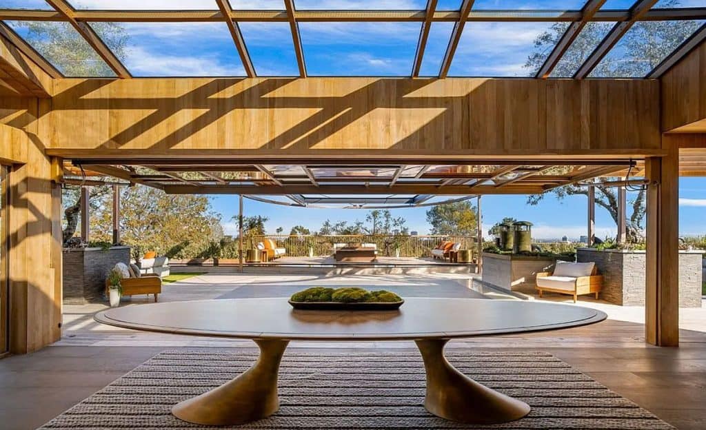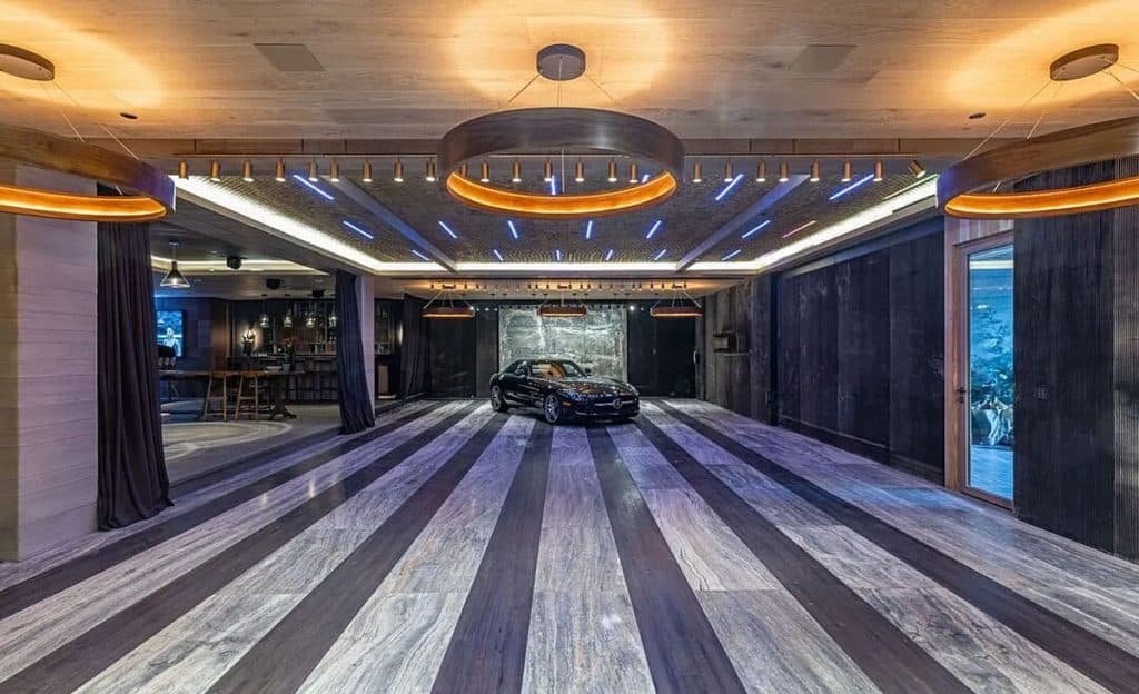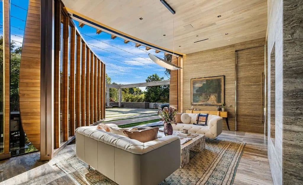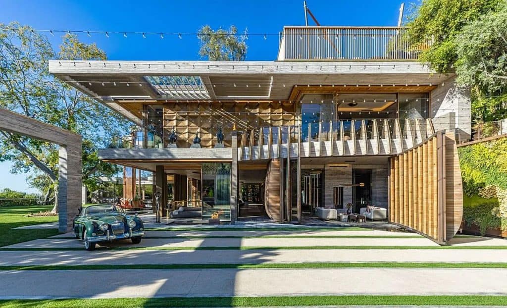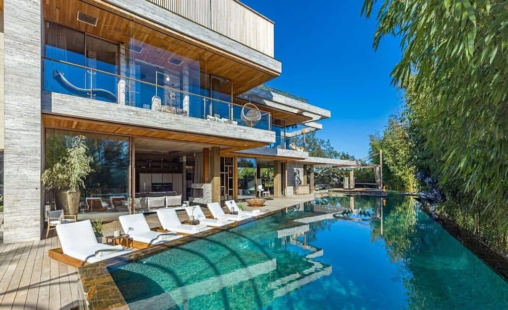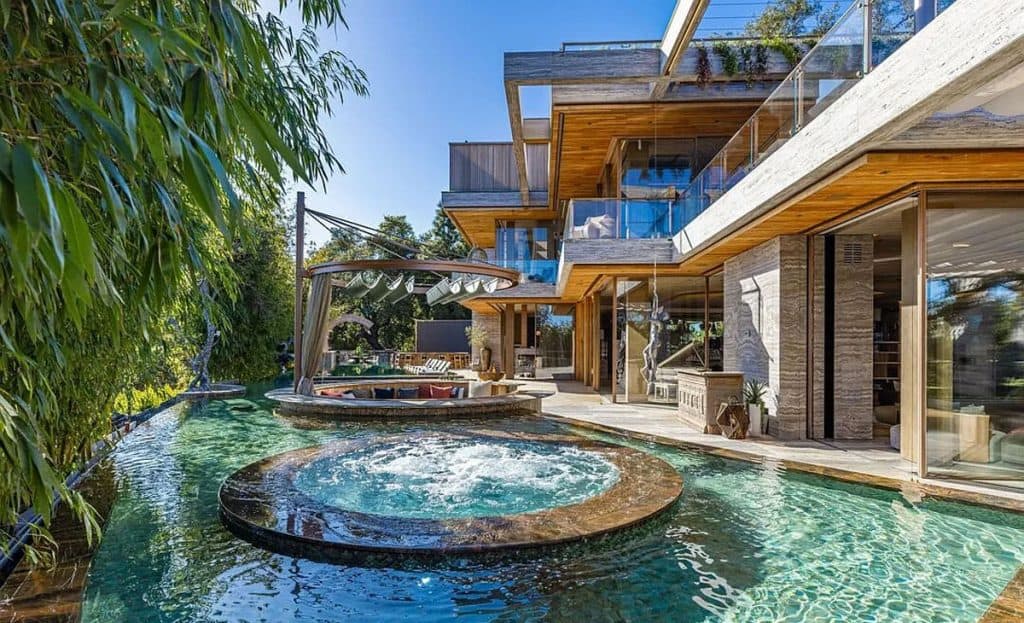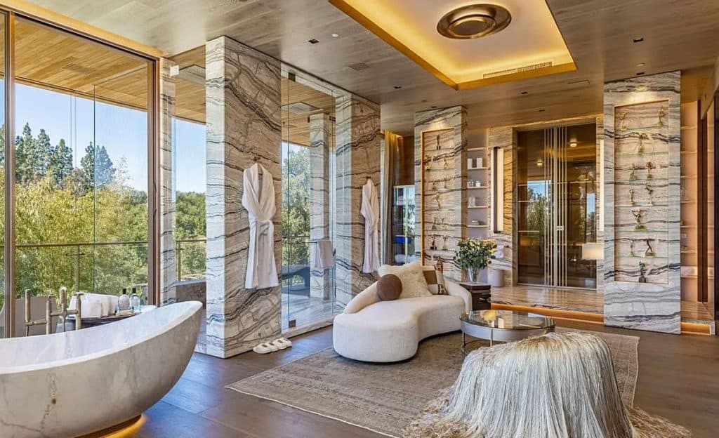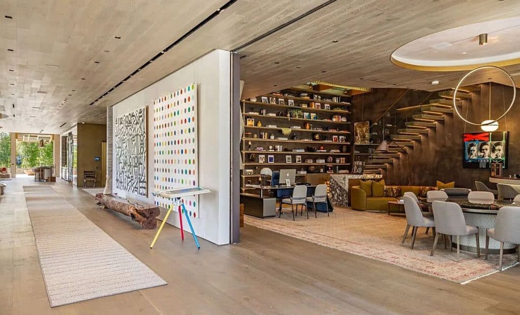An outdoor sauna pod features a glass wall that allows you to enjoy the views of a nearby golf course. Additional amenities consist of a spa, a screening room, a bar, and an “auto gallery”/Jazz Club that accommodates six cars. The exterior is completely covered in natural materials such as teak and stone. Inside, a four-story staircase with a bronze finish is suspended from the ceiling, creating the illusion of floating. At the bottom of the staircase, there is a reflecting pool, and 30-foot pivot doors open up to the outdoors. You can enter the wine room through antique doors that are 200 years old. The spa features an incredible water journey, with both hot and cold plunge pools, as well as a hydrotherapy chamber that offers red light therapy. Designed to evoke a forest atmosphere, the spa is adorned with lush greenery on the ceiling and LED screens that display videos of tropical landscapes.