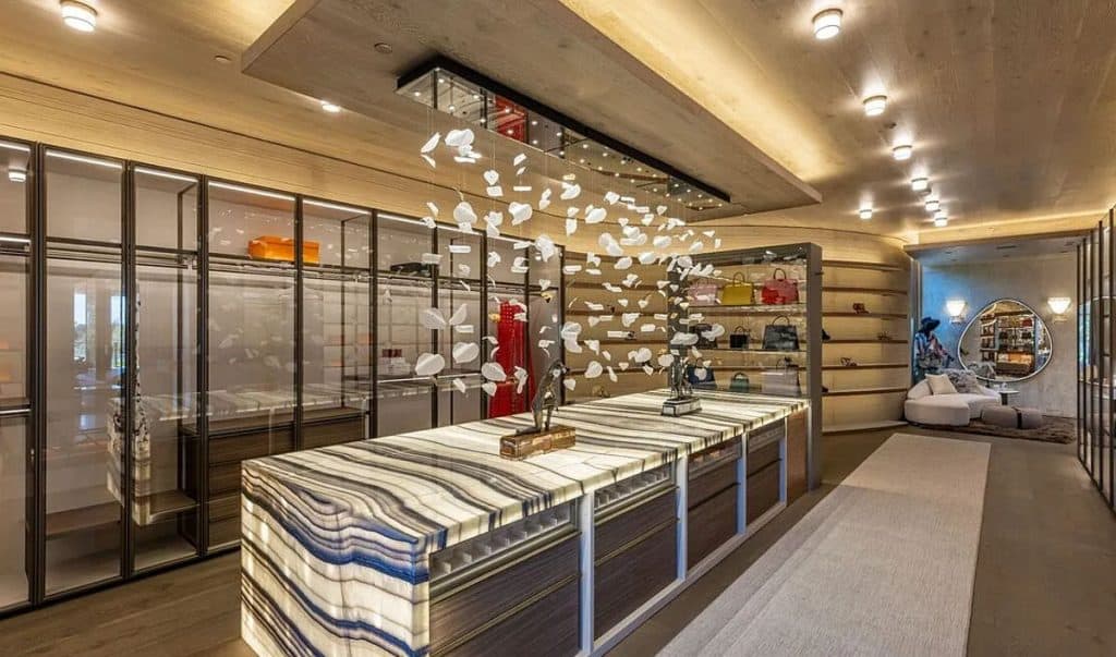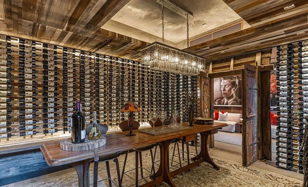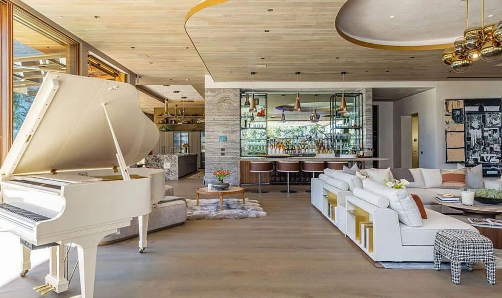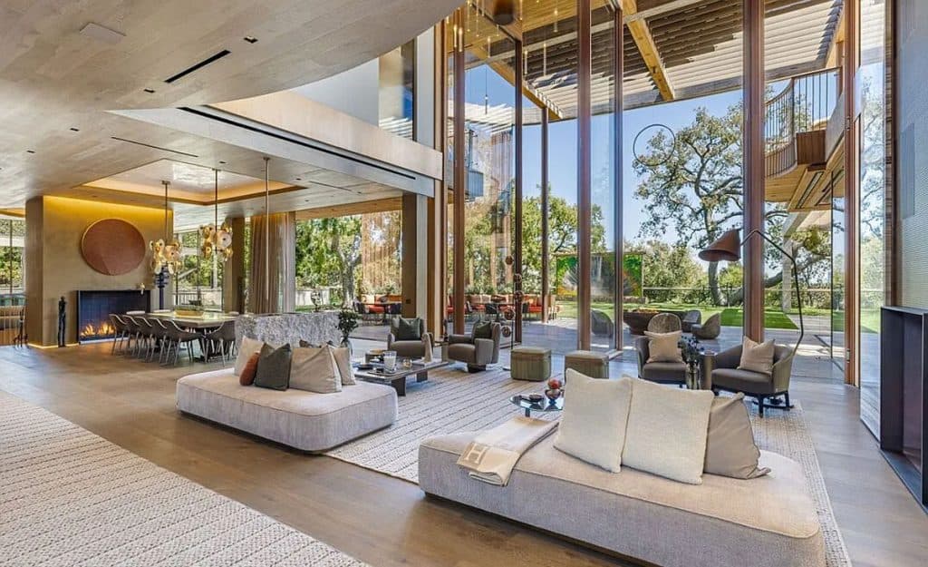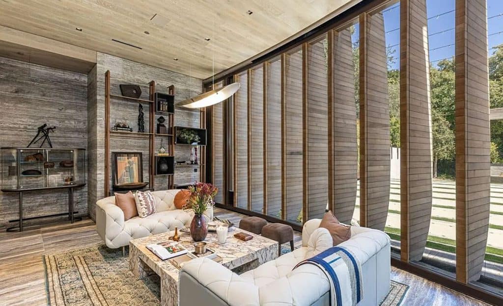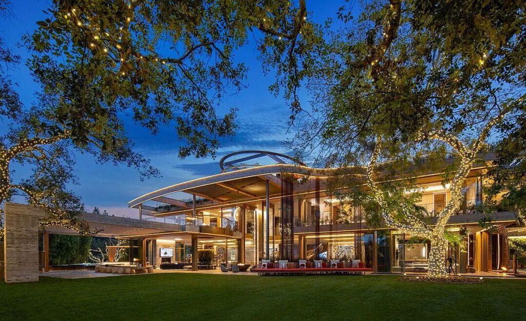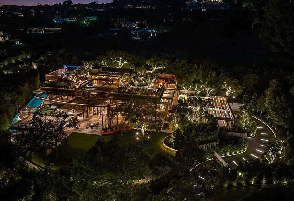 An outdoor sauna pod features a glass wall that allows you to enjoy the views of a nearby golf course. Additional amenities consist of a spa, a screening room, a bar, and an “auto gallery”/Jazz Club that accommodates six cars. The exterior is completely covered in natural materials such as teak and stone. Inside, a four-story staircase with a bronze finish is suspended from the ceiling, creating the illusion of floating. At the bottom of the staircase, there is a reflecting pool, and 30-foot pivot doors open up to the outdoors. You can enter the wine room through antique doors that are 200 years old. The spa features an incredible water journey, with both hot and cold plunge pools, as well as a hydrotherapy chamber that offers red light therapy. Designed to evoke a forest atmosphere, the spa is adorned with lush greenery on the ceiling and LED screens that display videos of tropical landscapes.