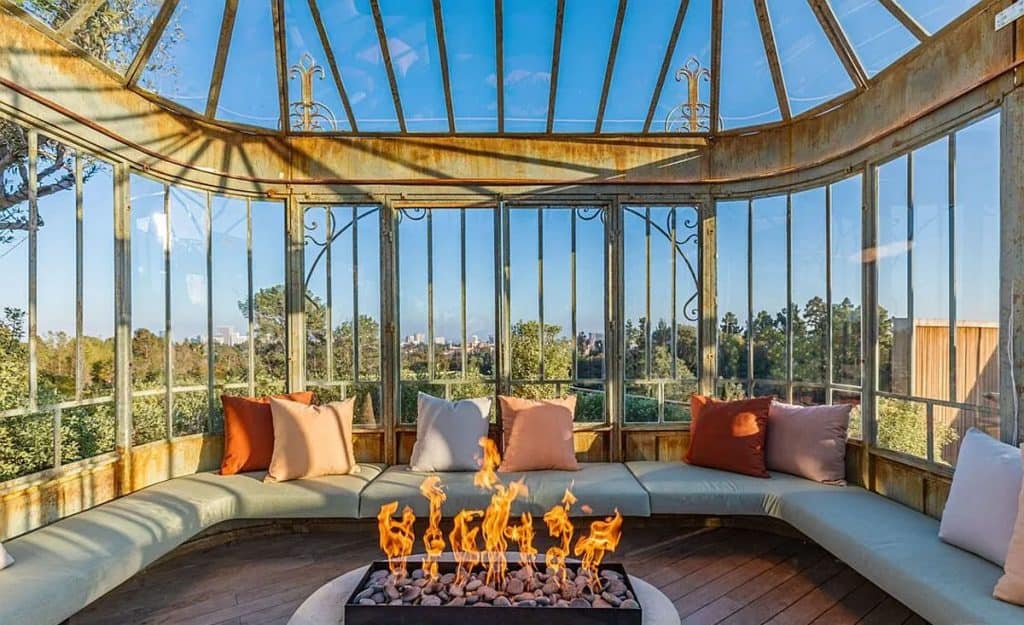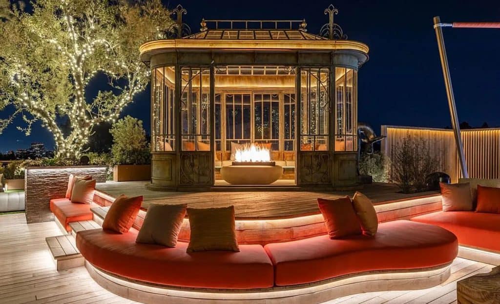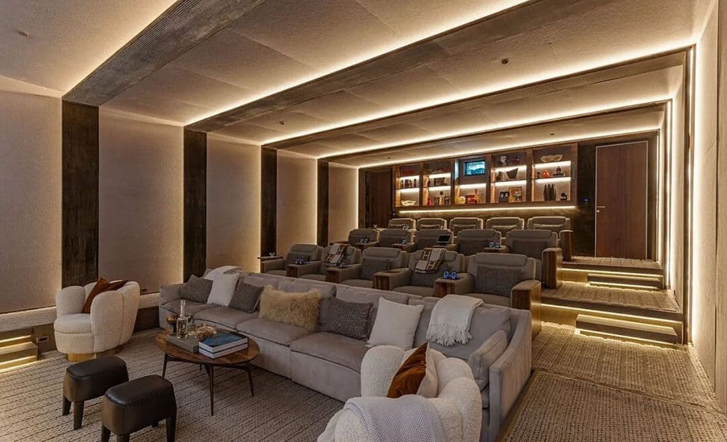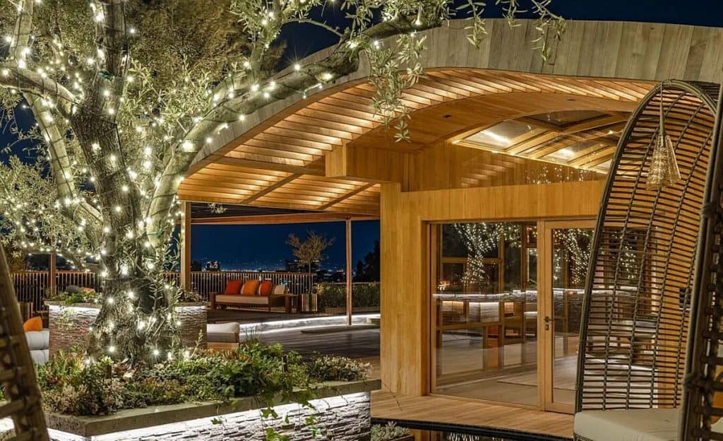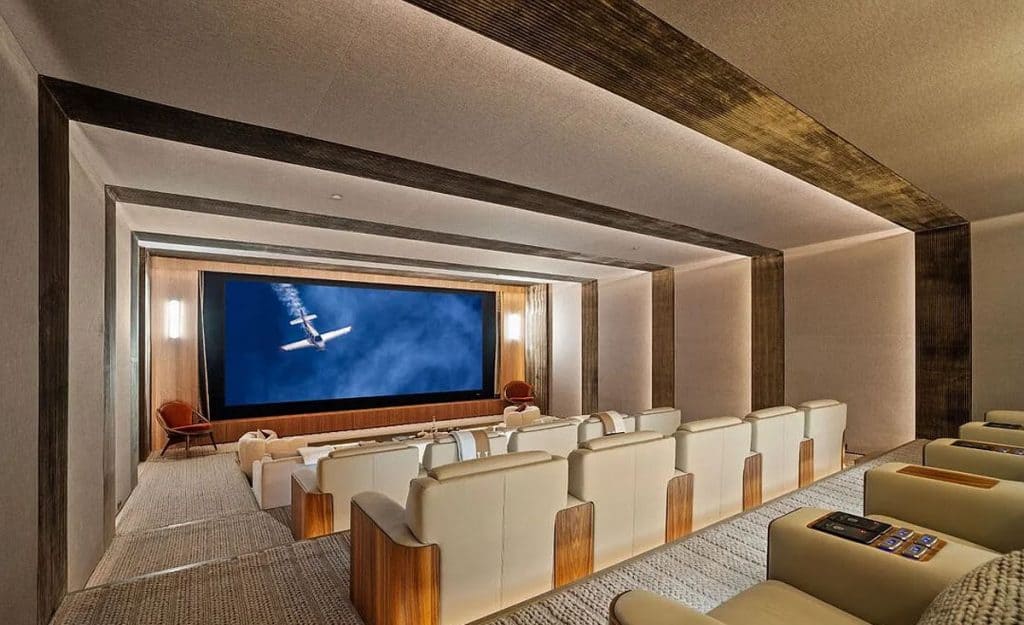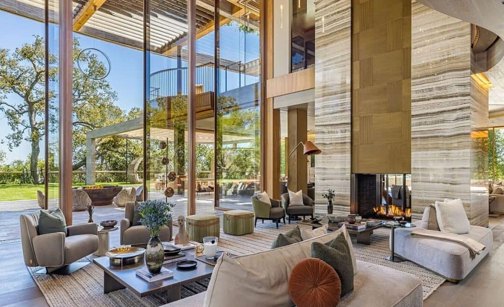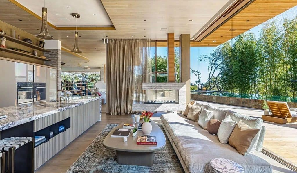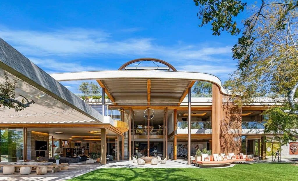 An outdoor sauna pod features a glass wall that allows you to enjoy the views of a nearby golf course. Additional amenities consist of a spa, a screening room, a bar, and an “auto gallery”/Jazz Club that accommodates six cars. The exterior is completely covered in natural materials such as teak and stone. Inside, a four-story staircase with a bronze finish is suspended from the ceiling, creating the illusion of floating. At the bottom of the staircase, there is a reflecting pool, and 30-foot pivot doors open up to the outdoors. You can enter the wine room through antique doors that are 200 years old. The spa features an incredible water journey, with both hot and cold plunge pools, as well as a hydrotherapy chamber that offers red light therapy. Designed to evoke a forest atmosphere, the spa is adorned with lush greenery on the ceiling and LED screens that display videos of tropical landscapes.