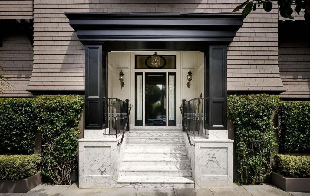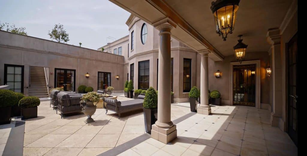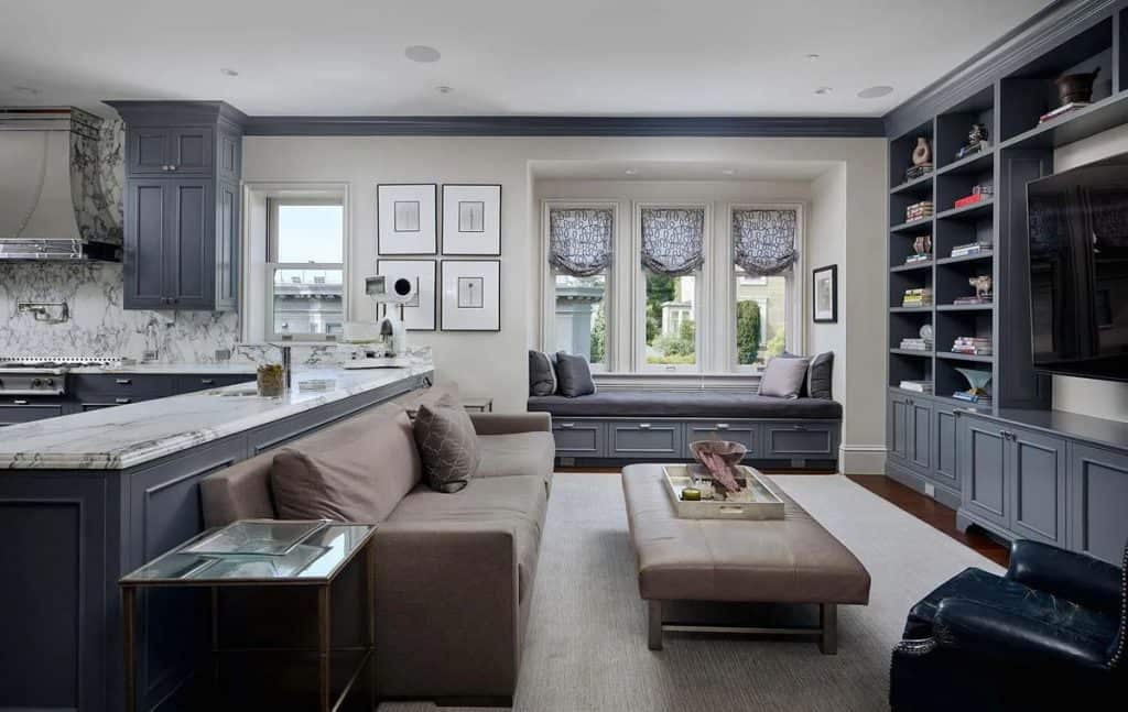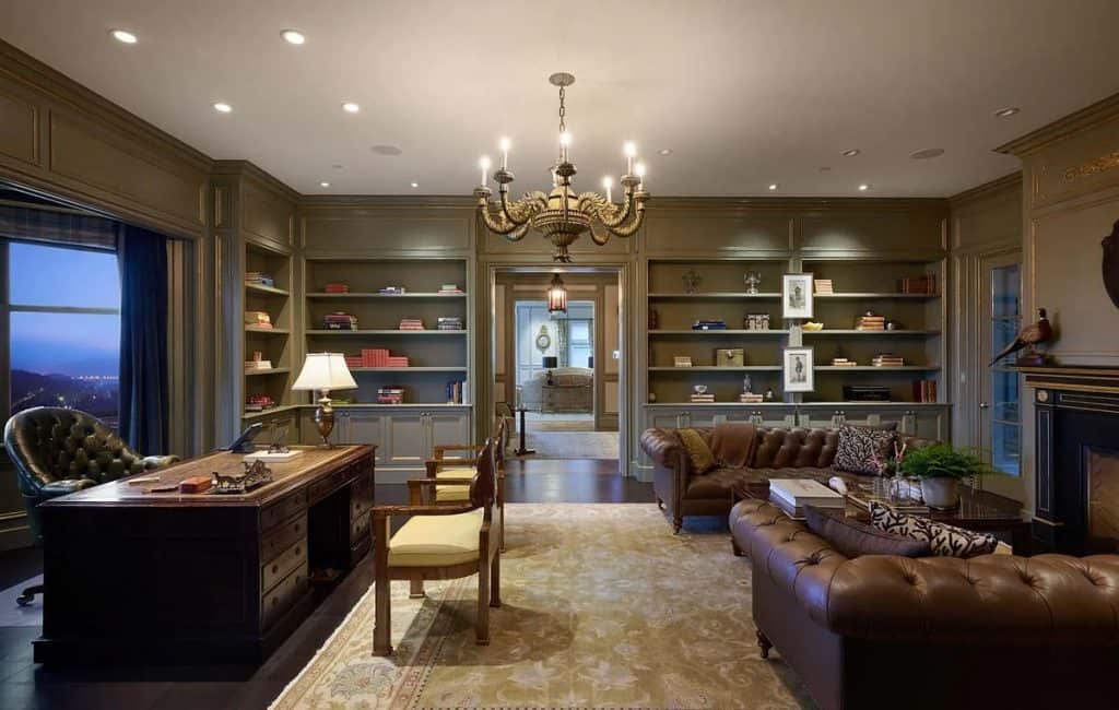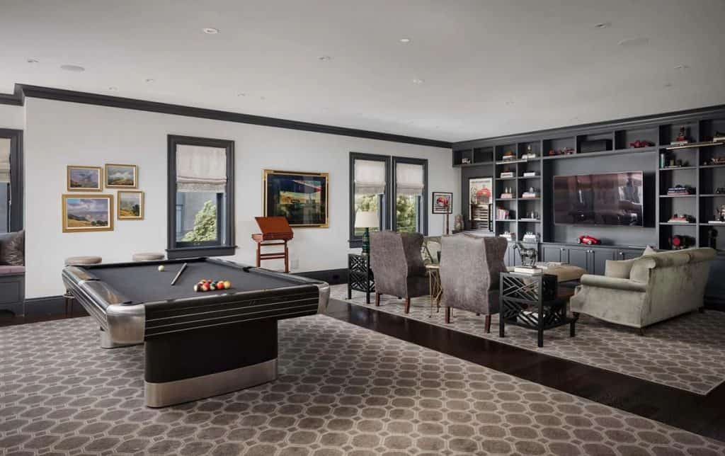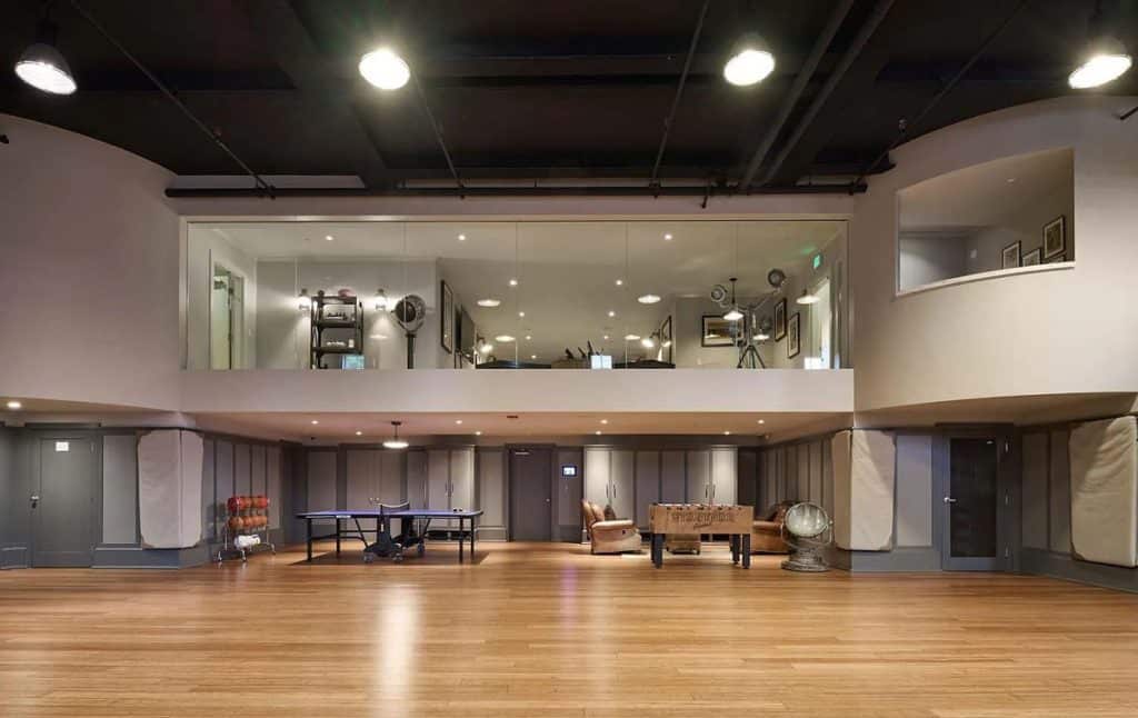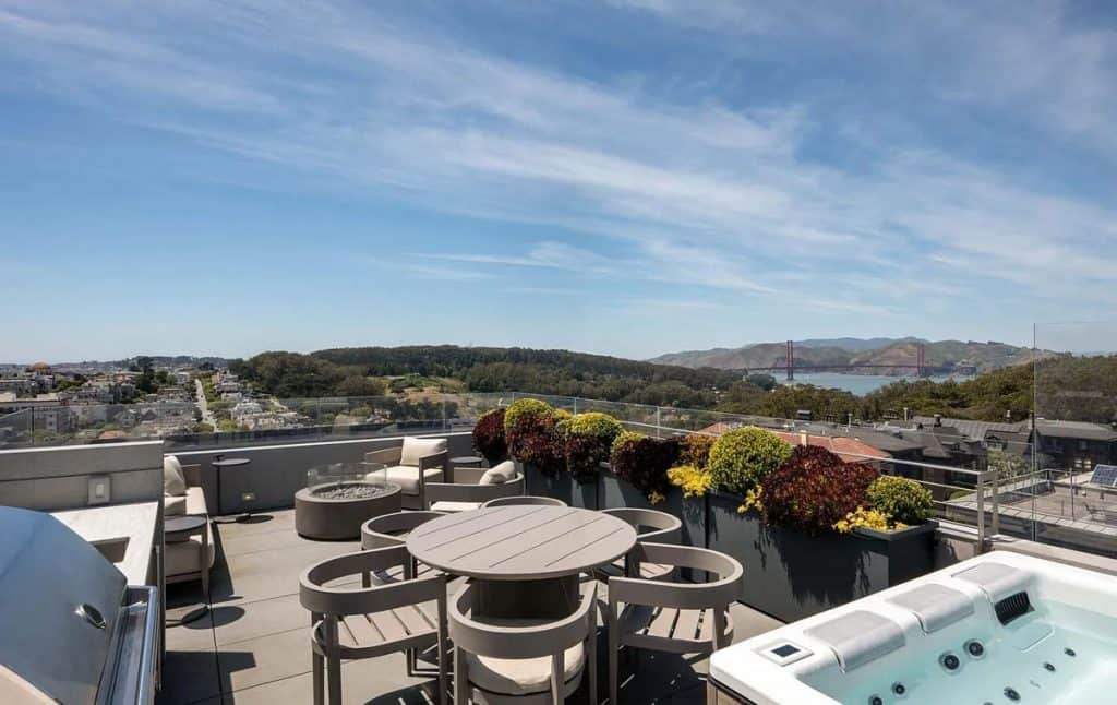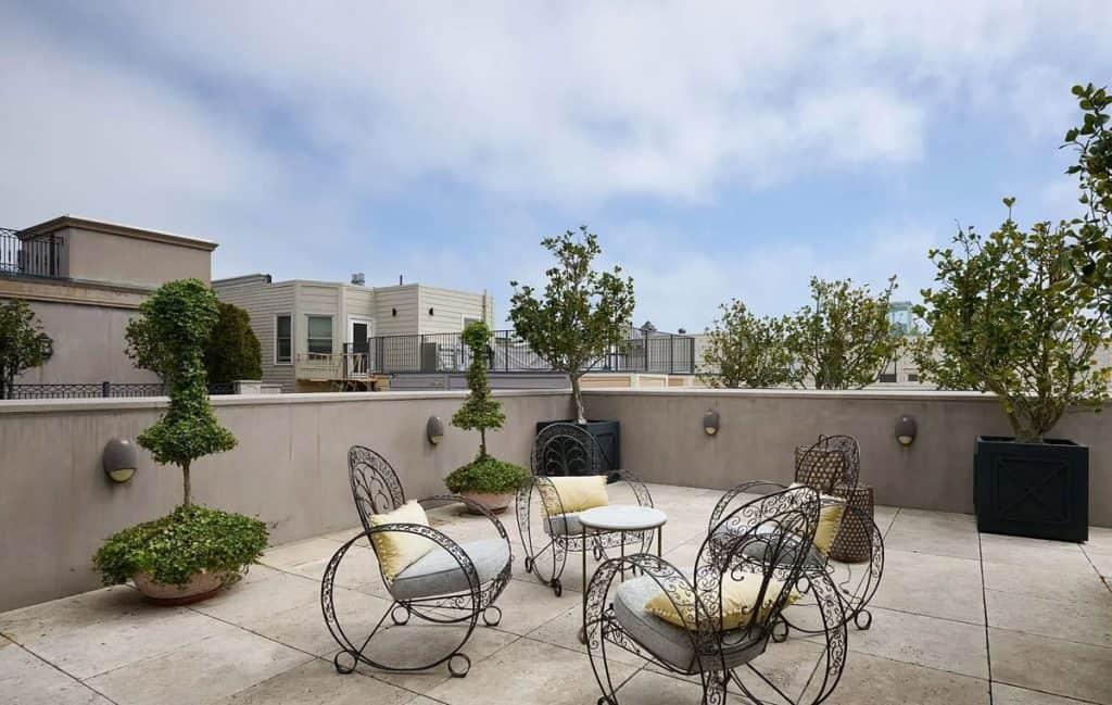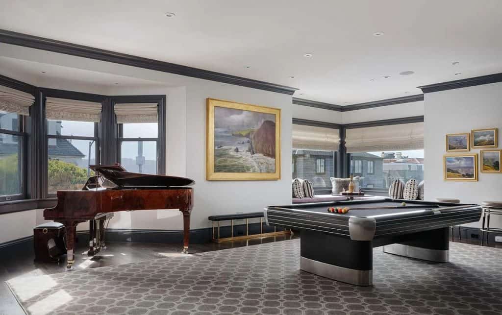 Spanning five generous levels with elevator access, the home is centered around a European-style courtyard featuring a fireplace, which anchors the formal living and dining rooms, library, gallery, and family room. A chef’s kitchen, along with a full catering kitchen, easily caters to both intimate gatherings and formal events. The amenities offered consist of an indoor basketball court, a gym with glass walls, a yoga and movement studio, a spa bath, a massage room, a golf simulator, a media room, a wine lounge, and a bar. The rooftop retreat offers breathtaking views of the Golden Gate Bridge, Presidio, and the city skyline, and is equipped with an outdoor kitchen, hot tub, and fire pit. Other notable features include radiant heating throughout, a six-car garage with EV charging capabilities, and parking space for around 20 additional vehicles.
