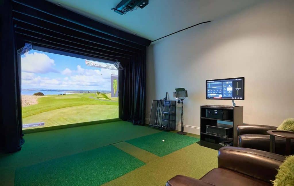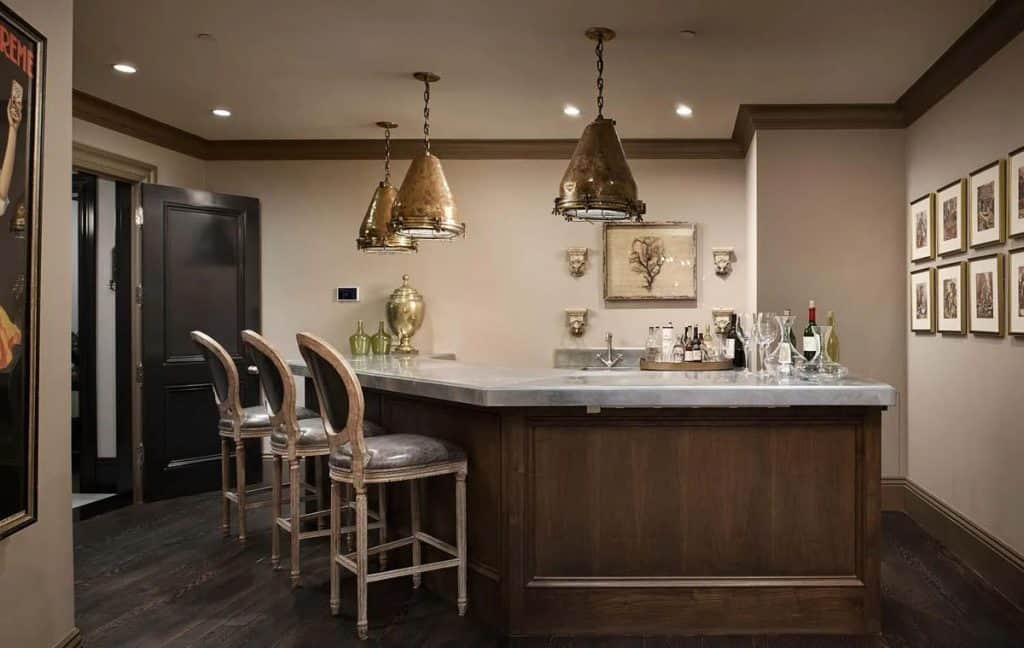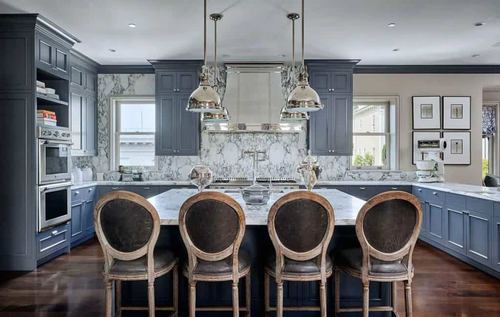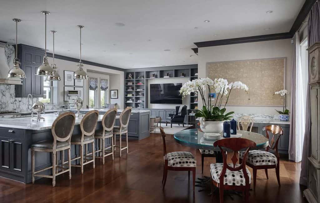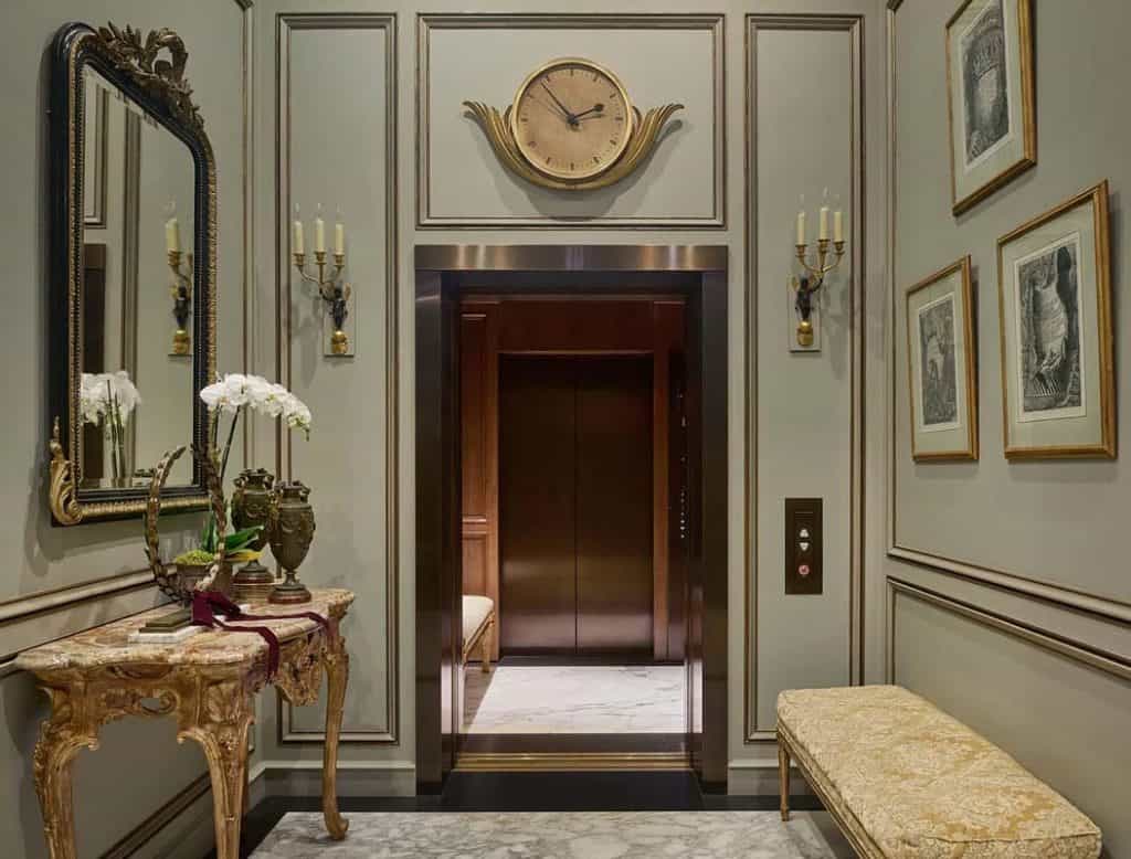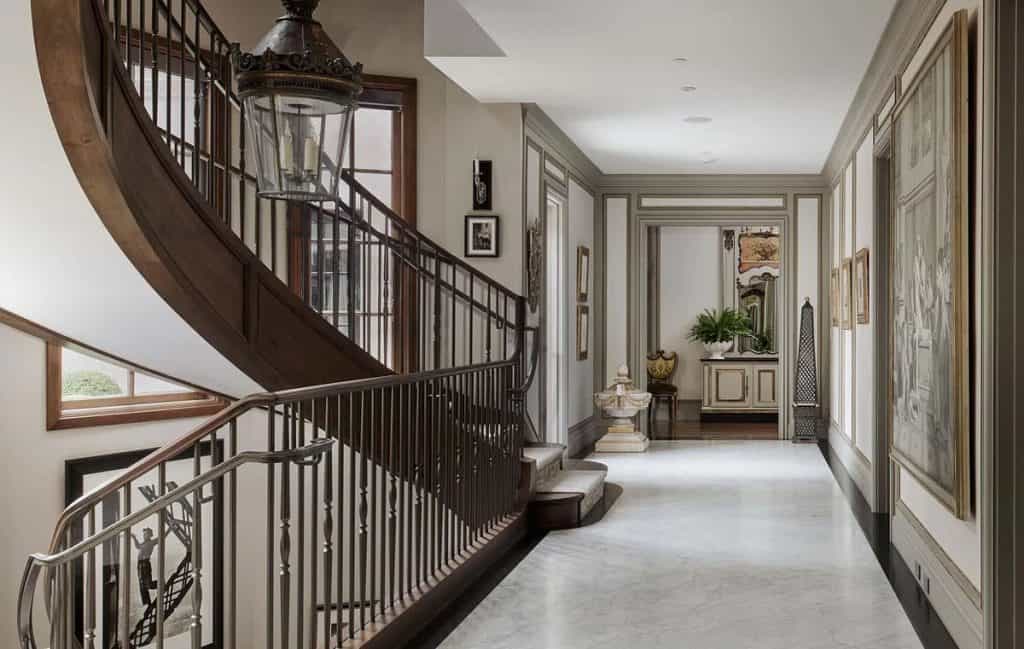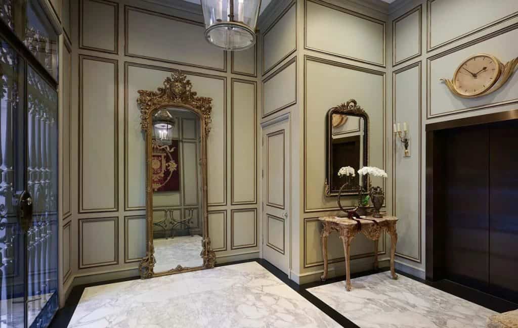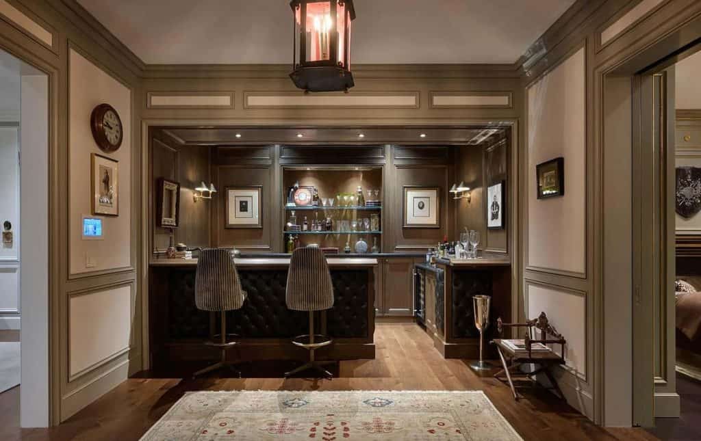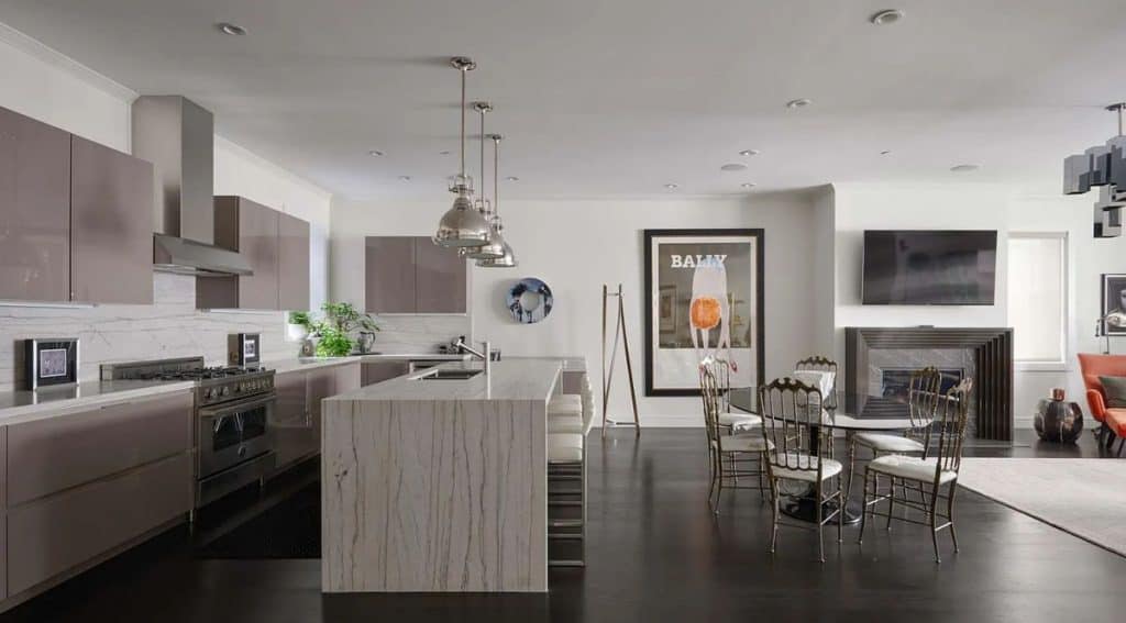 Spanning five generous levels with elevator access, the home is centered around a European-style courtyard featuring a fireplace, which anchors the formal living and dining rooms, library, gallery, and family room. A chef’s kitchen, along with a full catering kitchen, easily caters to both intimate gatherings and formal events. The amenities offered consist of an indoor basketball court, a gym with glass walls, a yoga and movement studio, a spa bath, a massage room, a golf simulator, a media room, a wine lounge, and a bar. The rooftop retreat offers breathtaking views of the Golden Gate Bridge, Presidio, and the city skyline, and is equipped with an outdoor kitchen, hot tub, and fire pit. Other notable features include radiant heating throughout, a six-car garage with EV charging capabilities, and parking space for around 20 additional vehicles.