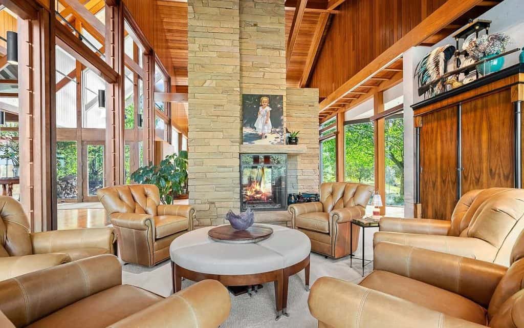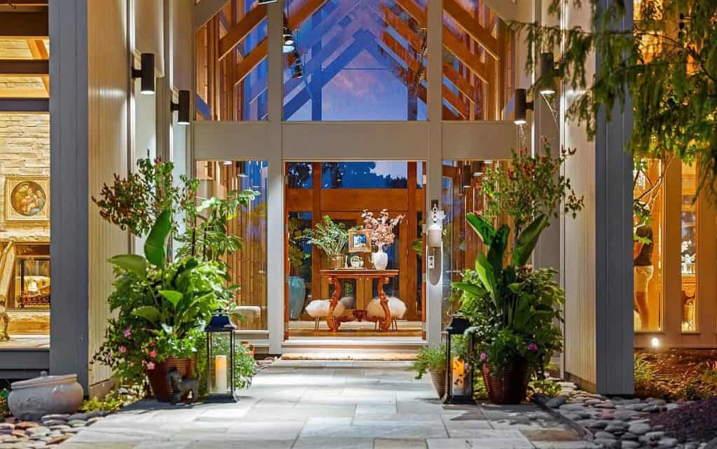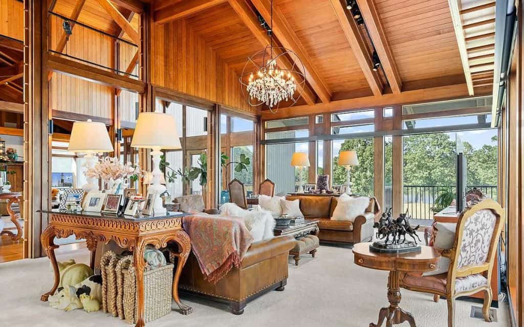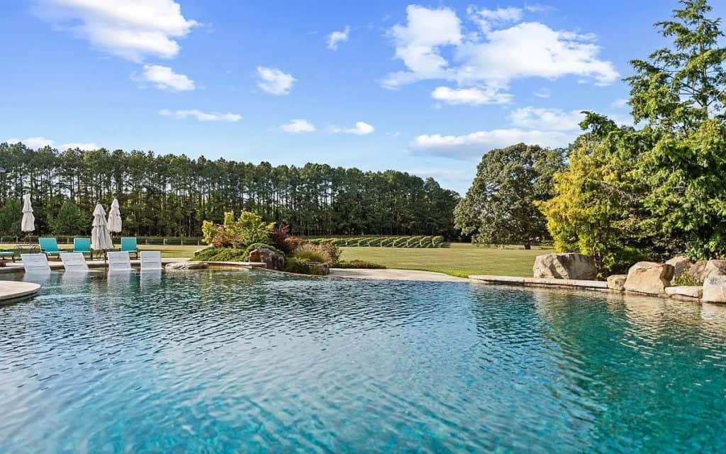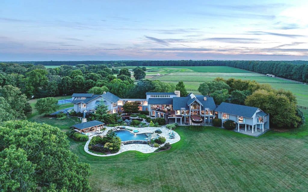High-end amenities are plentiful, including a gourmet kitchen, a recreation room with a kitchen and bar for entertaining, a full exercise room, five car garages, an elevator, heated limestone floors, Venetian plaster walls, and several outdoor decks. Outside, the resort-style features boast a spacious, heated infinity pool, which includes a waterfall and hot tub, a breathtaking pool pavilion with a complete outdoor kitchen, and a stone fireplace. Coupled with the waterside tennis/pickleball court, a serene koi pond, and a private pier, the possibilities for outdoor enjoyment and relaxation are endless. Additionally, there is a beautifully updated 4-bedroom guesthouse that overlooks the vineyards, offering cozy accommodations for family and friends. A well-appointed 9-stall barn comes with a tack room/office, kitchenette, and a riding ring, all set on 20 acres of fenced pastures.