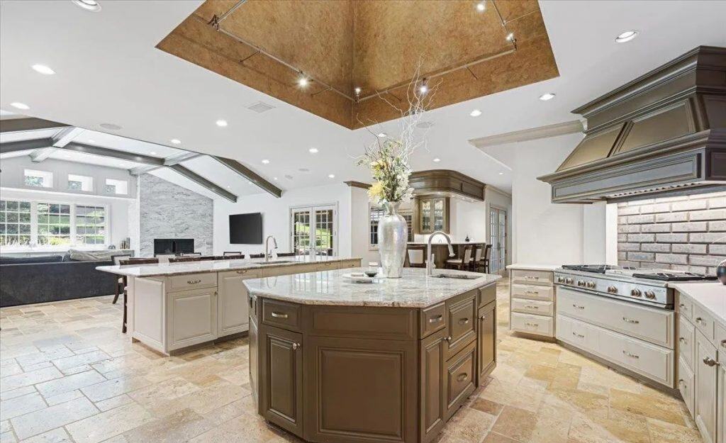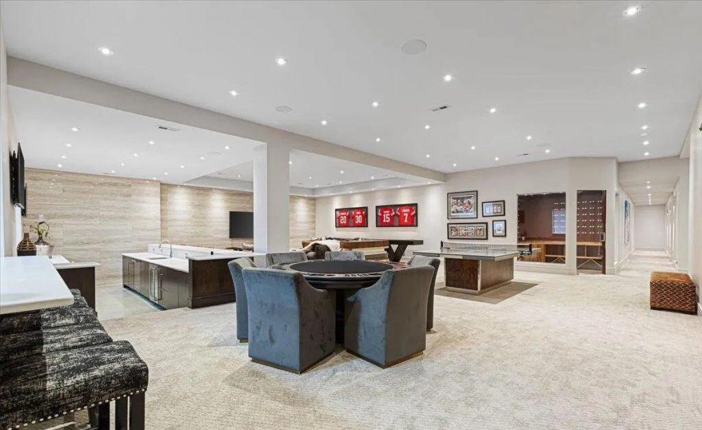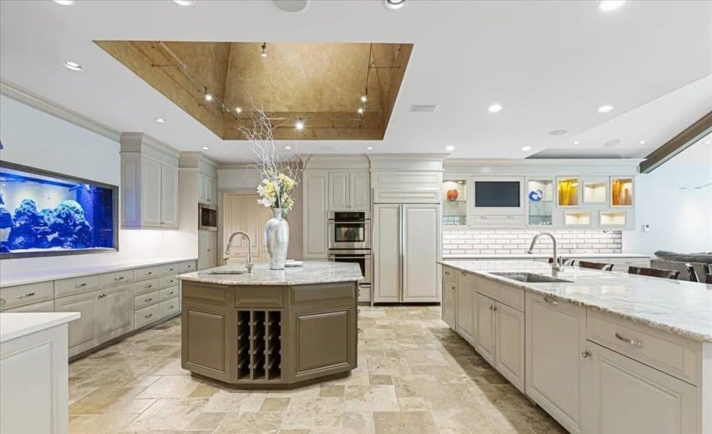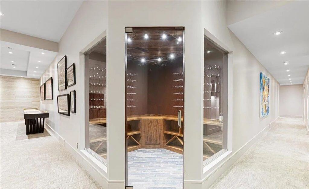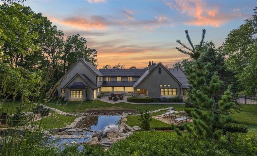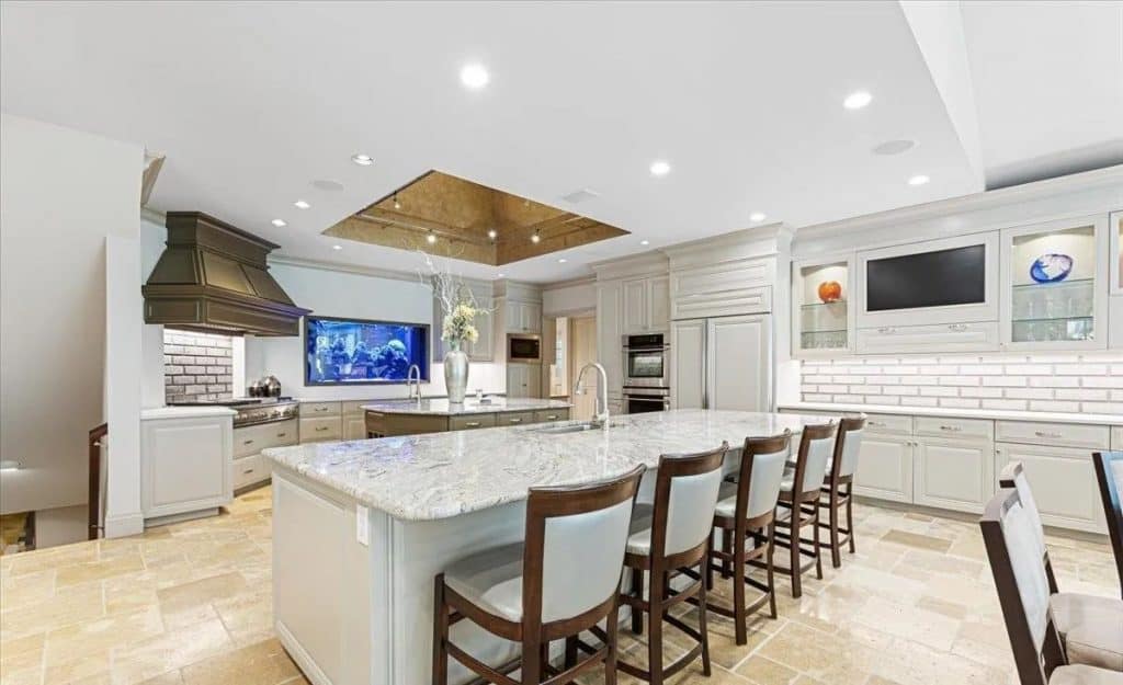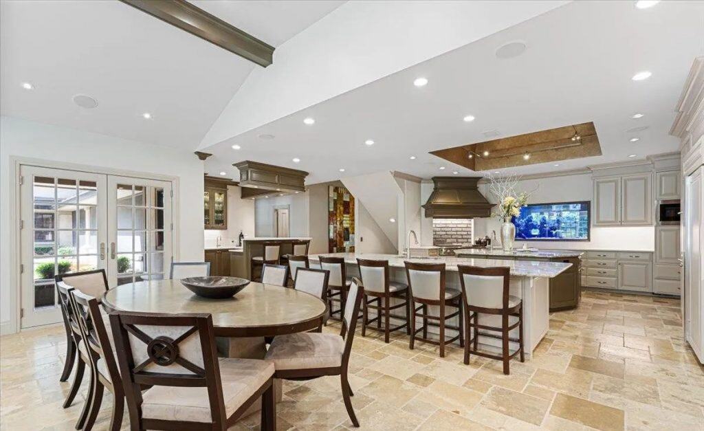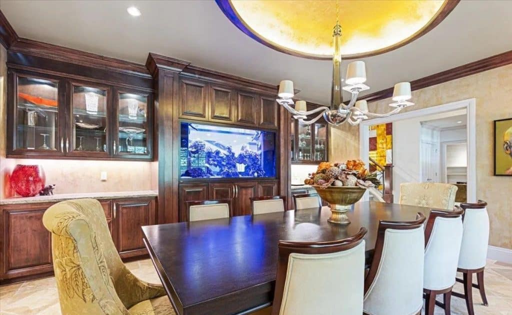The gourmet kitchen boasts a 6-burner gas range, double oven, and a double-sided aquarium that connects to the dining room. It also includes a prep area, a bar equipped with a wine fridge and ice maker, and a spacious family room featuring a fireplace. On the main level, there is a formal living room with a double-sided fireplace that links to a two-story office and an upper library. Enjoy a covered patio complete with a built-in grill and heaters, a screened-in porch, and a tranquil waterfall feature. The basement features a wine room, a sunken bar, a theater, an arcade, a gym equipped with a steam shower and sauna, along with ample storage space.