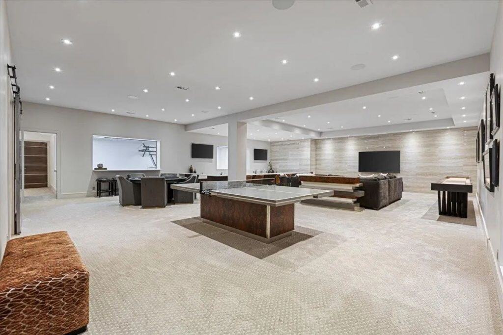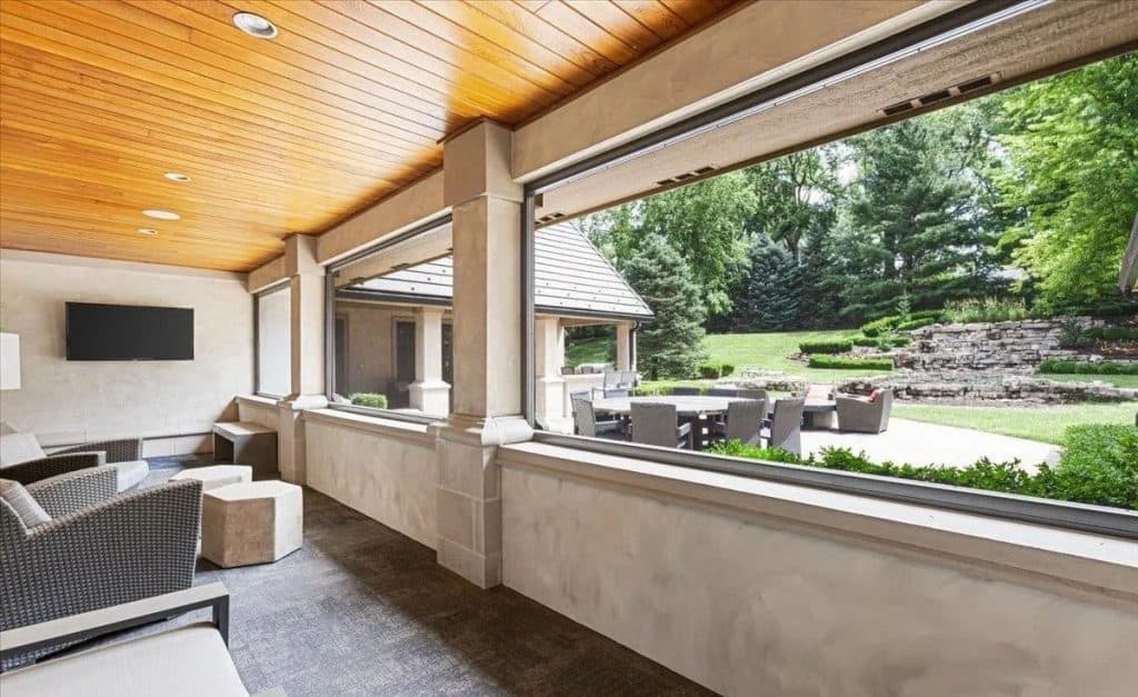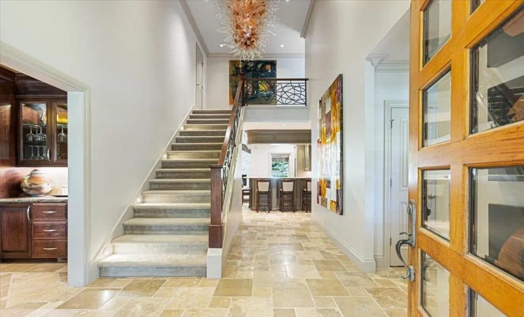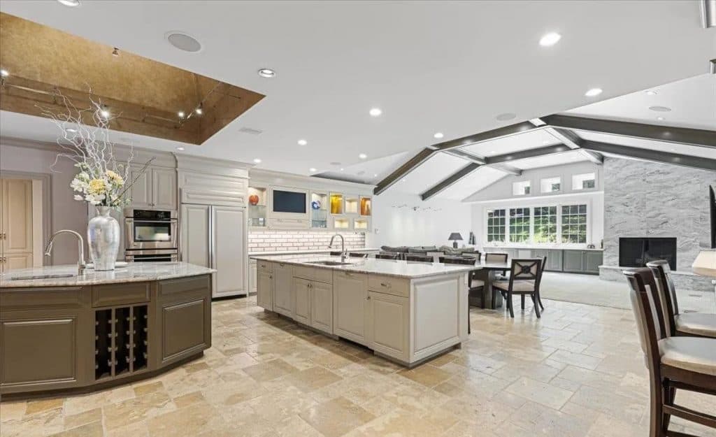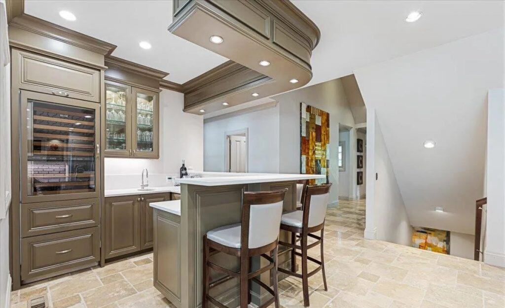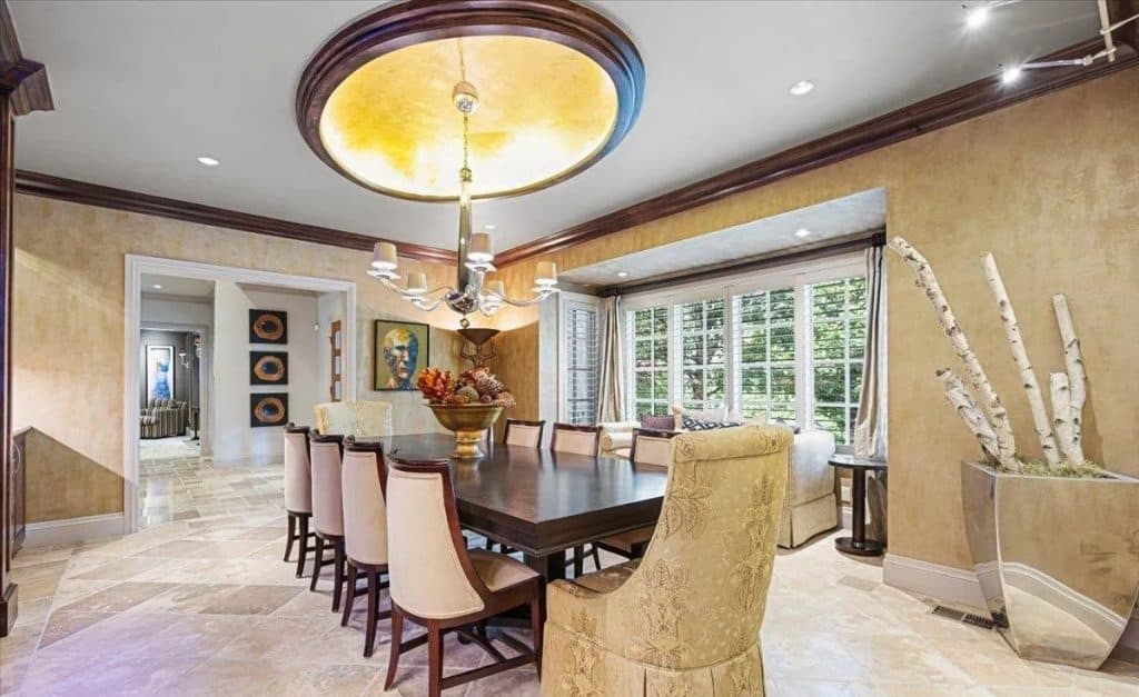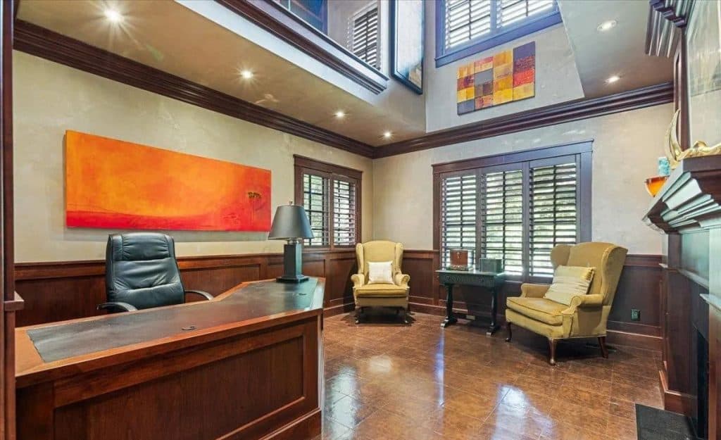 The gourmet kitchen boasts a 6-burner gas range, double oven, and a double-sided aquarium that connects to the dining room. It also includes a prep area, a bar equipped with a wine fridge and ice maker, and a spacious family room featuring a fireplace. On the main level, there is a formal living room with a double-sided fireplace that links to a two-story office and an upper library. Enjoy a covered patio complete with a built-in grill and heaters, a screened-in porch, and a tranquil waterfall feature. The basement features a wine room, a sunken bar, a theater, an arcade, a gym equipped with a steam shower and sauna, along with ample storage space.