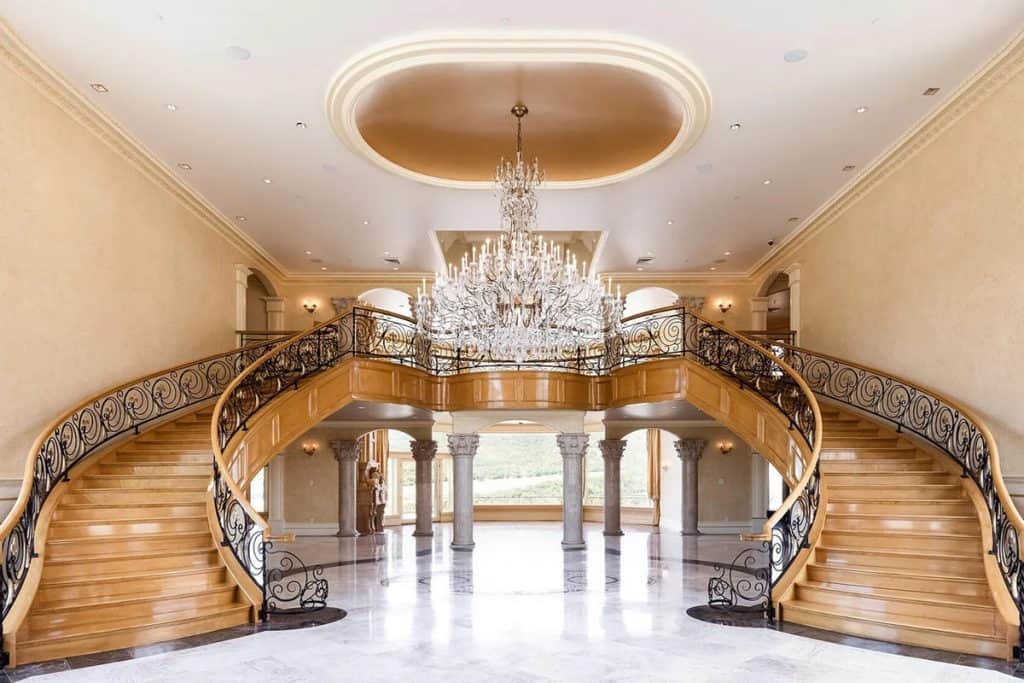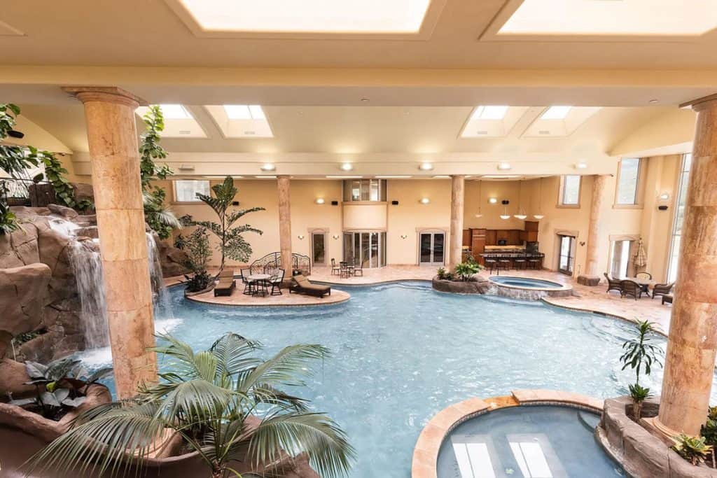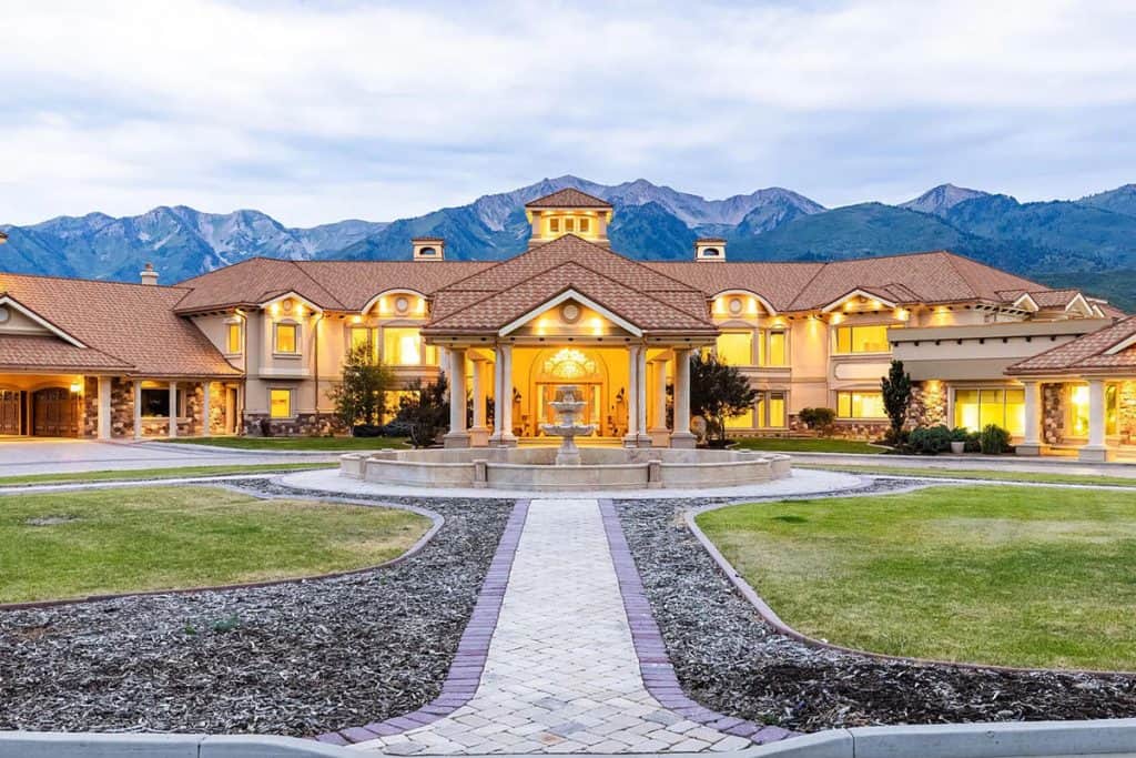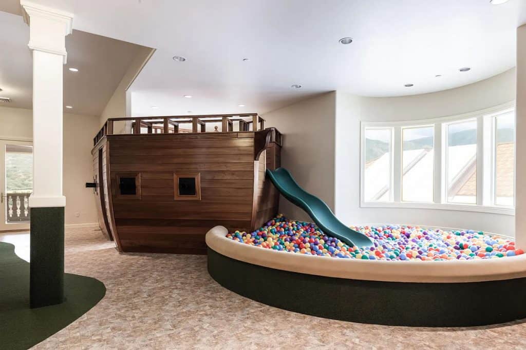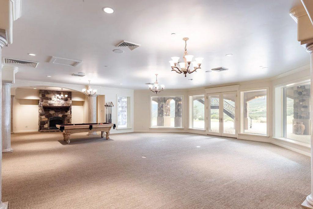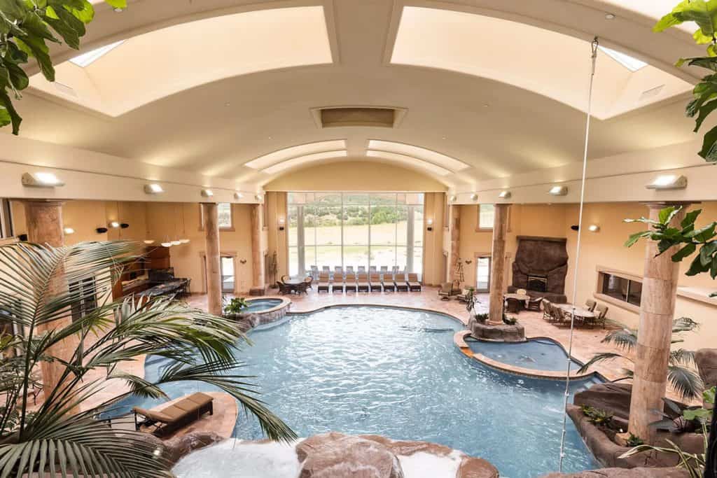 The impressive size of the home and the exceptional quality of its finishes are as captivating as the scenery. As you step through the front door, you’re greeted by a grand entryway featuring soaring ceilings over 20 feet high, a stunning chandelier, and graceful dual staircases. This property features an incredible resort-style swimming pool complete with a waterslide, waterfall, lazy river, rope swing, hot tub, a dedicated children’s area, and a kitchen. You’ll also find a basketball court, a two-lane bowling alley, a theater room with 27 seats, a sauna, a fitness room, a game room, and a children’s playroom designed like a pirate ship with a slide. Spanning 156 acres, this property is perfect for a primary residence, a vacation getaway, or a corporate retreat, and it’s also well-suited for horse enthusiasts.