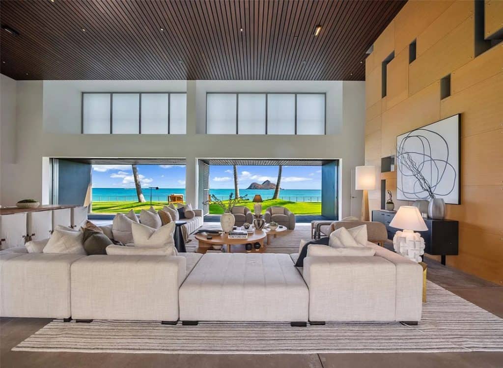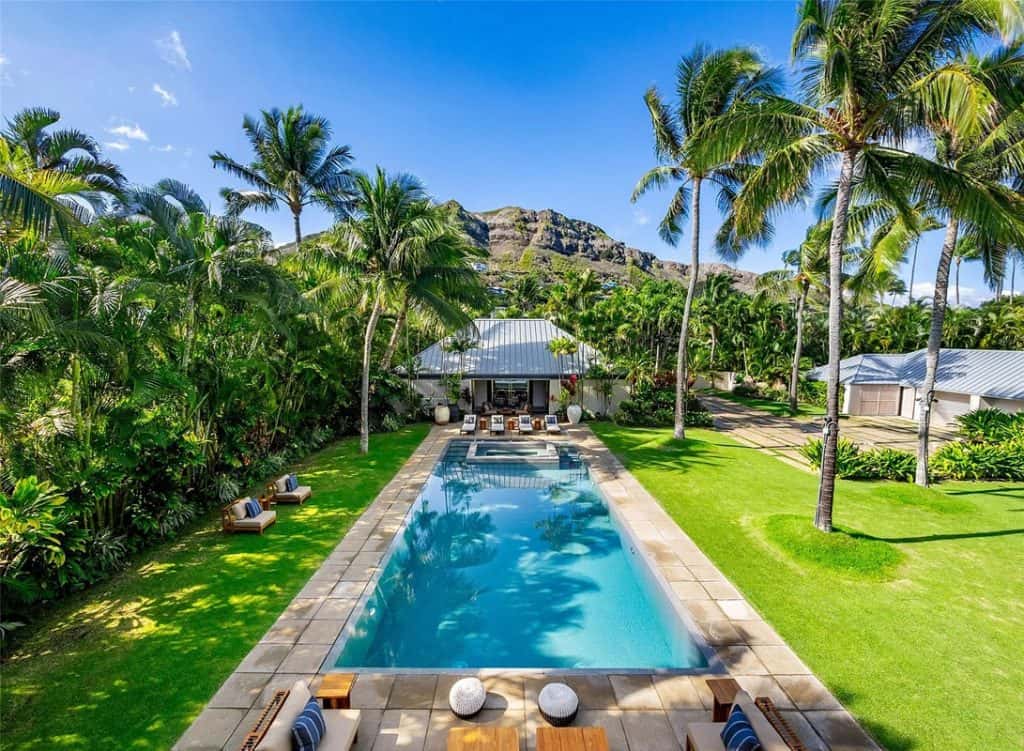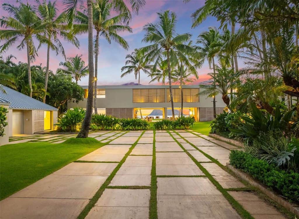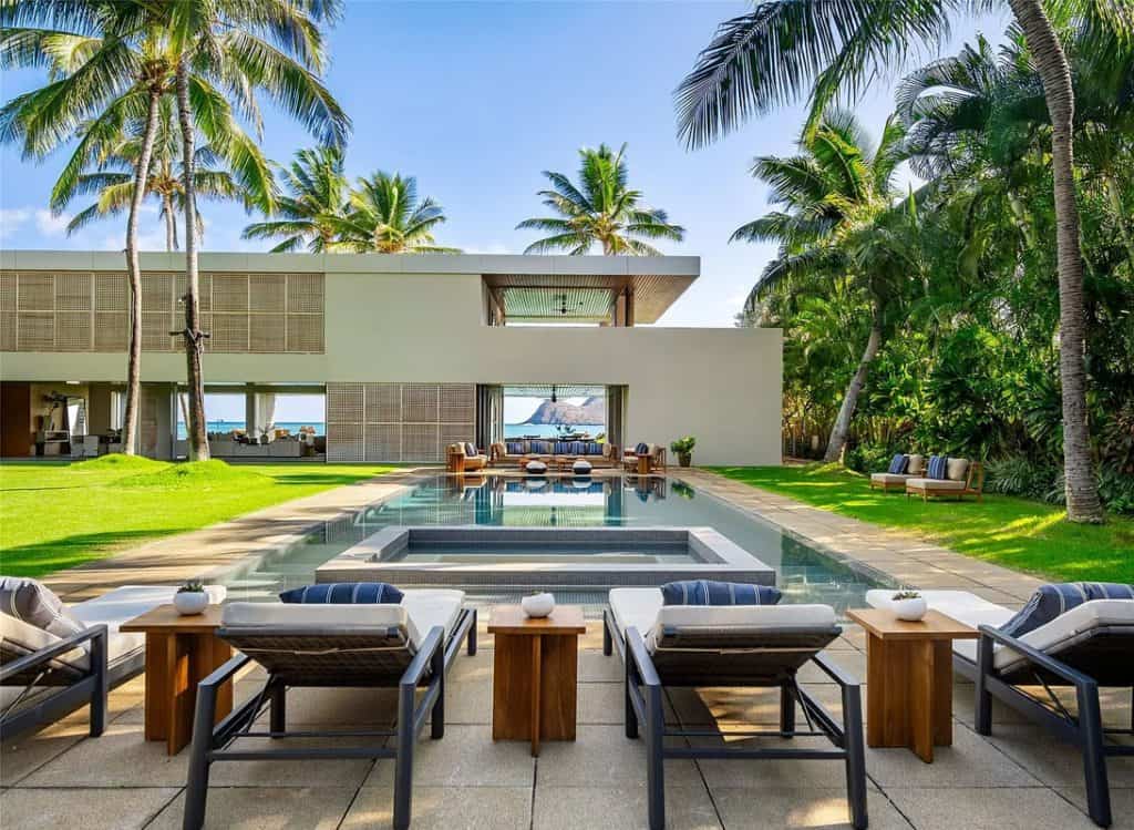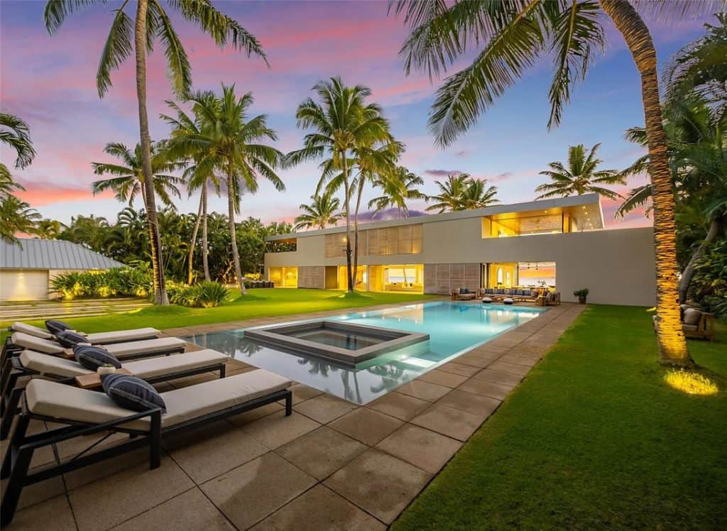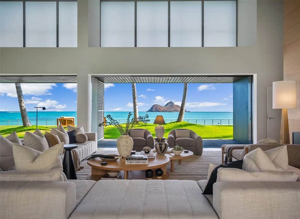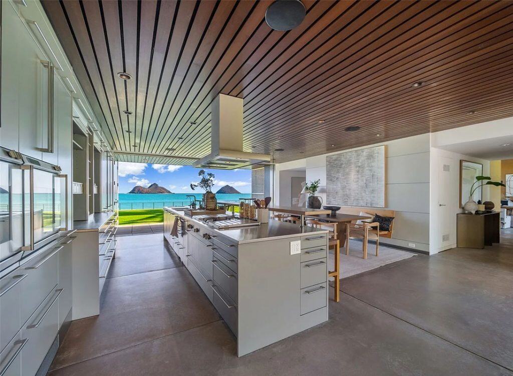 The Mokulua Estate is a stunning oceanfront retreat located in the esteemed Lanikai neighborhood. This remarkable property boasts unobstructed views of the Mokulua Islands from almost every angle. With over 150 linear feet of oceanfront and a private gated entrance, the estate offers the perfect combination of privacy, security, and a connection to its natural environment. Spanning more than 10,000 square feet of elegant indoor and outdoor living space, this cutting-edge residence features breathtaking ocean and mountain views throughout. A guest house and caretaker’s quarters provide plenty of space for family and friends. The backyard offers direct ocean access, encouraging an active island lifestyle, whether it’s swimming, snorkeling, kayaking, surfing, fishing, or simply unwinding by the pool in your own tropical haven.