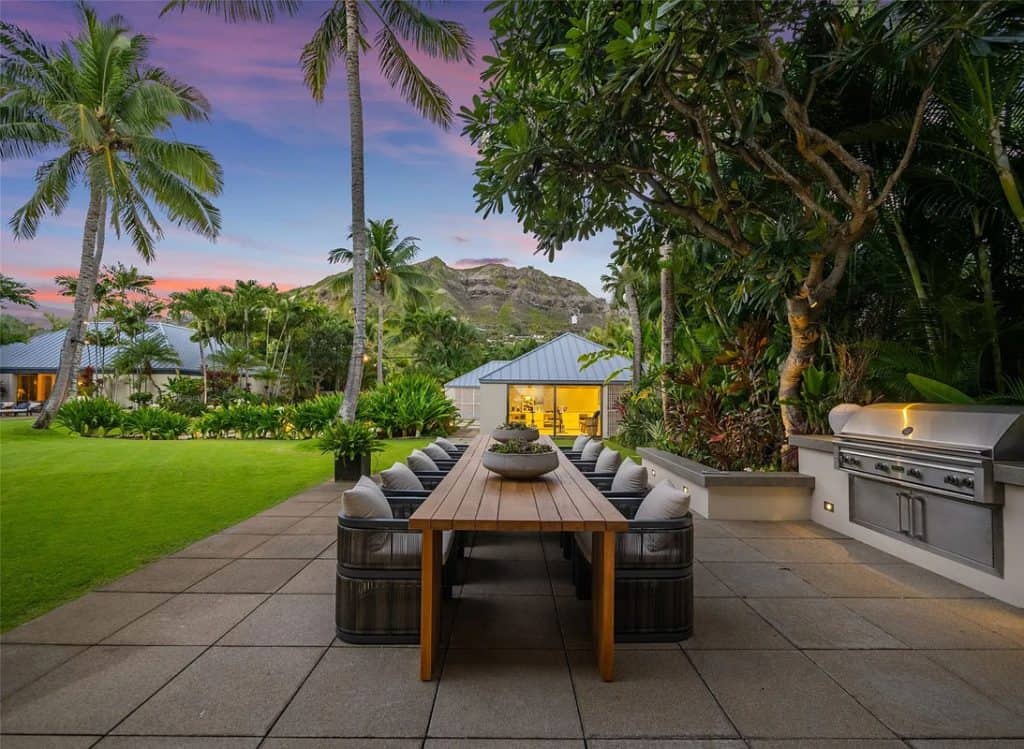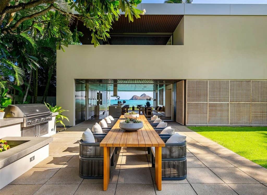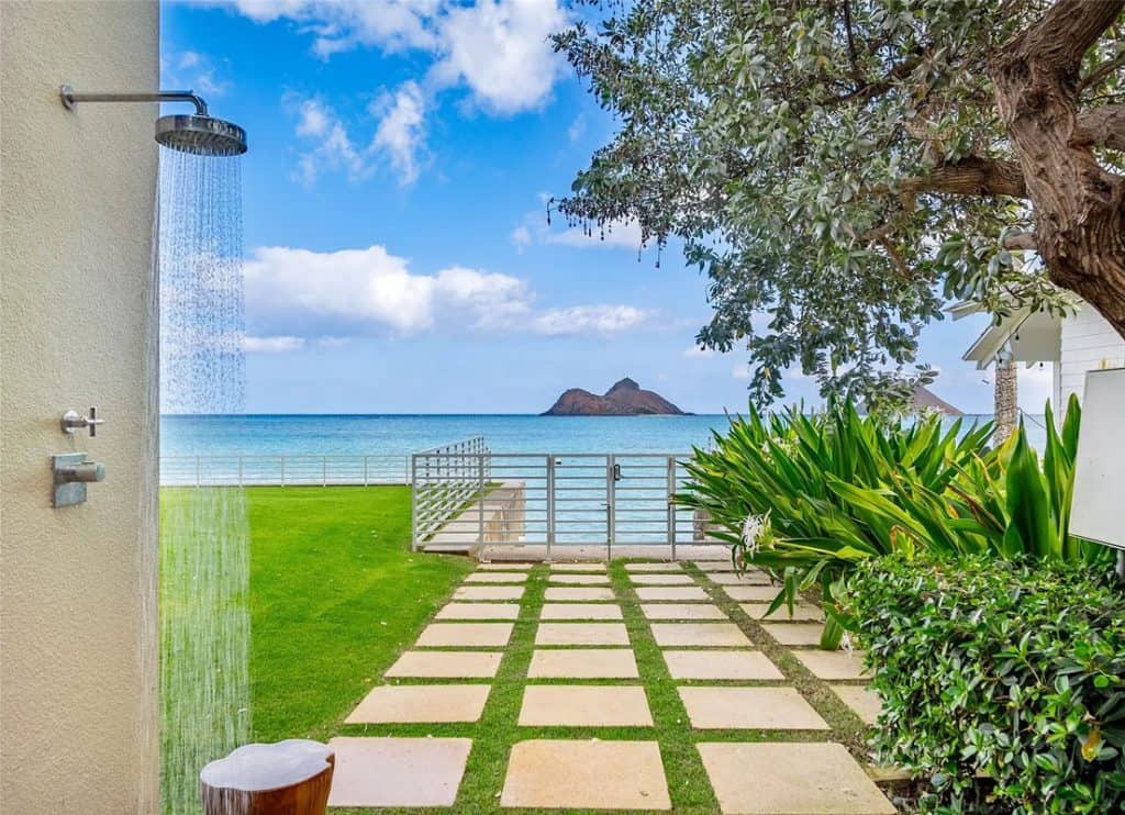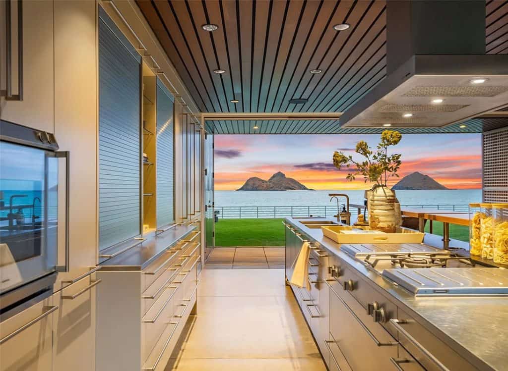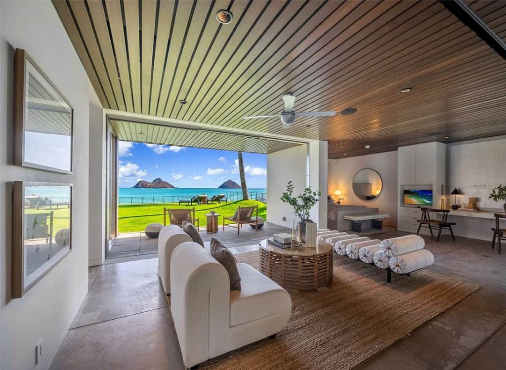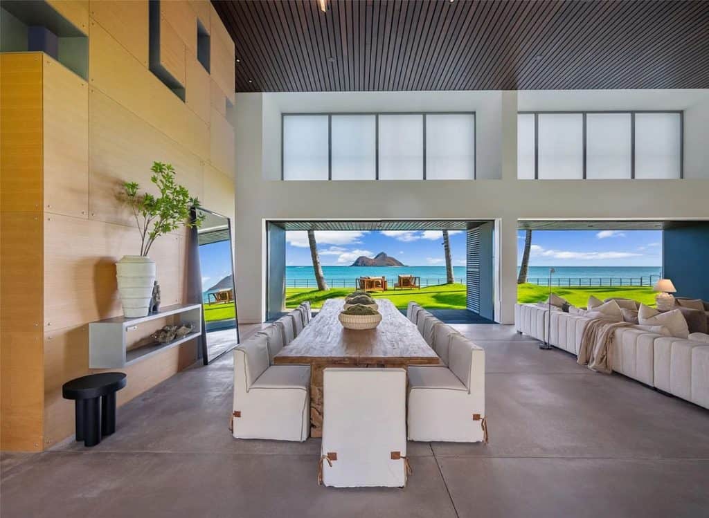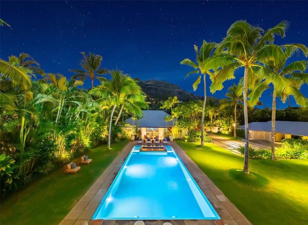 The Mokulua Estate is a stunning oceanfront retreat located in the esteemed Lanikai neighborhood. This remarkable property boasts unobstructed views of the Mokulua Islands from almost every angle. With over 150 linear feet of oceanfront and a private gated entrance, the estate offers the perfect combination of privacy, security, and a connection to its natural environment. Spanning more than 10,000 square feet of elegant indoor and outdoor living space, this cutting-edge residence features breathtaking ocean and mountain views throughout. A guest house and caretaker’s quarters provide plenty of space for family and friends. The backyard offers direct ocean access, encouraging an active island lifestyle, whether it’s swimming, snorkeling, kayaking, surfing, fishing, or simply unwinding by the pool in your own tropical haven.