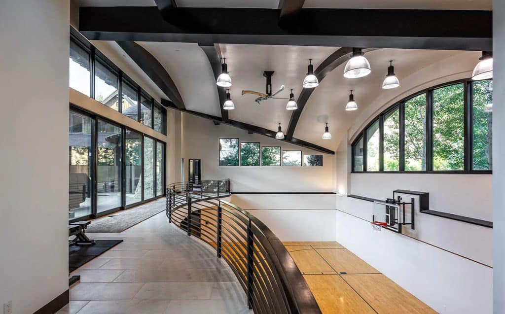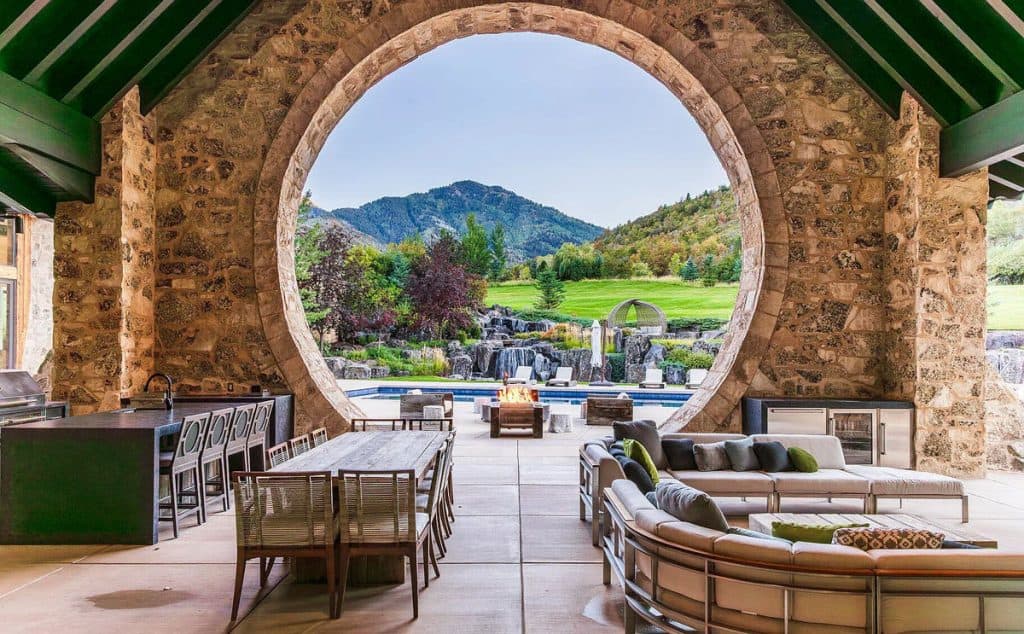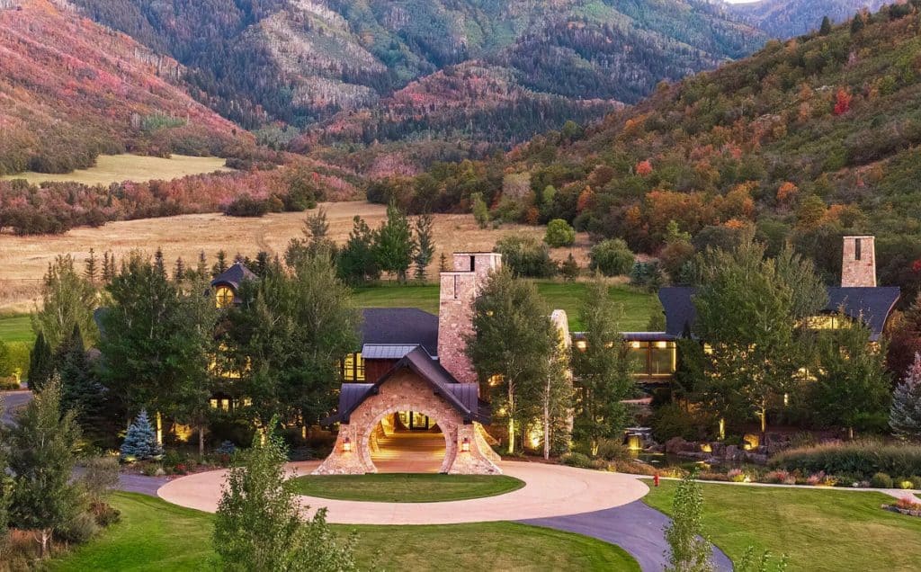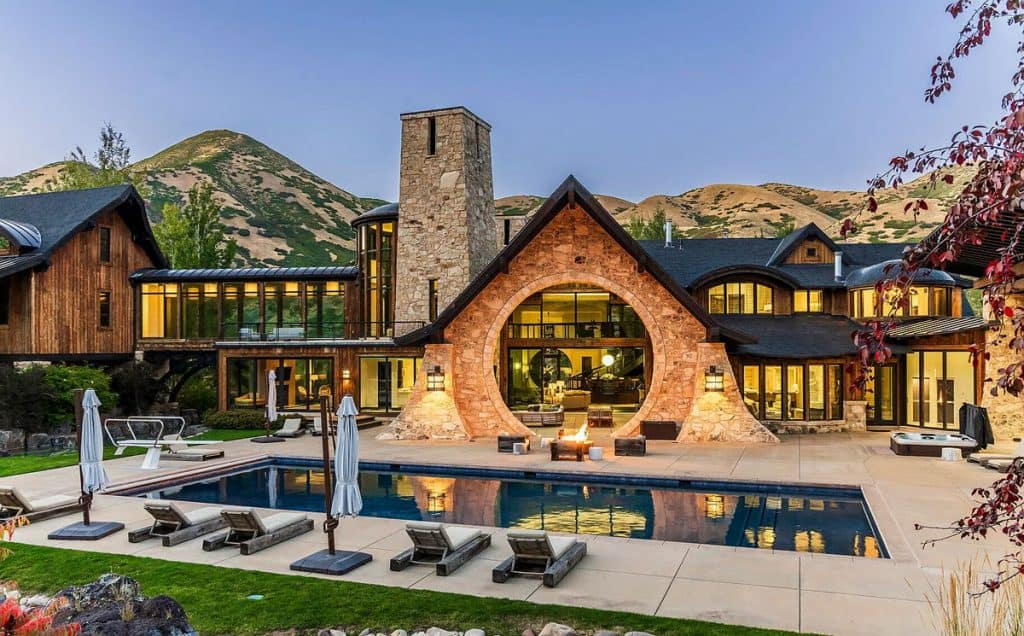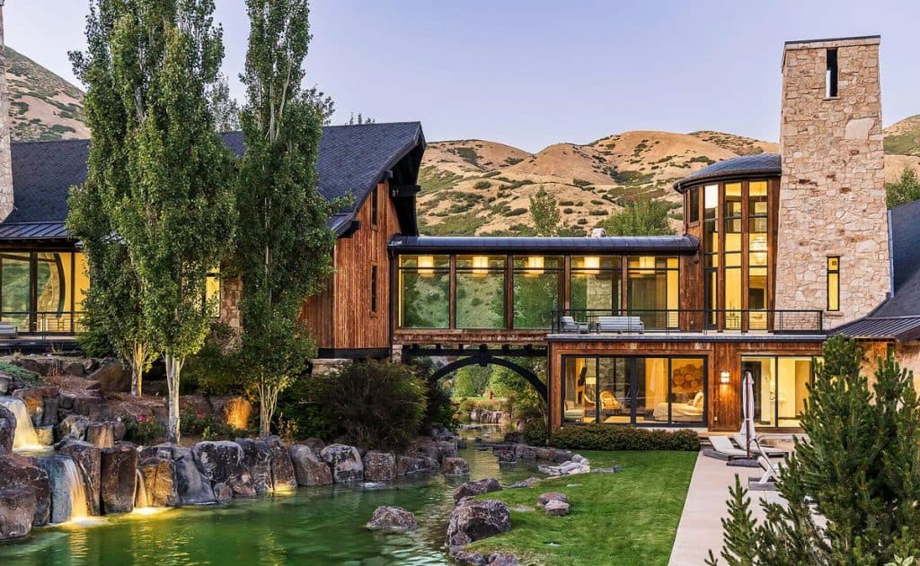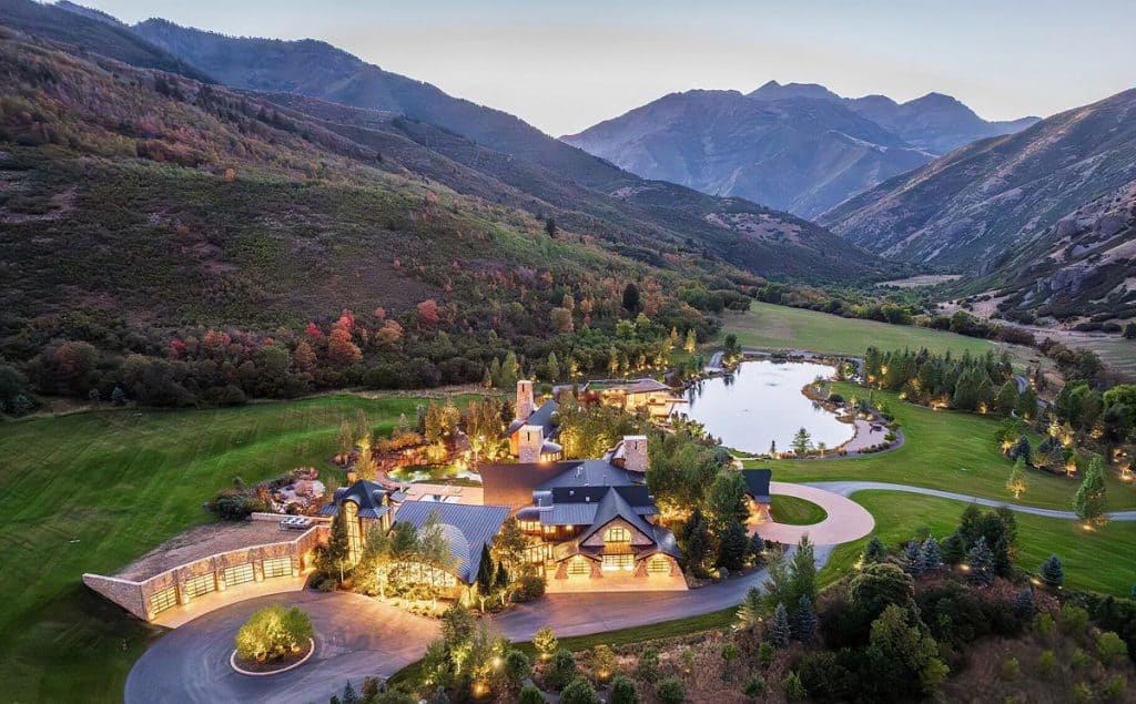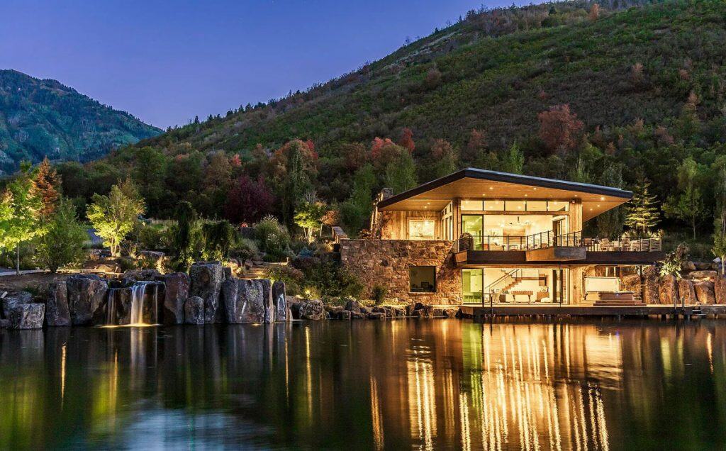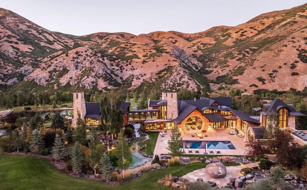 Situated on 30 acres in the tranquil South Fork of Provo Canyon, it offers a unique blend of privacy, grandeur, and artistic flair. The architecture harmoniously combines stones sourced from Utah with reclaimed barn wood and substantial timbers, imparting a classic mountain character to the home. Expansive glass walls provide breathtaking views in every direction. The amenities transform the estate into a private retreat: featuring indoor basketball and racquetball courts, a climbing wall over 50 feet tall, a golf simulator, a theater, a game lounge, a sauna, a hot tub, and an outdoor pool with natural stone diving features leading into a pond. The spacious two-bedroom lake house and pond enhance the experience with opportunities for paddleboarding, fishing, rope swings, and relaxing evenings by the water.