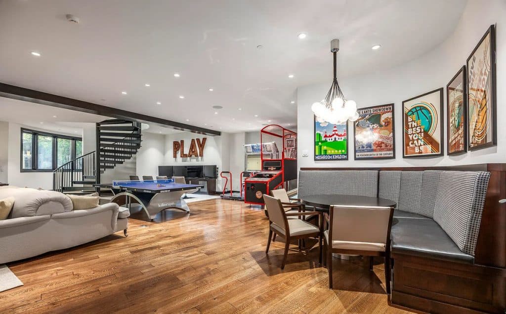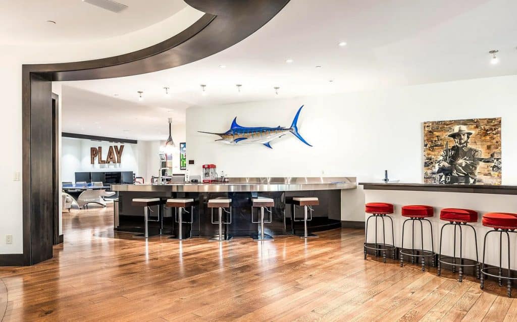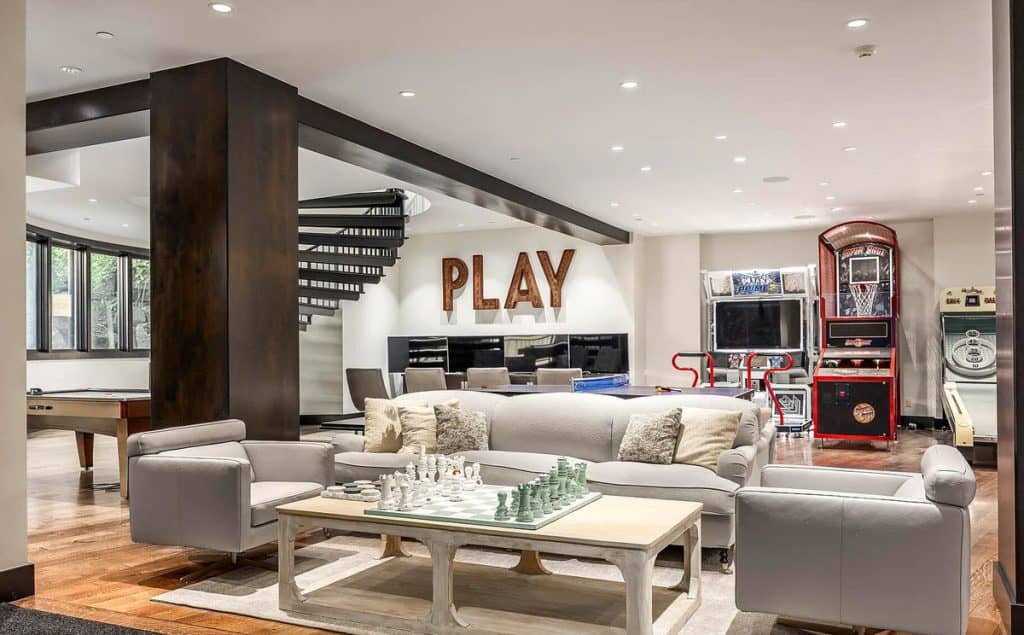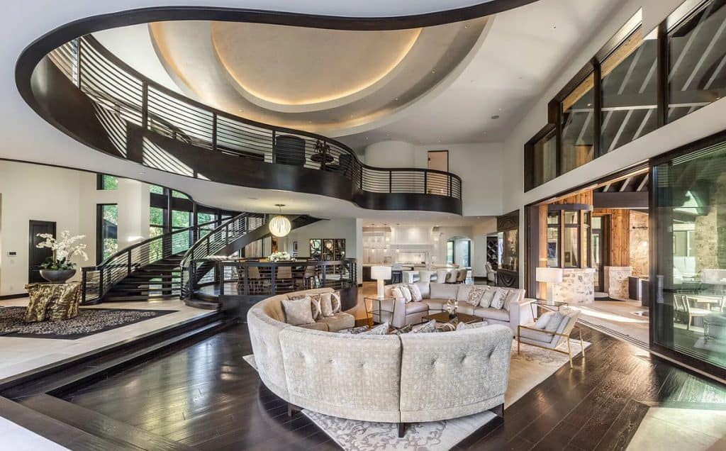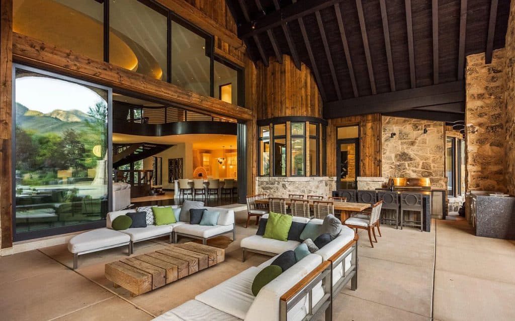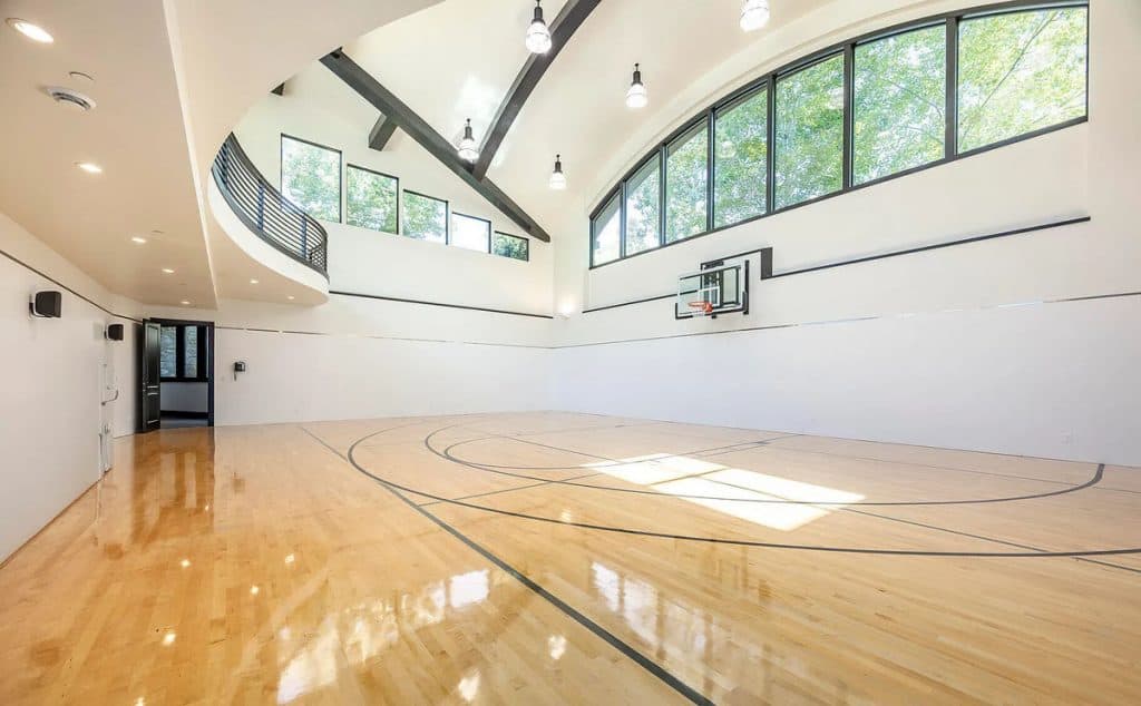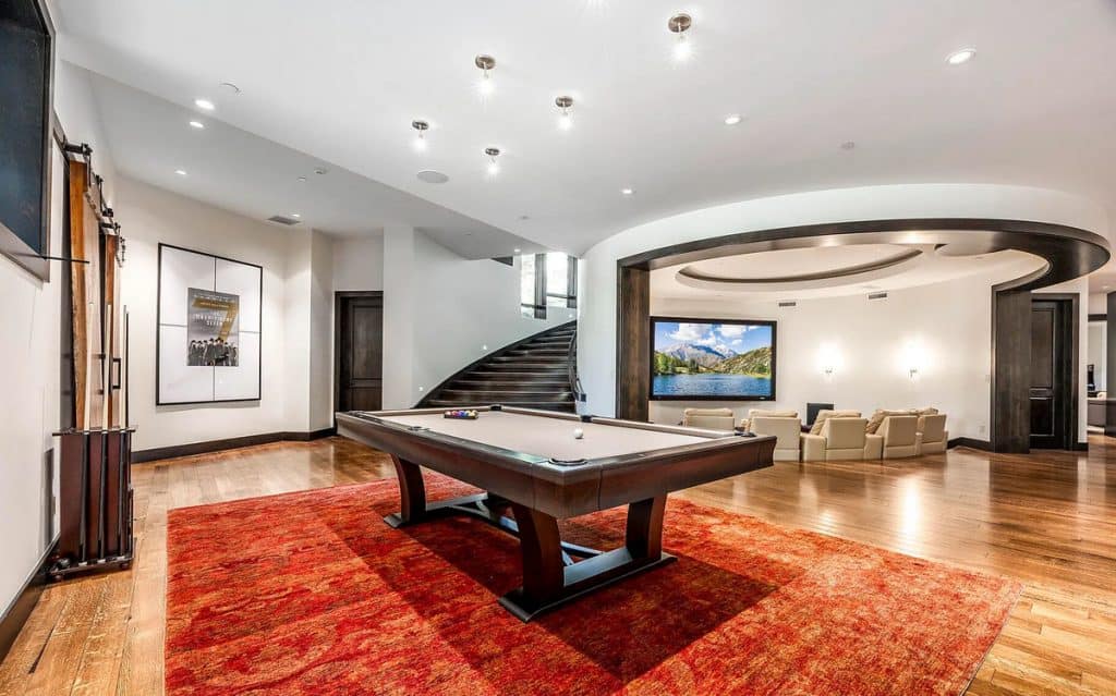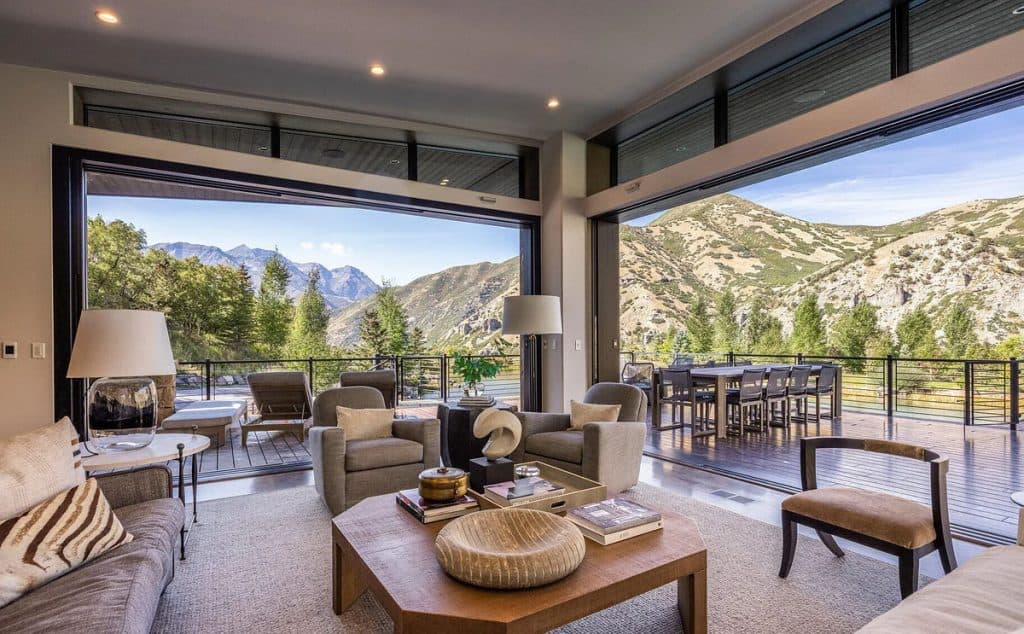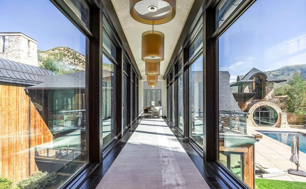 Situated on 30 acres in the tranquil South Fork of Provo Canyon, it offers a unique blend of privacy, grandeur, and artistic flair. The architecture harmoniously combines stones sourced from Utah with reclaimed barn wood and substantial timbers, imparting a classic mountain character to the home. Expansive glass walls provide breathtaking views in every direction. The amenities transform the estate into a private retreat: featuring indoor basketball and racquetball courts, a climbing wall over 50 feet tall, a golf simulator, a theater, a game lounge, a sauna, a hot tub, and an outdoor pool with natural stone diving features leading into a pond. The spacious two-bedroom lake house and pond enhance the experience with opportunities for paddleboarding, fishing, rope swings, and relaxing evenings by the water.
