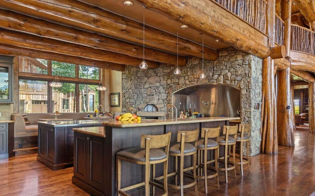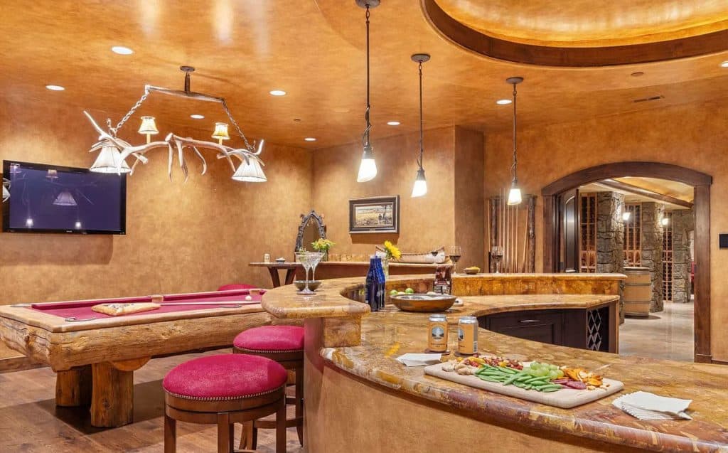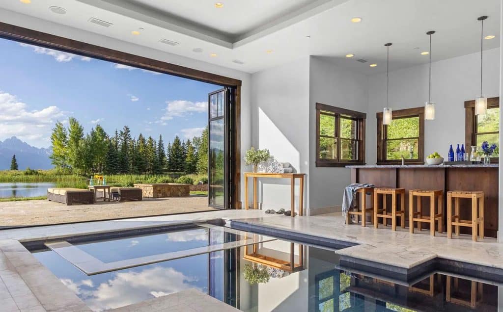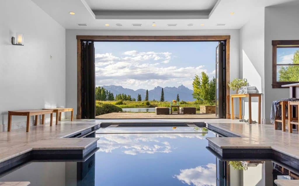 Riva Ridge Reserve is a stunning 117-acre haven located on East Gros Ventre Butte, offering breathtaking views of the Tetons, serene water features, and exceptional privacy—all just 15 minutes from Jackson. This remarkable estate boasts a 12,705 SF main lodge complete with an indoor pool, wine cellar, and theater; a studio connected by a tunnel that includes a garage; and a spacious 3,978 SF guesthouse with four bedrooms. A key feature of the Reserve’s design is the indoor pool and spa, which harmoniously combines wellness with architectural beauty. The walkout lower level includes a three-tiered home theater by Paradise Theater, a gym equipped with a sauna and steam room, a game room, and an 1,800-bottle wine cellar featuring a tasting area. A tunnel links the wine cellar to the nearby garage studio, which is equipped with dumbwaiter access.