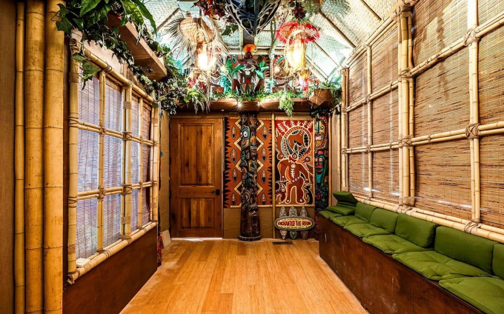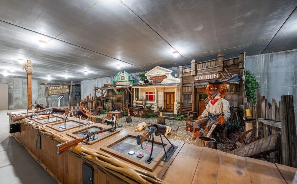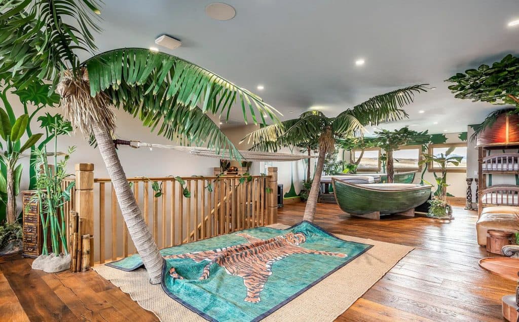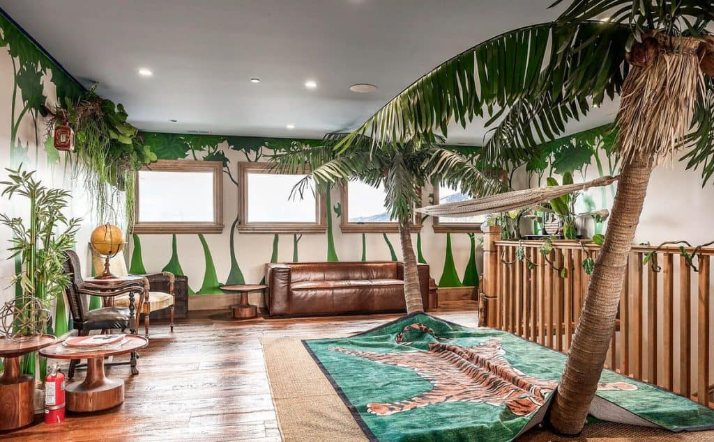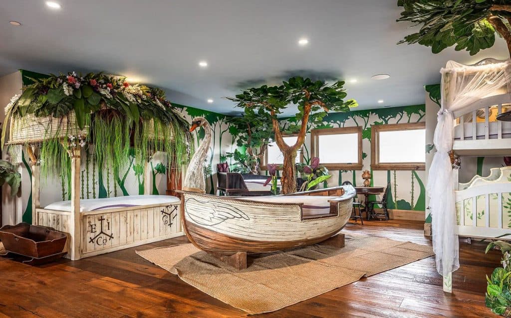 The main residence, which has five levels, covers 40,807 square feet and includes a magnificent primary suite along with seven more bedrooms, all featuring vaulted ceilings, walk-in closets, wet bars, and private bathrooms. Distinctive Disney-themed areas add a playful touch to the opulent design, such as bunkrooms inspired by Swiss Family Robinson and a replica of Disneyland’s Tiki Room. The pool barn, covering 27,080 square feet and reaching a height of 53 feet, is set to feature a swimming pool, a workout area, and a spacious event venue. A 2,266-square-foot tunnel, which brings to mind a scene from a Star Wars movie, provides a smooth connection between the main house and the pool barn. Other features include a guest house, a five-bay workshop, a well house, and a nearly finished large pond.