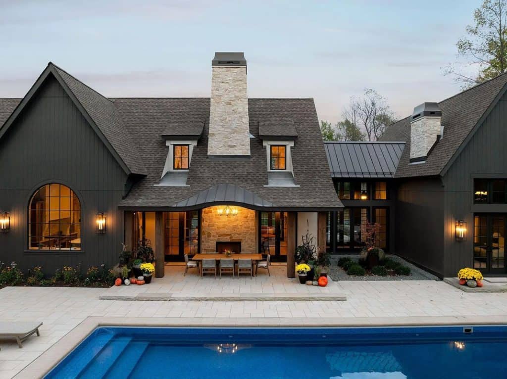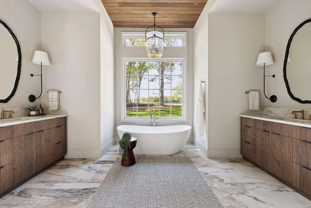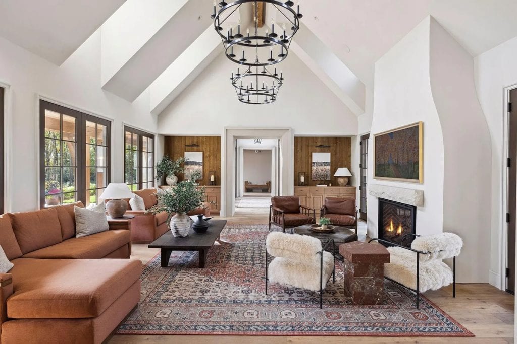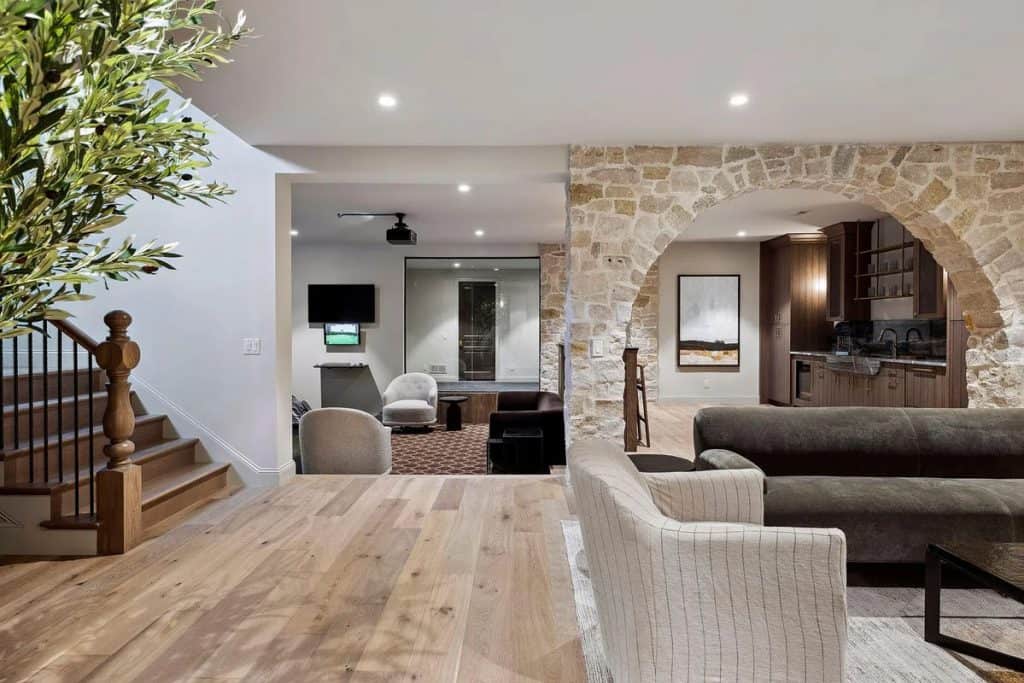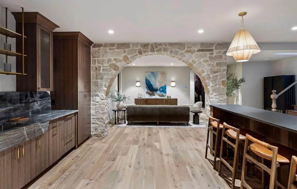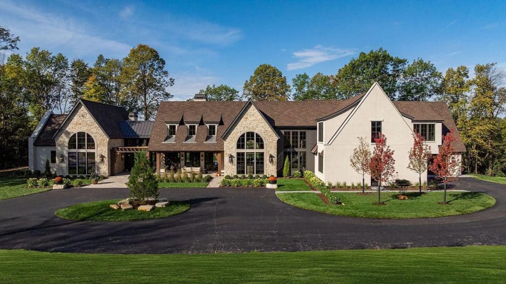Thoughtfully positioned on 20 wooded acres, the property provides stunning views of the undulating countryside. Enjoy natural elegance both indoors and outdoors, showcasing a harmonious mix of Ascona stone, stucco, Indiana limestone, Douglas Fir porch beams, White Oak flooring, wire-brushed paneling from Montana Timber, and richly textured plaster accents. The kitchen is genuinely the heart of the home, showcasing an oversized island adorned with Taj Mahal quartzite countertops and brass inlay accents, White Oak cabinetry, a farmhouse sink, a full-sized freezer and refrigerator, a double dishwasher, a Wolf range, and a stunning scullery nearby. The backyard serves as an oasis, boasting a covered porch ideal for al fresco dining with a gas fireplace, along with another vaulted porch that includes a wood-burning fireplace and a built-in grill. The lower level presents a lounge area, a bar with a ledge overlooking the simulator (which can easily transform into your big screen movie and gaming area), an exercise room, a sixth bedroom, and ample utility and storage rooms.