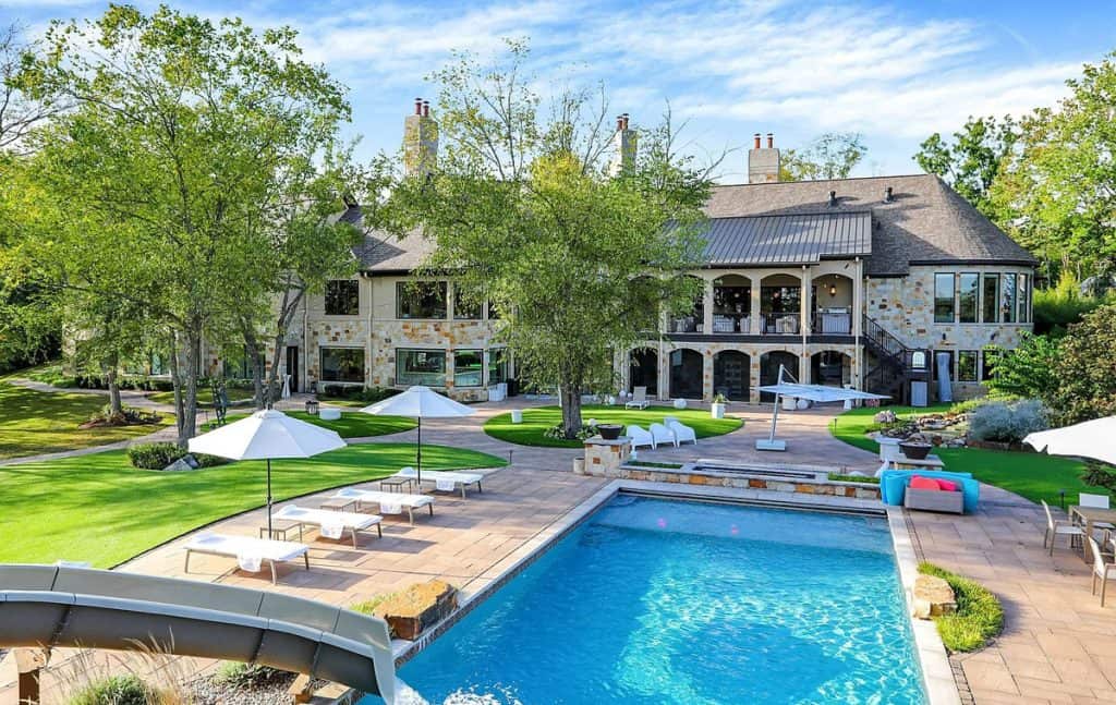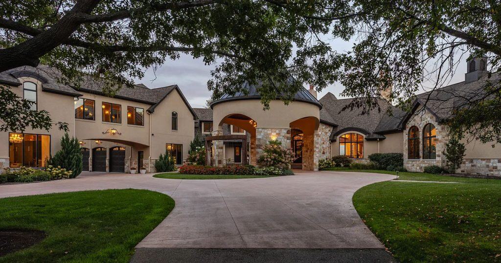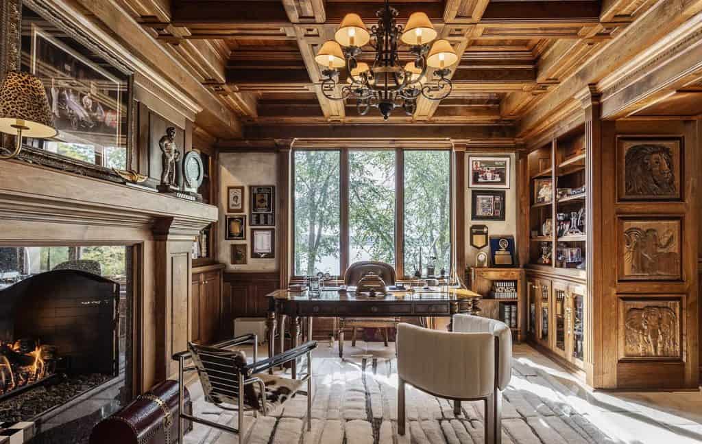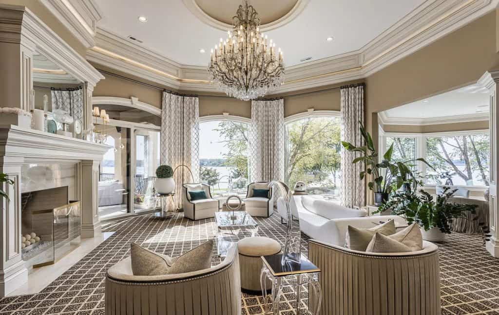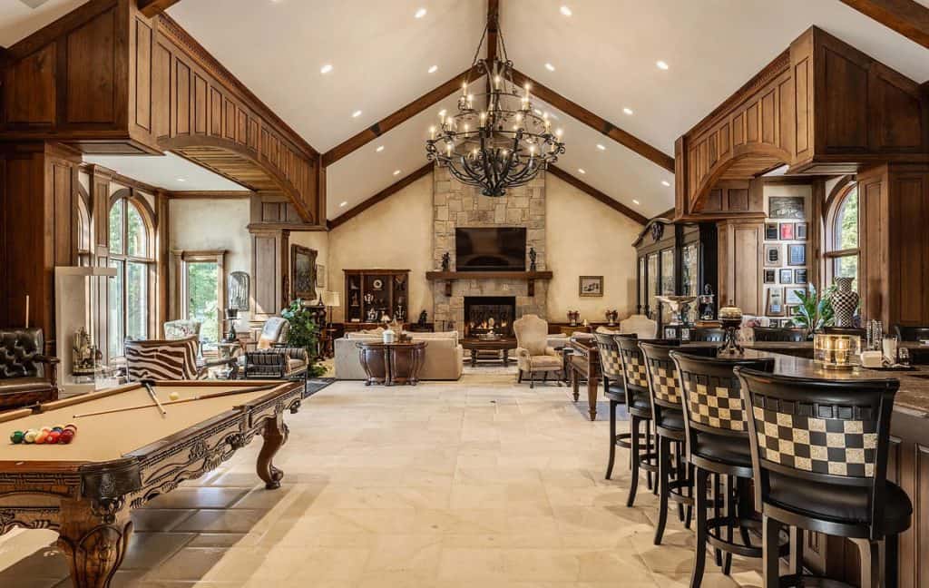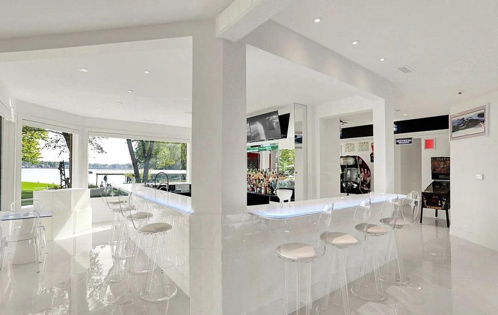 The main level reveals stunning views from every gathering area, including a cozy fireside study that opens up to the estate lounge complete with a bar, billiards area, and comfortable sitting rooms. The culinary area features two kitchens: a hidden caterer’s kitchen just steps from the main one, equipped with commercial-grade appliances, a 14′ island, and a smooth transition to a 38′ heated veranda that includes a grilling area, retractable screens, and expansive lake views. The walkout level designed like a resort boasts a 15-seat bar, a wine cellar with 700 bottles, a theater, an arcade, a billiards room, a fitness studio, 4 bedrooms, 5 bathrooms, and 4 exits to the outside. The outdoor area showcases a 50-foot gunite pool complete with a slide, a jacuzzi, waterfalls, fire features, several patios, a play cottage for children equipped with HVAC, and a 50-foot boat dock with three slips.